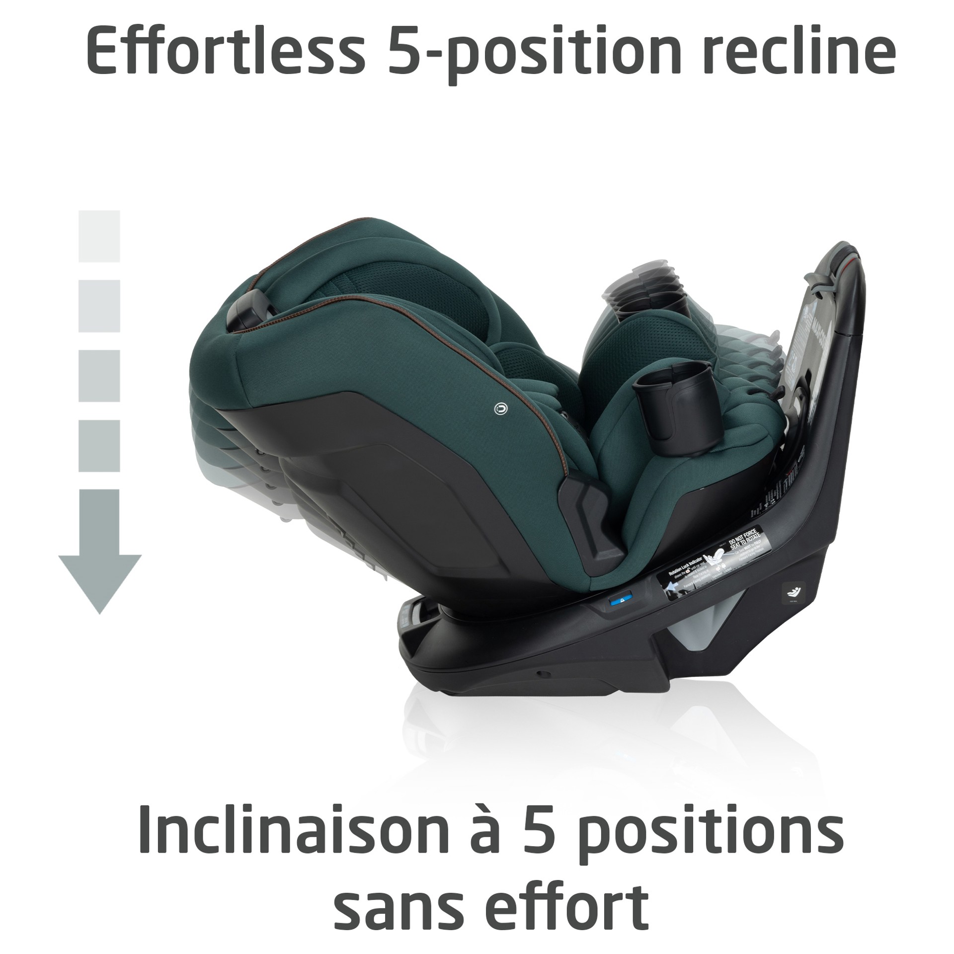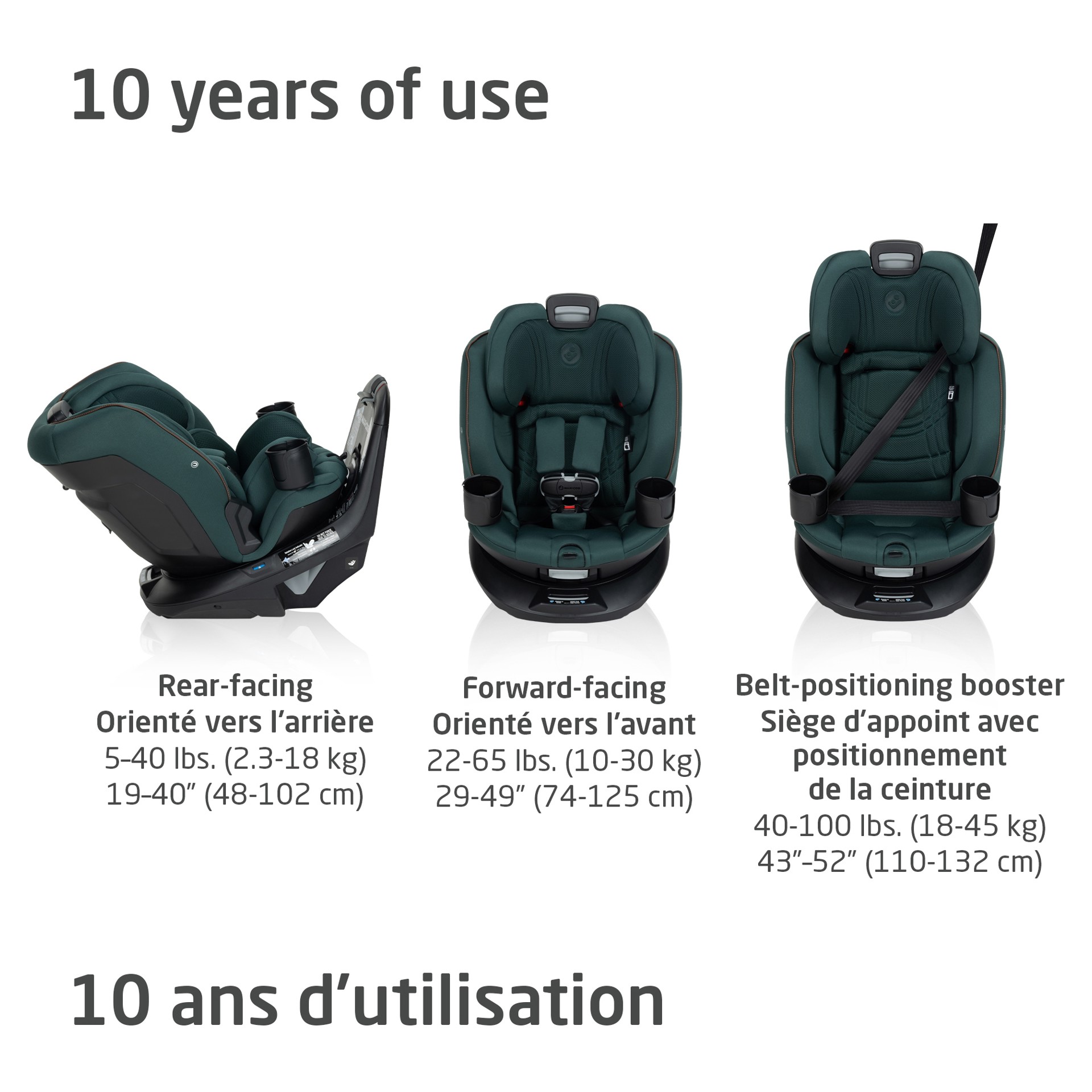 Un indicateur visuel de l'attache supérieure garantit une utilisation correcte, pour offrir une plus grande tranquillité d'esprit.L´Andi 360° est fait pour évoluer avec votre enfant au fur et à mesure qu'il grandit, de la naissance à dix ans. Voyagez en toute confiance dans les 3 modes : orienté vers l'arrière (5-40 lb, 19-40 po), orienté vers l'avant (22-65 lb, 34,4-49 po) et siège d'appoint avec positionnement de la ceinture (40-100 lb, 43,4-52 po).Conçue dans un souci de sécurité, sa conception tournante exceptionnelle répond ou dépasse toutes les normes de sécurité fédérales.