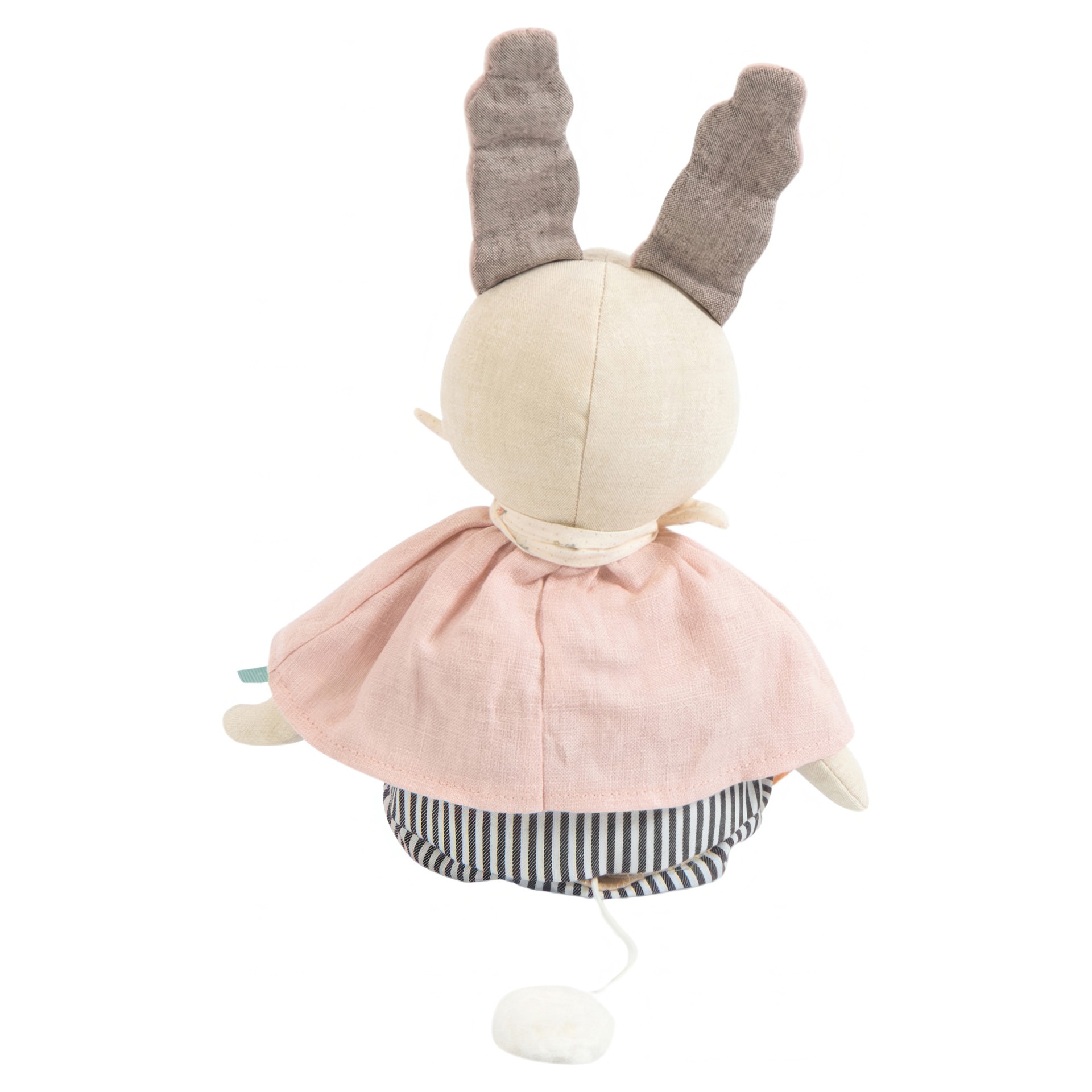 Poupée lapin fredonnant des airs japonais, en tissu chambray crème avec de grandes oreilles molletonnées.