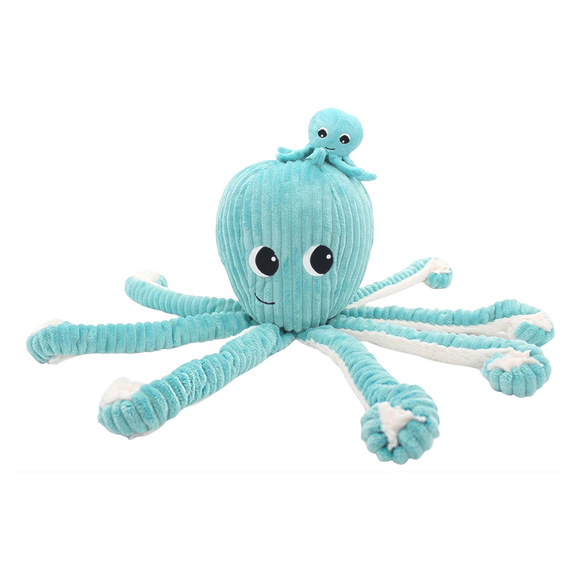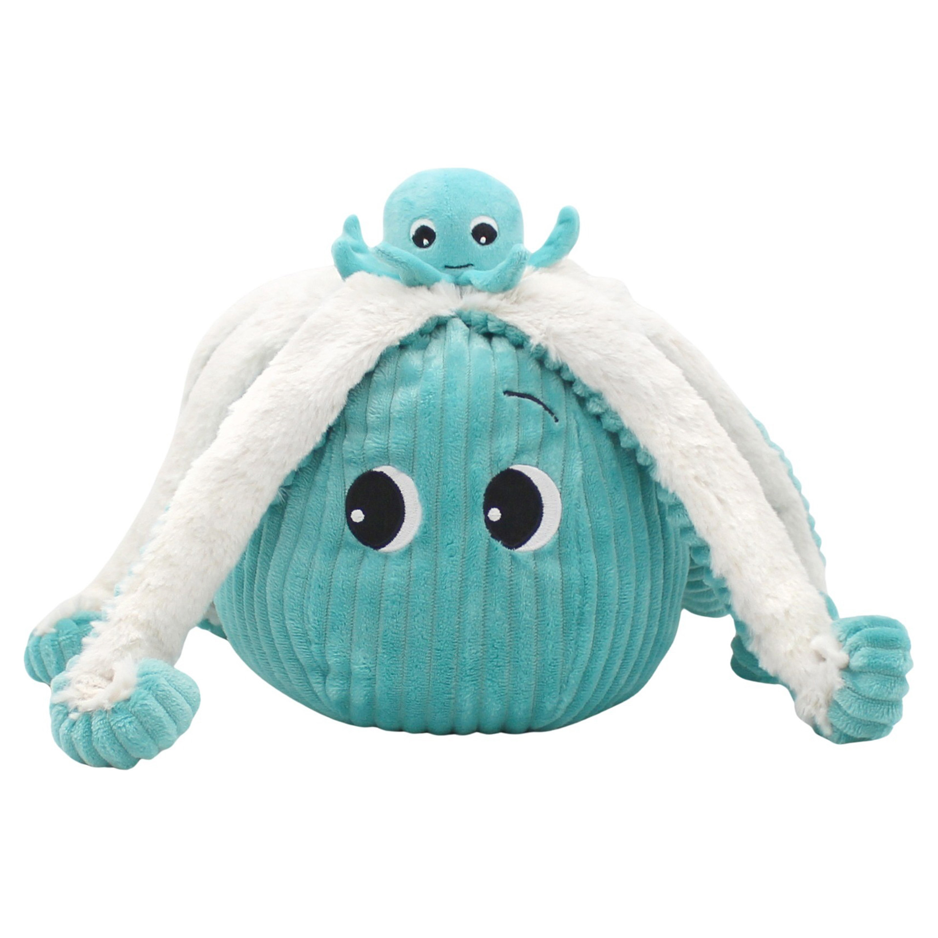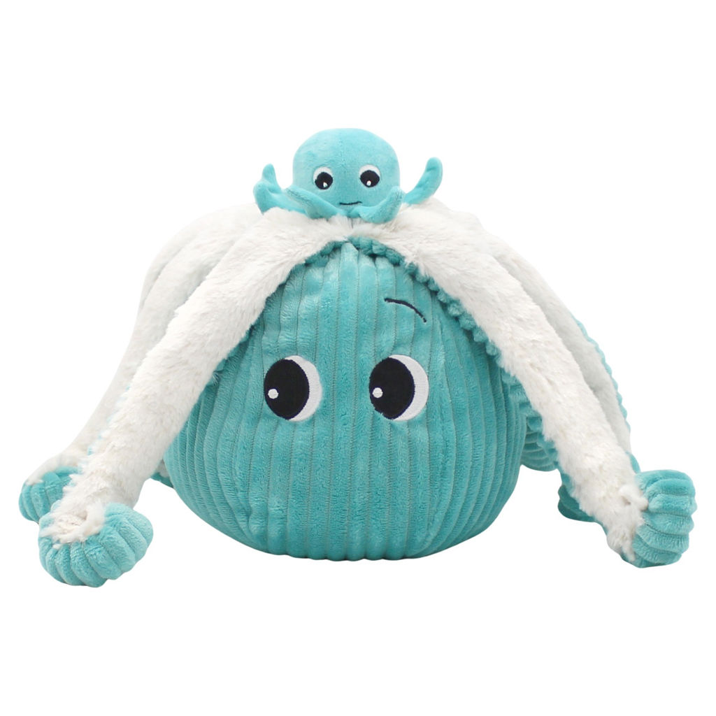 Regarde bien à l´intérieur, tu pourrais bien trouver 8 bras de plus pour les câlinous en cas de coup de mou! La peluche pieuvre maman et son bébé de 45 cm est de couleur bleue en velours côtelé et en soft.