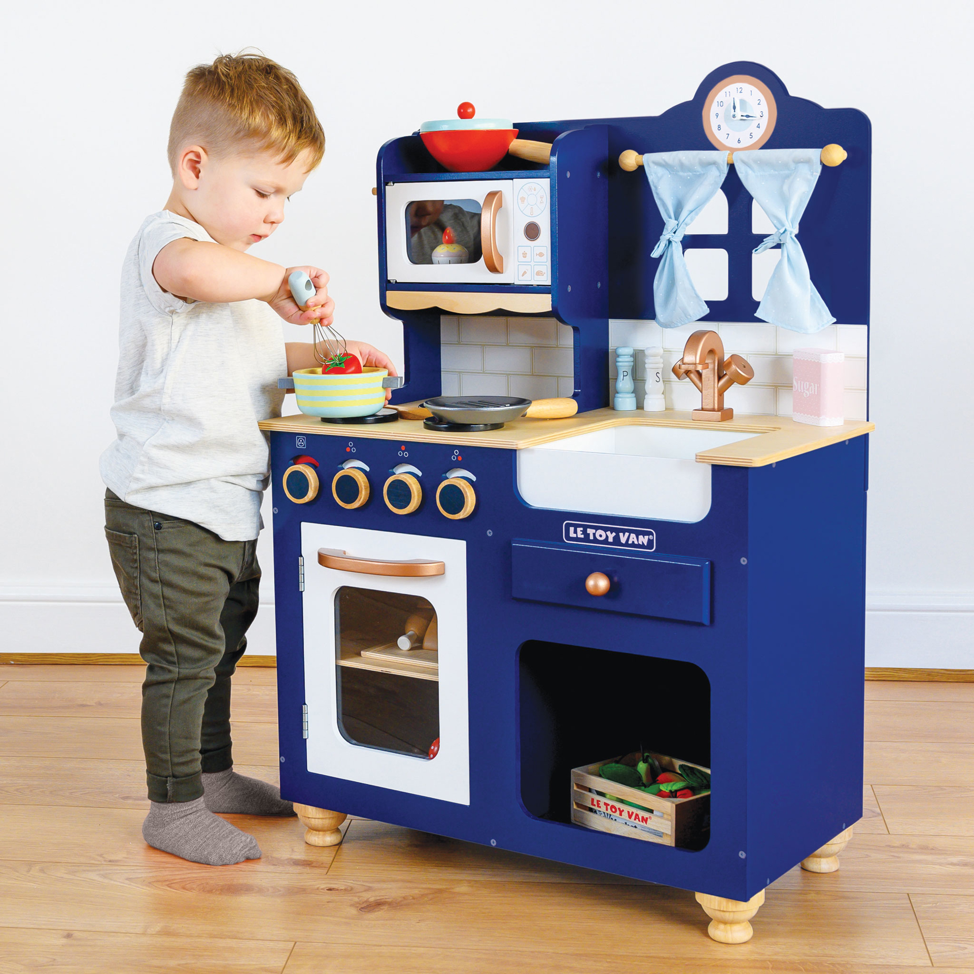 Les petits vont pouvoir préparer de bons petits plats pour leurs convives dès 3 ans grâce à cette jolie cuisine en bois couleur bleu roi, livrée avec ses 4 ustensiles de cuisine : un fouet, une cuillère, une salière et une poivrière. Cette cuisine tout équipée dispose d'un four avec un porte qui s'ouvre, d'une table de cuisson, d'un évier et d'un micro-ondes.