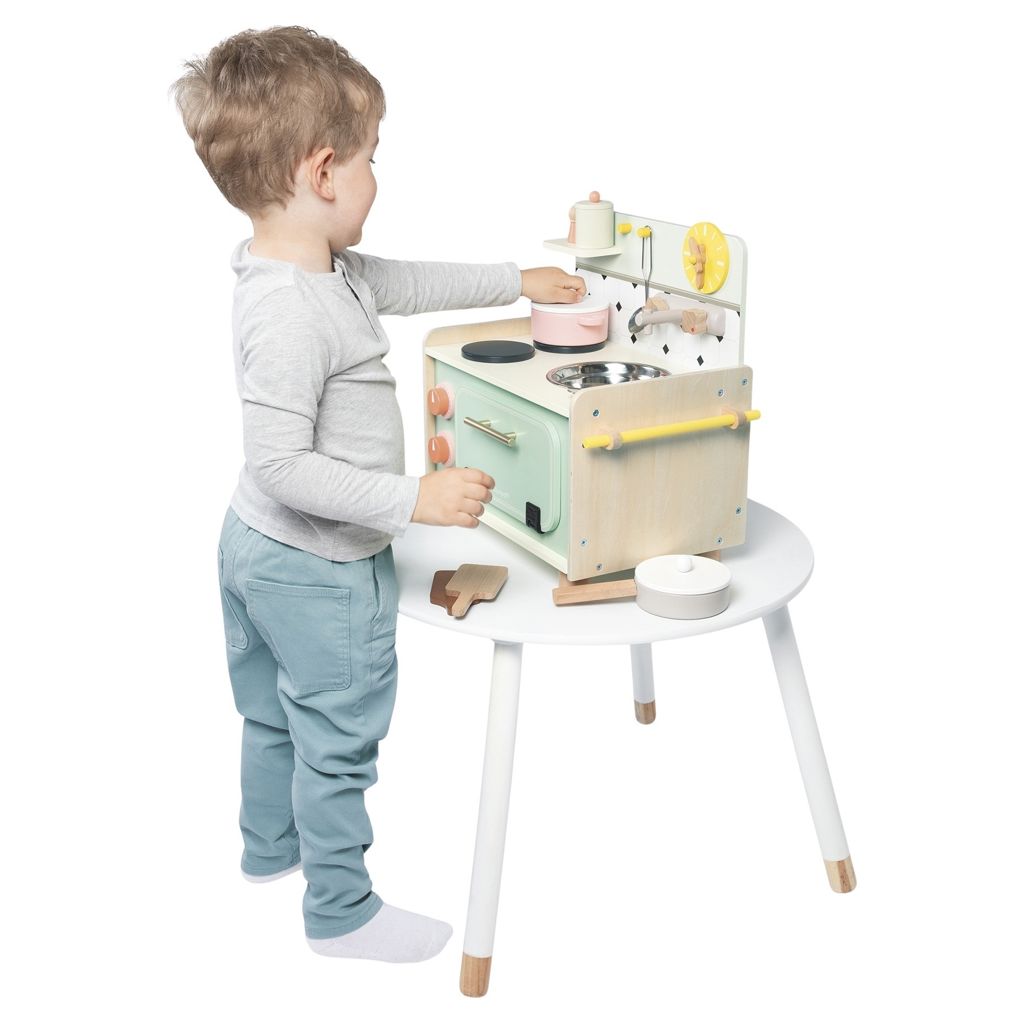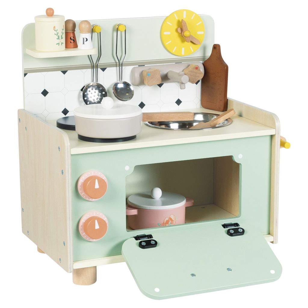 Jolie cuisinière en bois aux couleurs et aux illustrations douces. On s'imagine en petit chef dès 3 ans. Jouet idéal pour développer la confiance en soi et l'imagination !