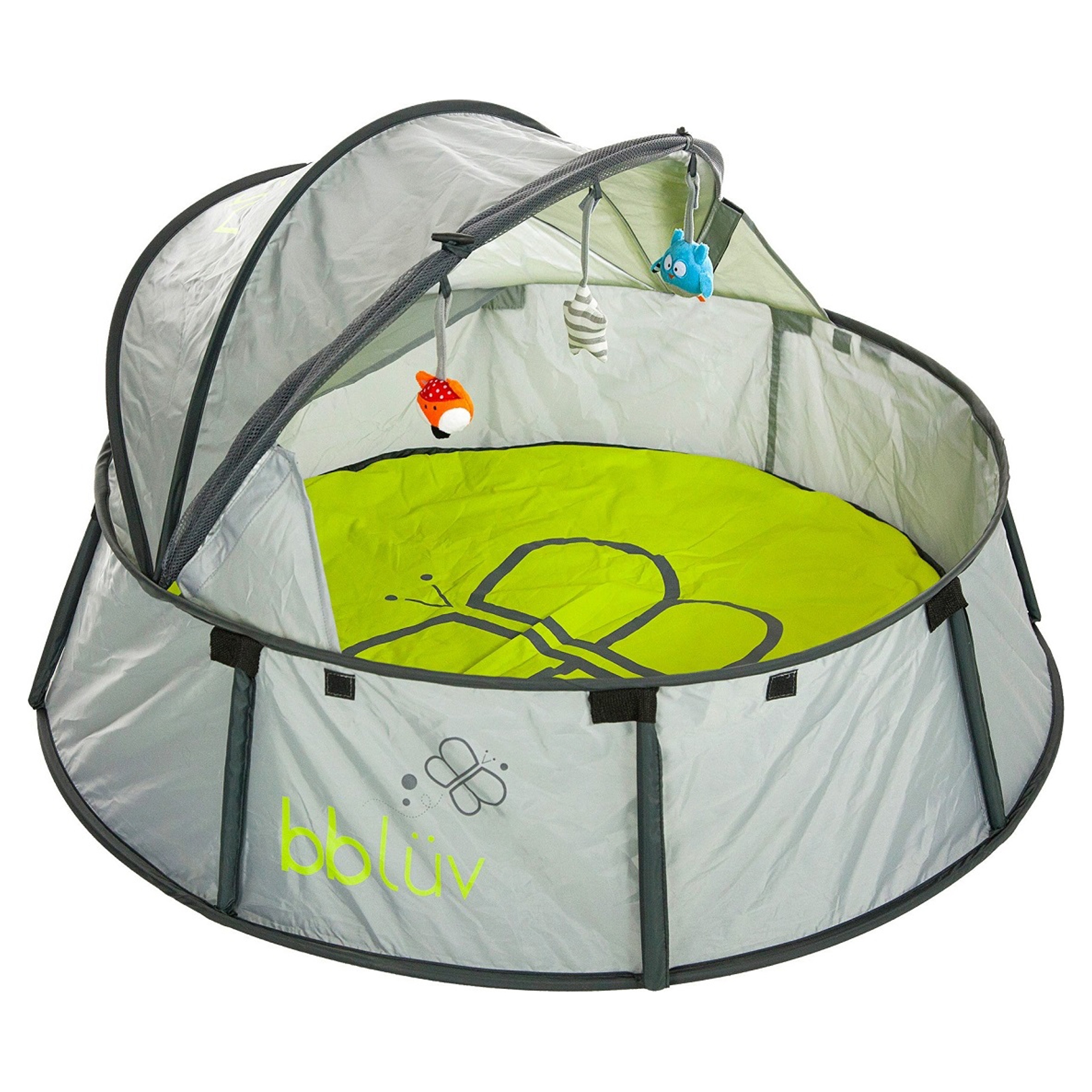 Le système de déploiement rend le montage facile et rapide. Équipé d'un tapis amovible et de 3 jouets faciles à nettoye. Comprend un auvent et un moustiquaire rétractables pour éloigner les moustiques.