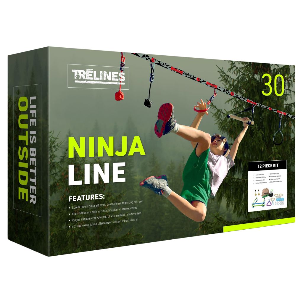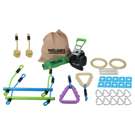 Comprend une ligne de résistante, 2 barres de singe, 2 prises d'arbre, 2 poings de singe, 2 anneaux de gymnastique, un couvercle à cliquet, 8 mousquetons delta et des clips de ligne (pour attacher les obstacles à la ligne), et un sac à cordon.