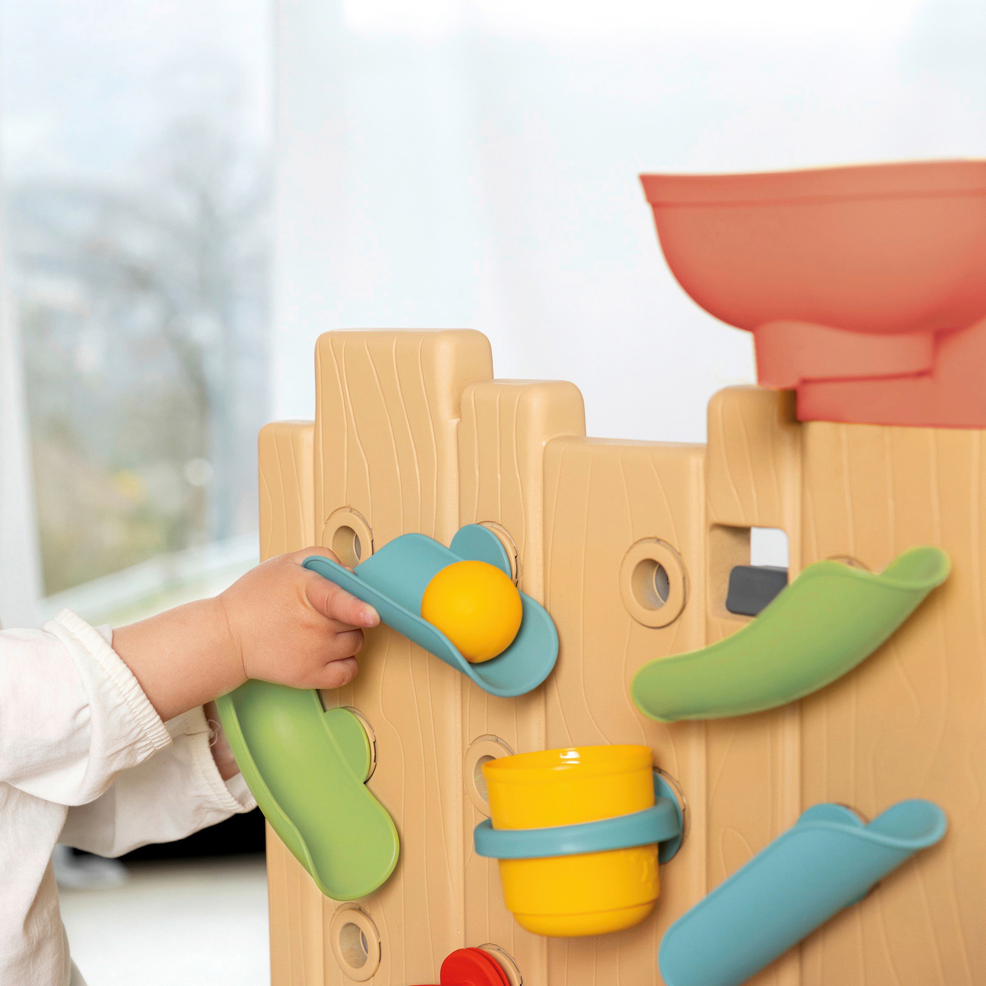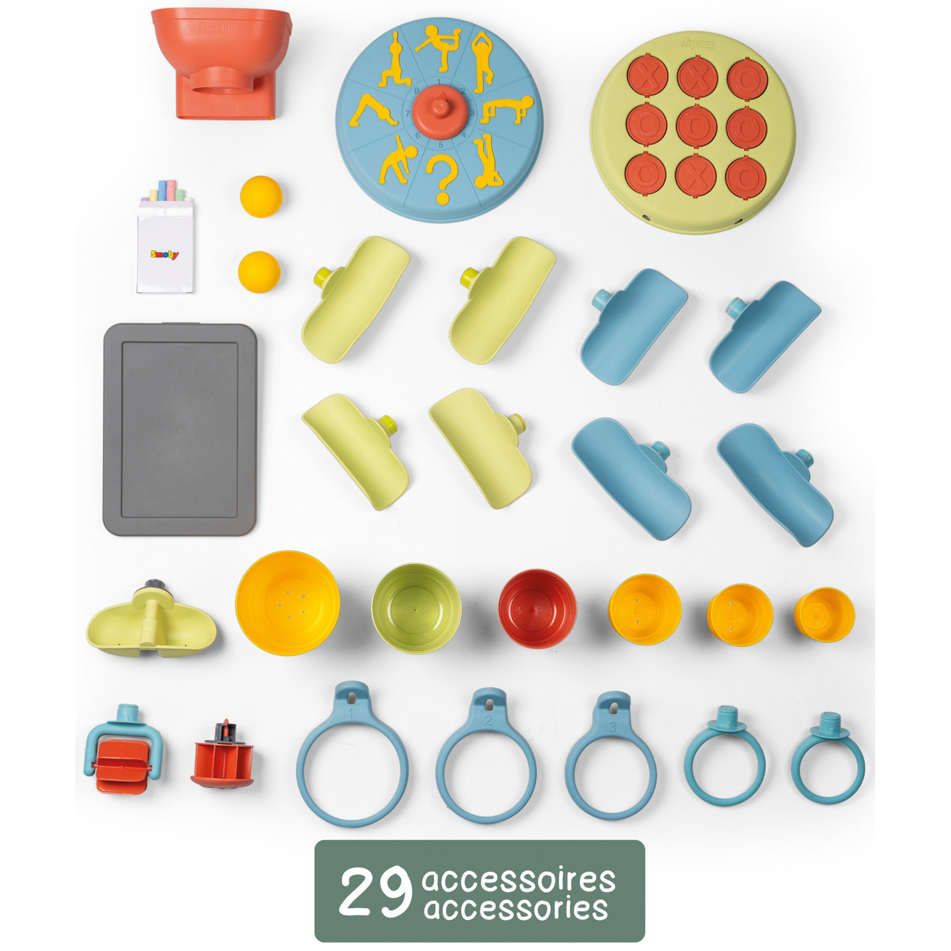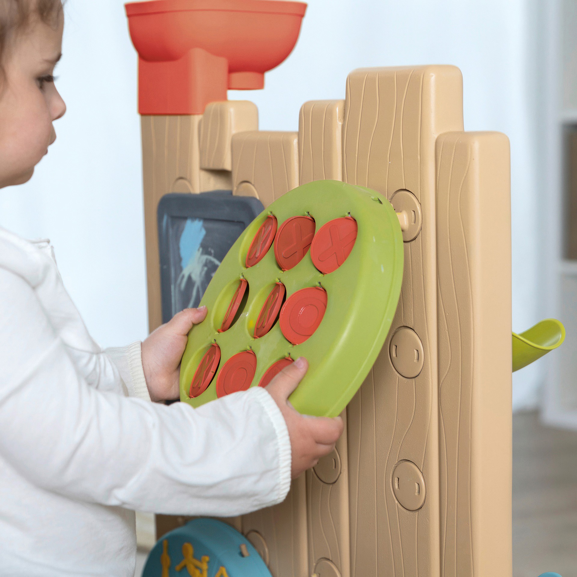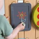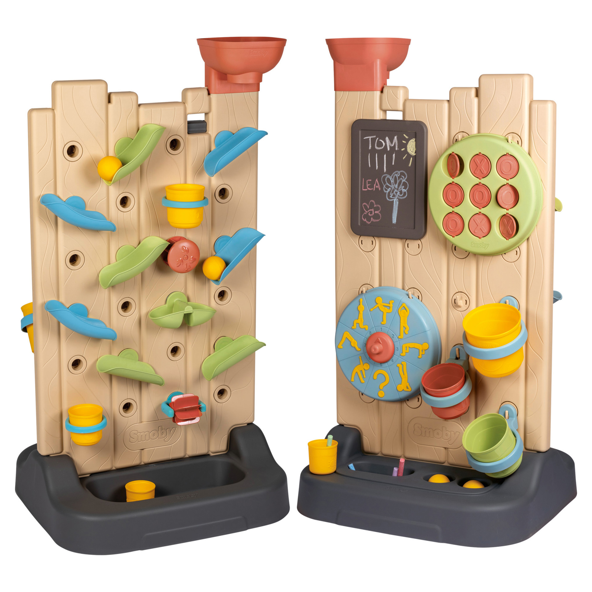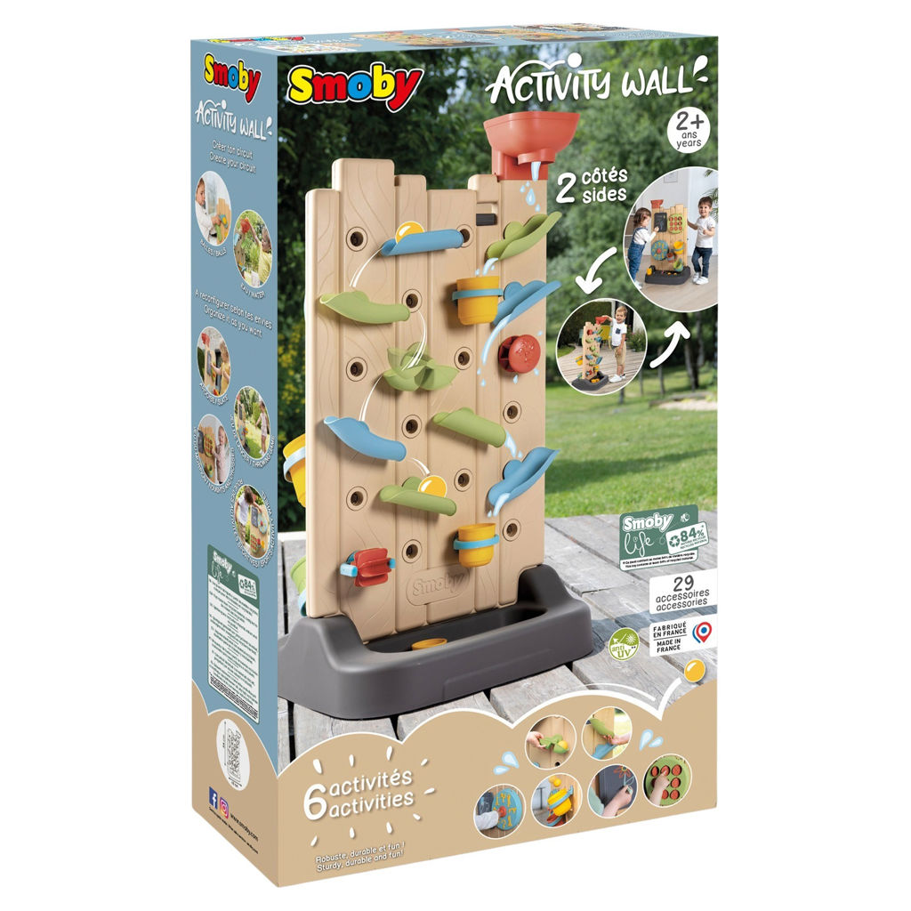 Le mur d'activités occupera vos enfants pendant de longues heures grâce à ses 6 activités! Sur le 1er côté : place à l´expérimentation. Composez votre propre circuit pour jouer avec de l´eau ou avec les 2 balles incluses. Les enfants pourront moduler le tout comme ils le souhaitent avec des gouttières, un réservoir, une bascule, des gobelets et des roues à aubes. Sur le 2eme côté du mur : un morpion, un jeu de lancer, une ardoise ainsi qu´une roue d´activités sportives.