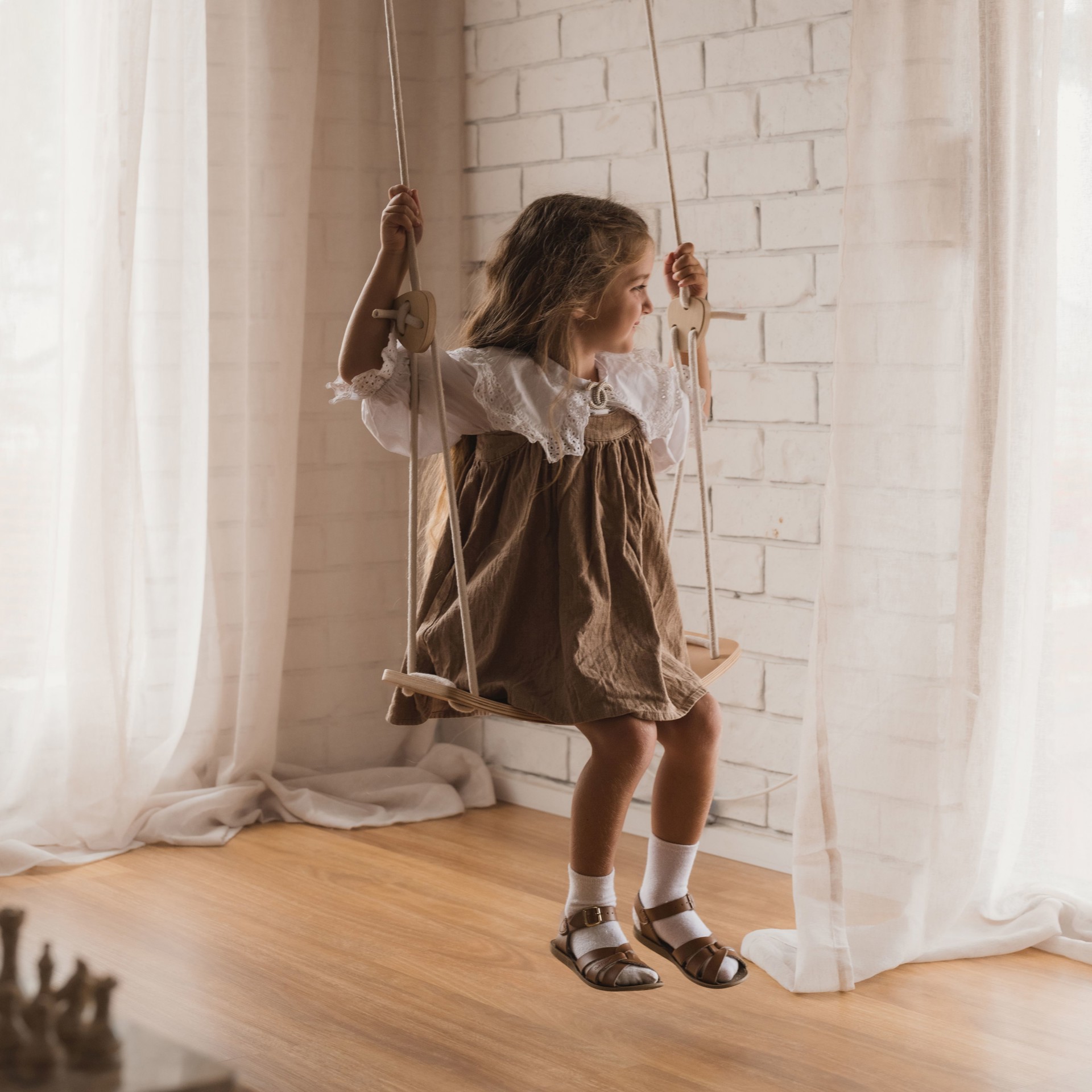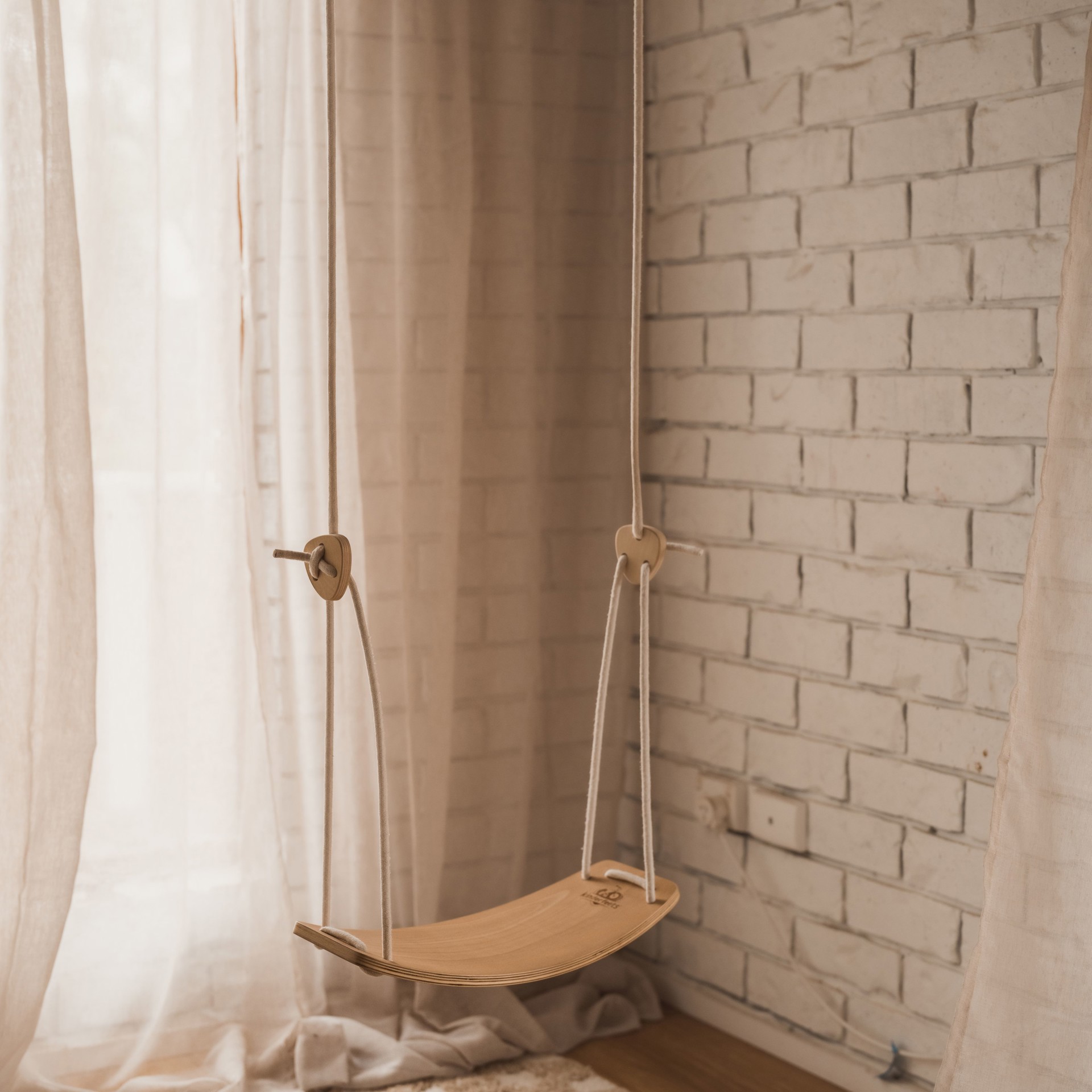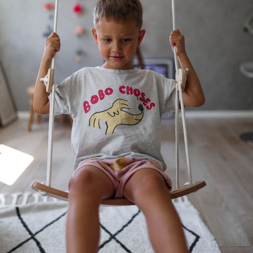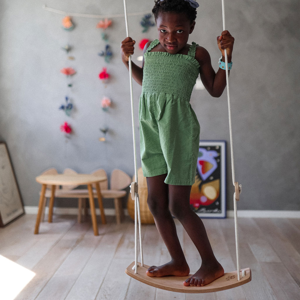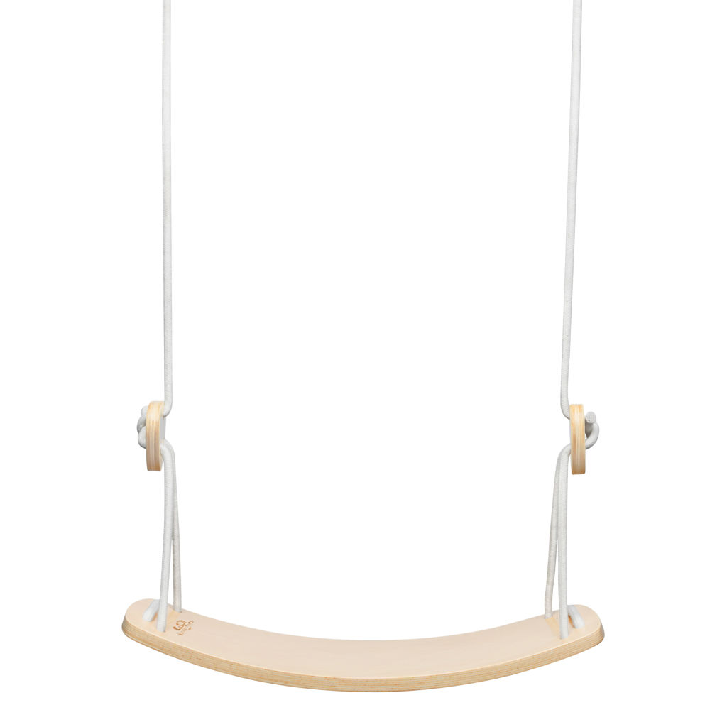 Les pièces de bois qui bloquent les cordes, les lanières de suspension en nylon et les mousquetons garantissent la stabilité de la balançoire, sans danger pour les enfants (pensez à bien vérifier les nuds et les verrous avant chaque utilisation), sans oublier le siège incurvé et ergonomique qui convient parfaitement aux petits corps.