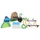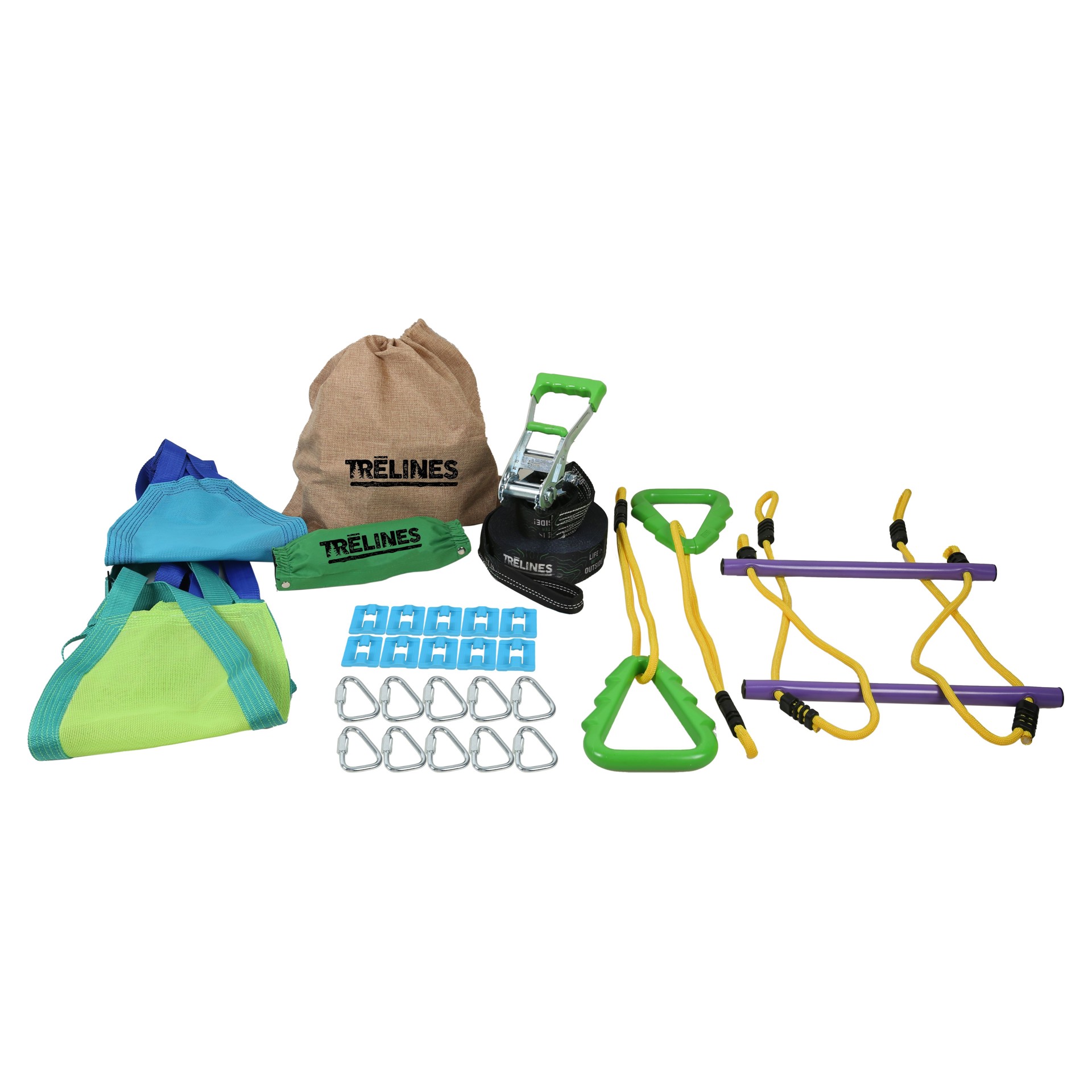 Comprend une ligne de 36 pieds, 5 obstacles, 2 balançoires à ceinture souple (réglables en hauteur), 2 anneaux d'arbre, 1 trapèze à double barre, 10 attaches de ligne, 1 couvercle à cliquet et un sac de rangement.
