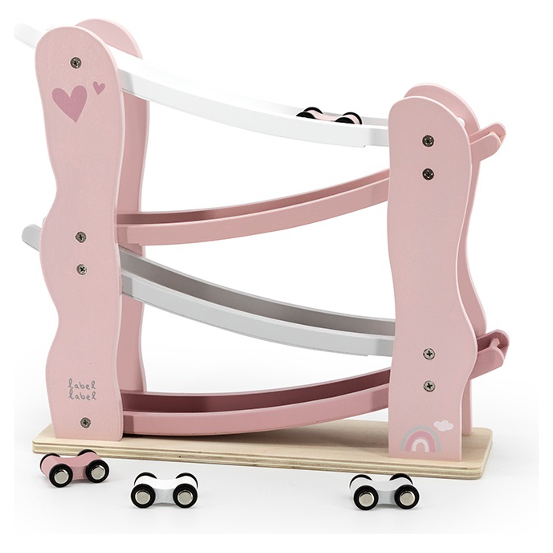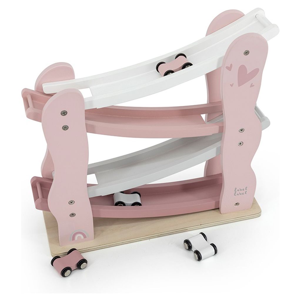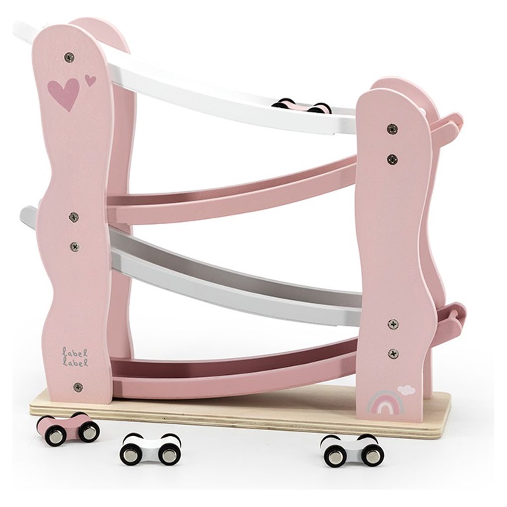 Cette glissade amusante de voiture de Label Label est faite de bois de hêtre certifié FSC de qualité et a été décorée avec de belles nuances roses/blanches/grises utilisant de la peinture à base d´eau non nocive pour les enfants.