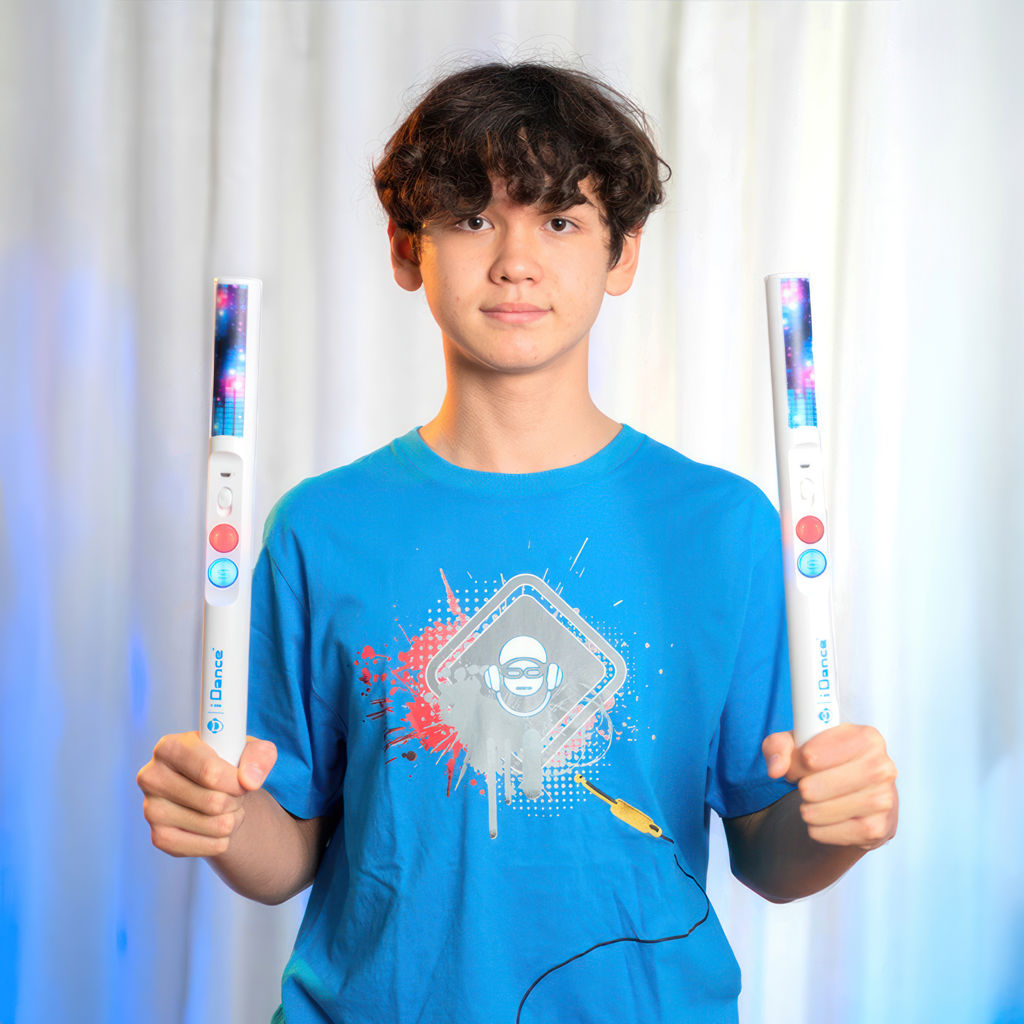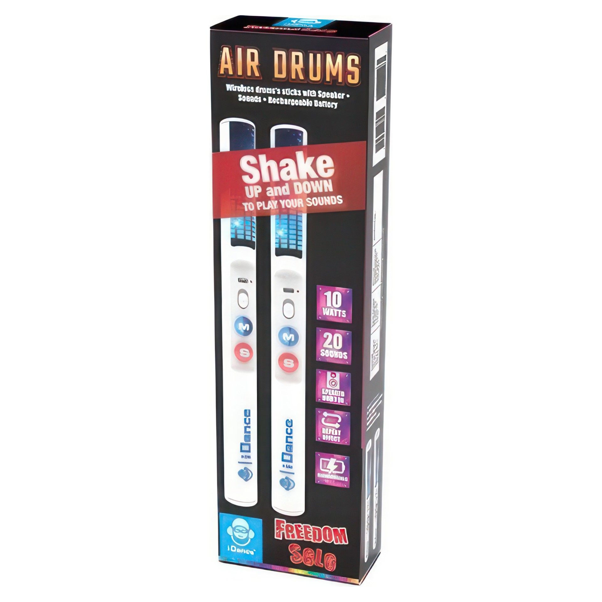 Aucune batterie n'est nécessaire, il suffit de charger les piles à l'aide du cordon de chargement USB fourni, de choisir l'un des 20 sons de batterie différents et de commencer à jouer de l'air-drumming !