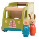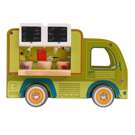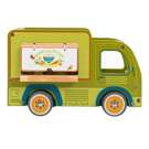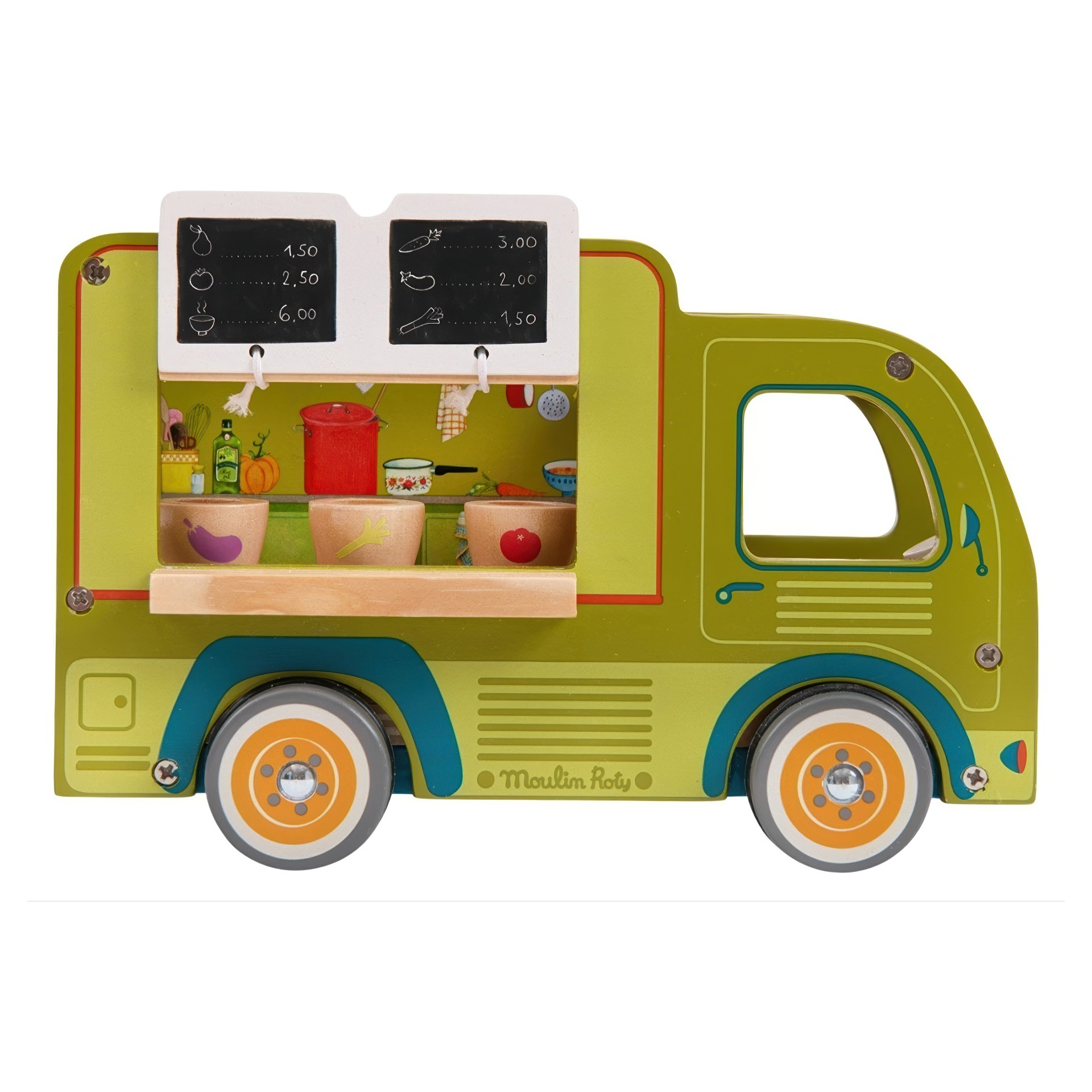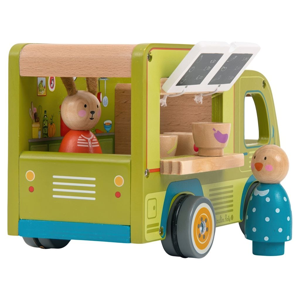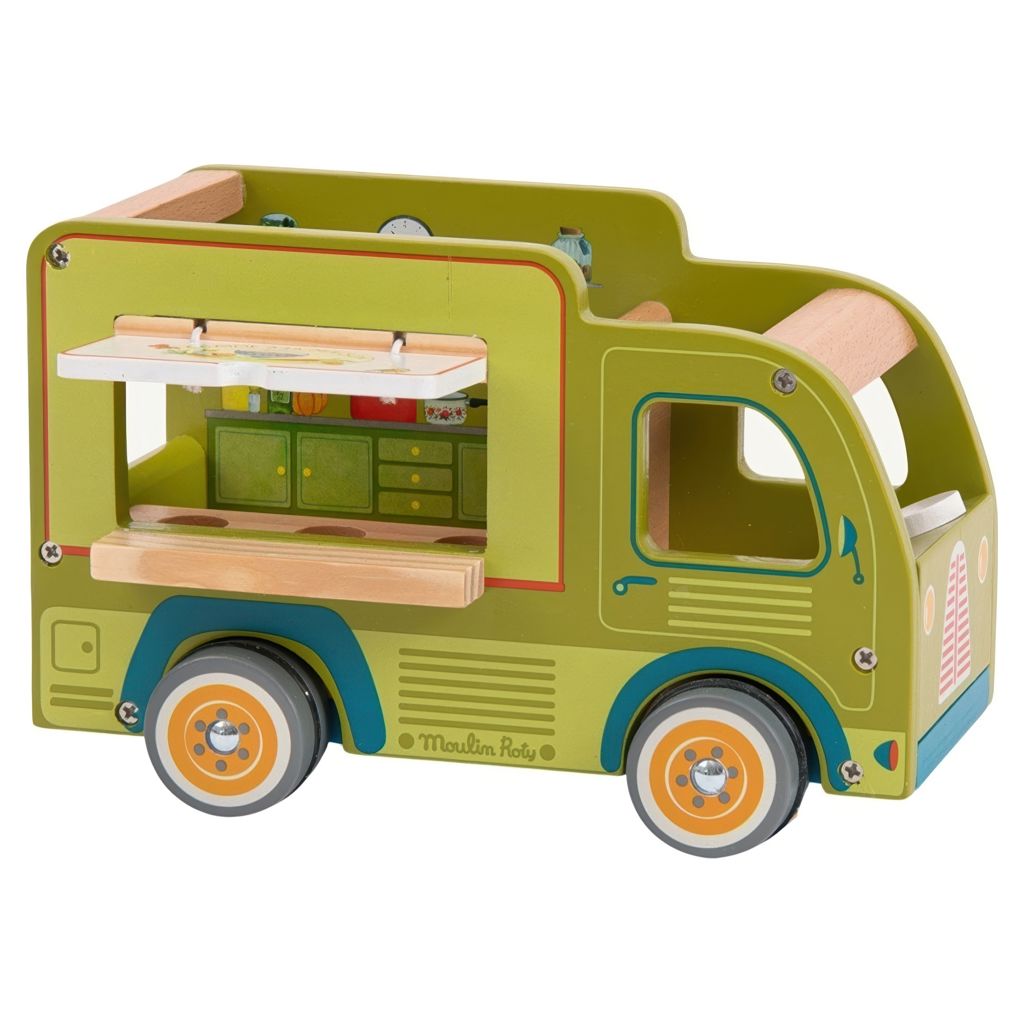 Tout en bois et entièrement illustré, ses roues tournent et sa fenêtre s'ouvre pour servir les clients.