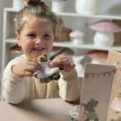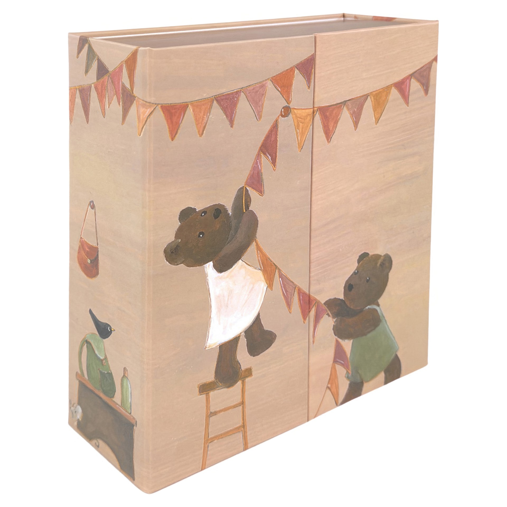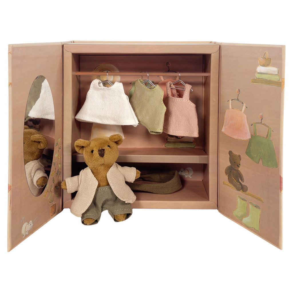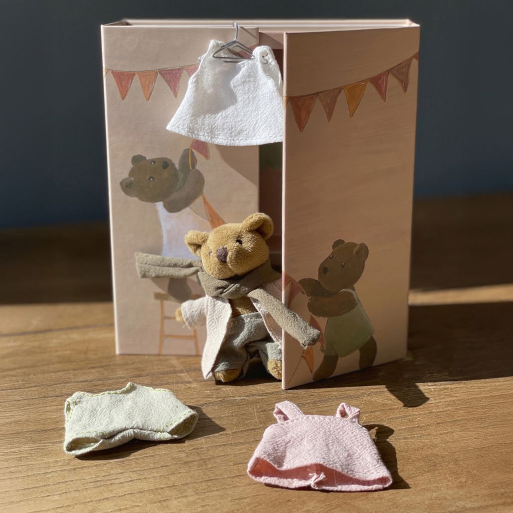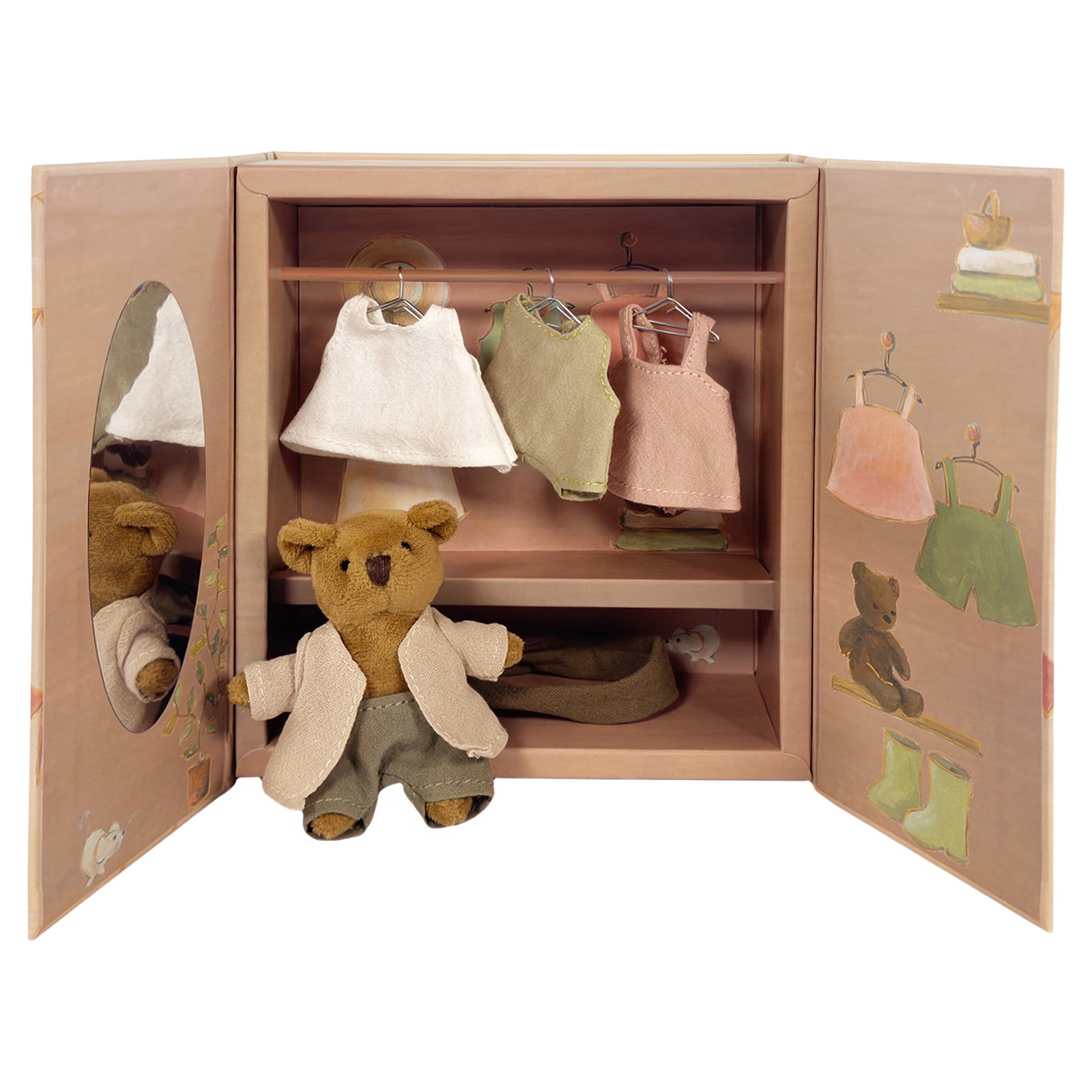 Un adorable petit ourson en peluche, ses 6 vêtements de coton et leurs cintres sont cachés dans cette jolie garde-robe.
