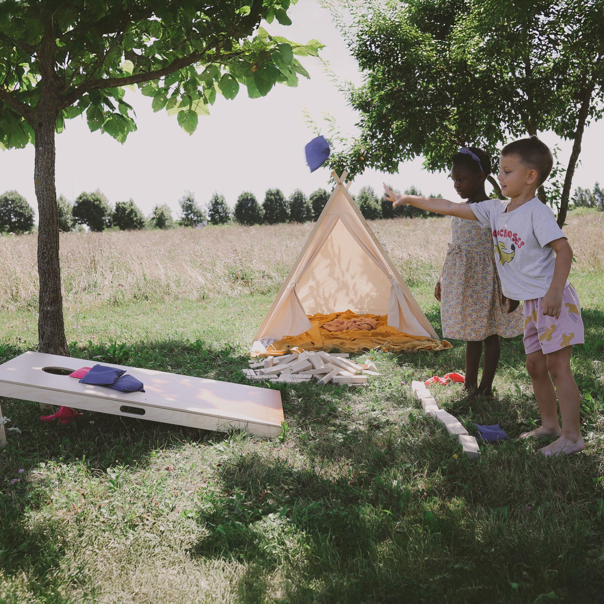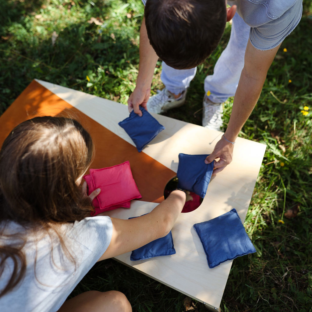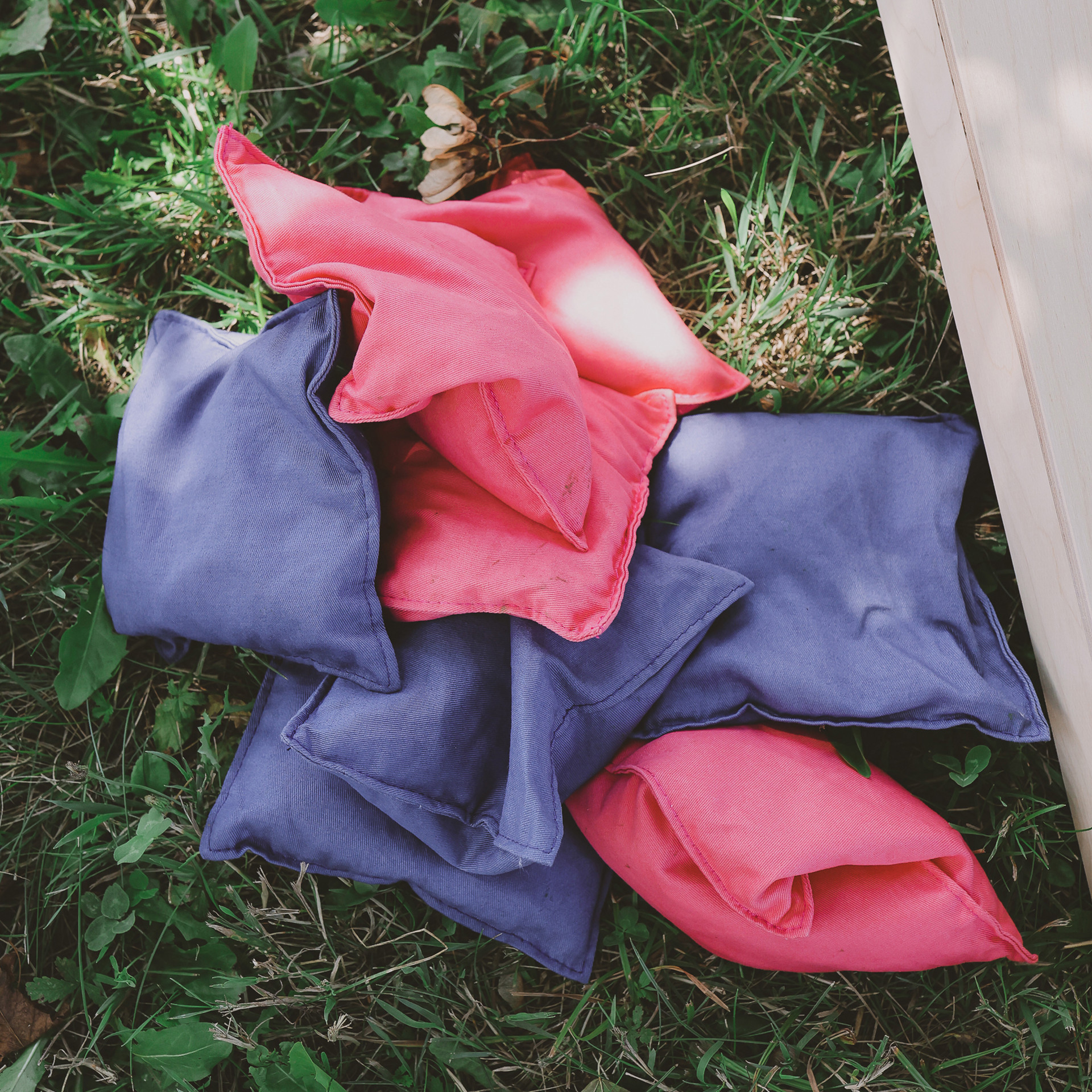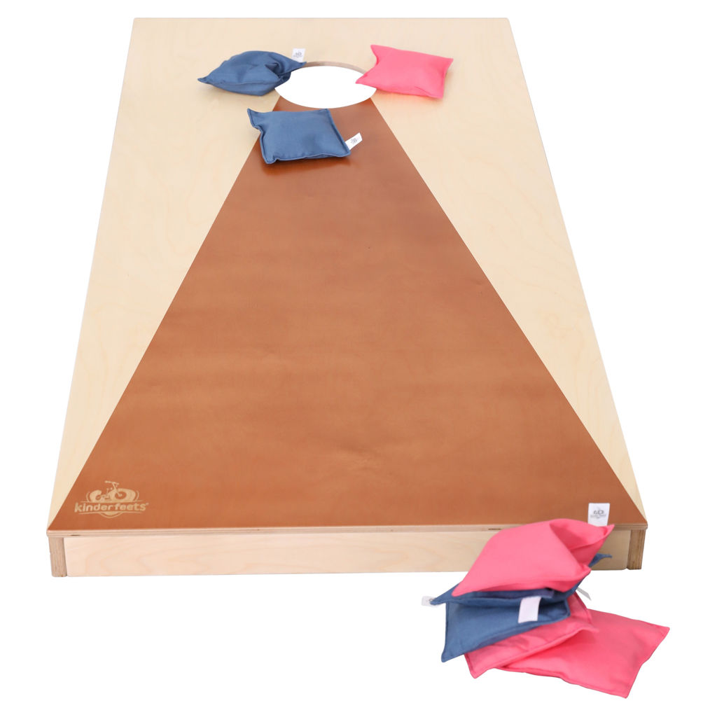 Apprenez à jouer au jeu de cour préféré des Américains! Le jeu de Cornhole de Kinderfeets comprend 8 sacs de haricots résistants aux intempéries (4 roses, 4 bleus) et 1 planche de cornhole de taille réglementaire avec des trous de 6 pouces pour le jeu.