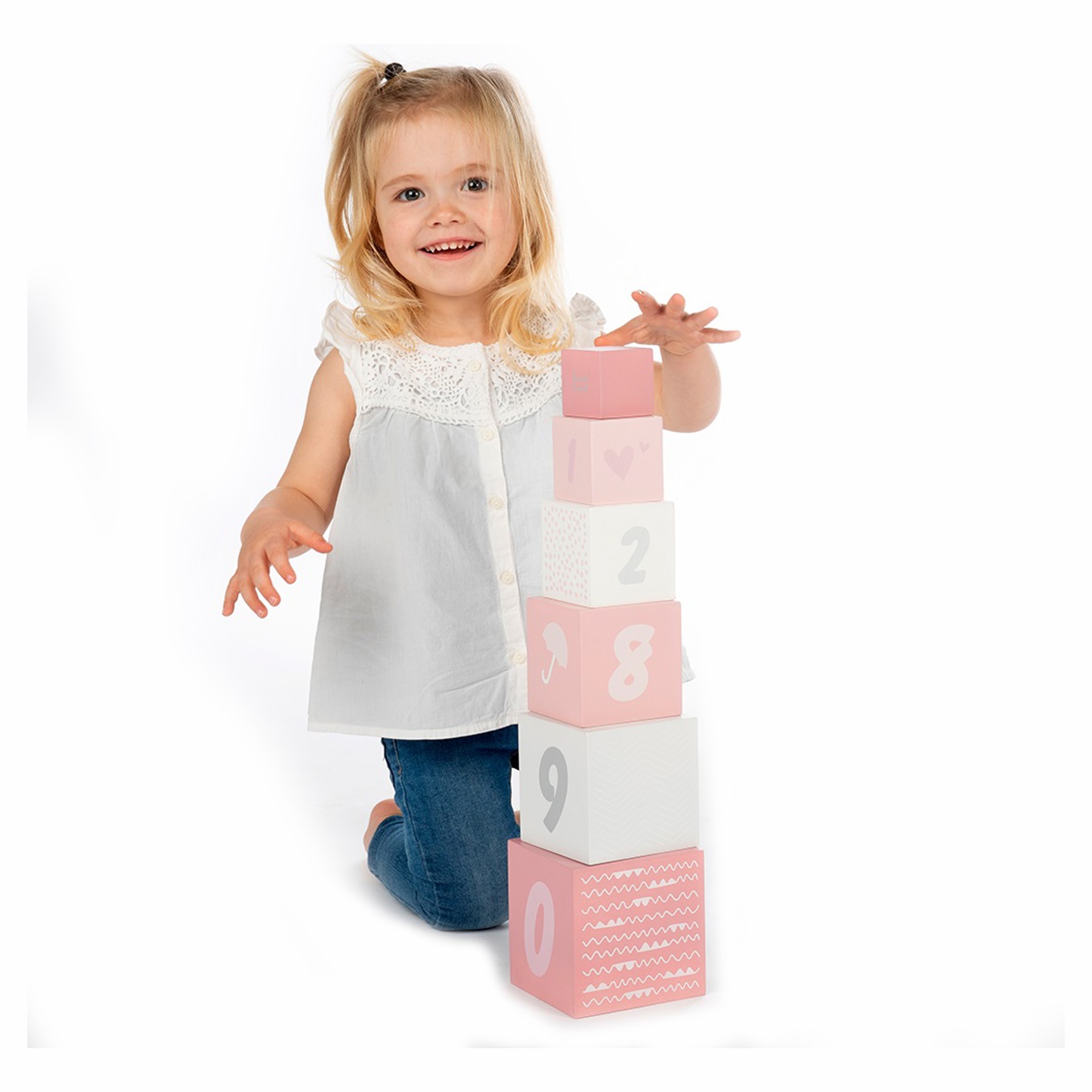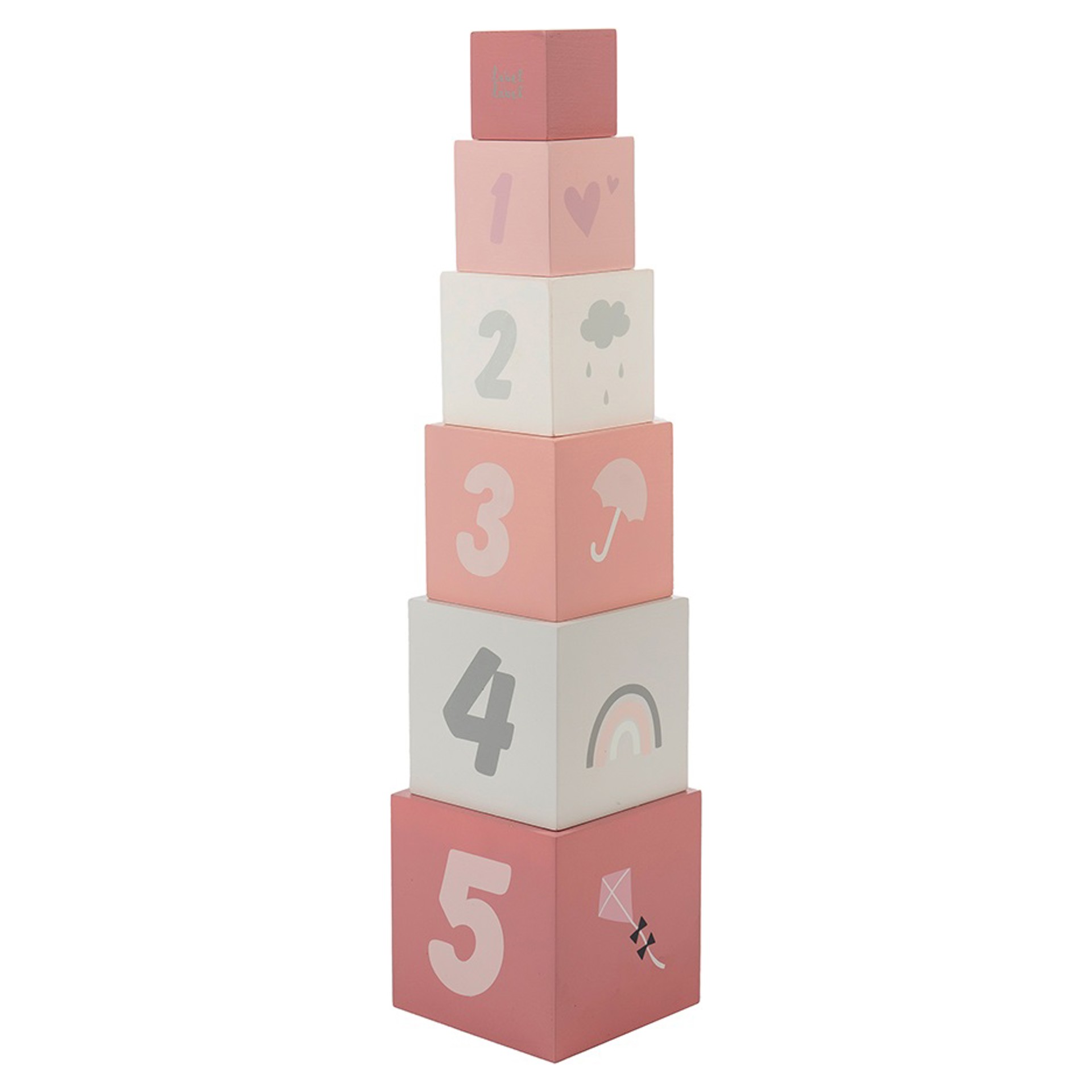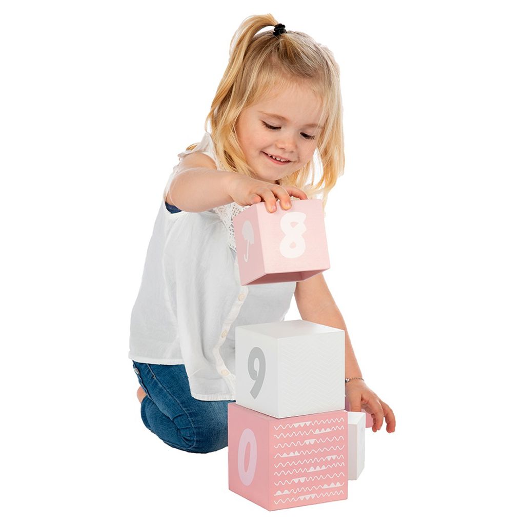 Les blocs d´empilage numérotés sont faits de bois certifié FSC et ont reçu de belles tonalités roses/blanches/grises à l´aide de peinture à base d´eau non nocive pour les enfants.