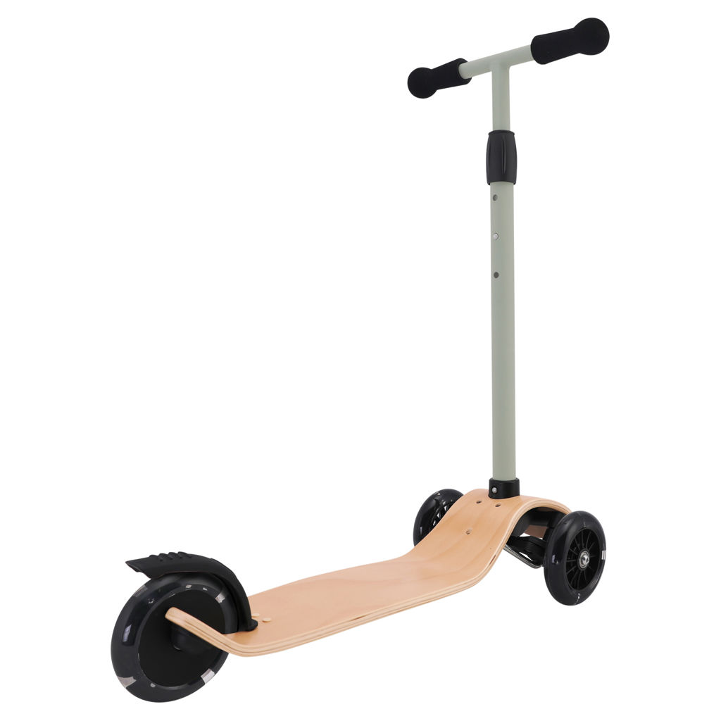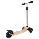 Cette trottinette artisanale est dotée d'un tablier en bois et d'un guidon réglable en trois hauteurs, ce qui lui permet de grandir avec l'enfant.