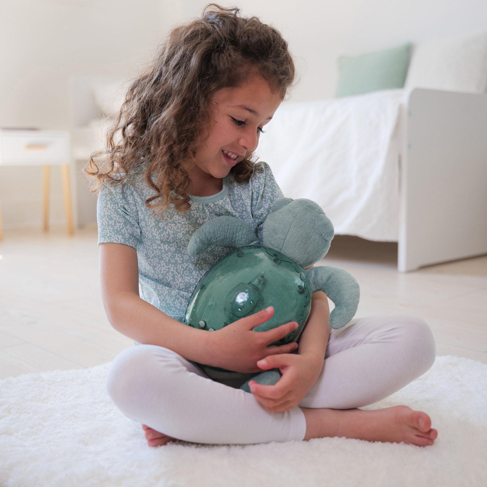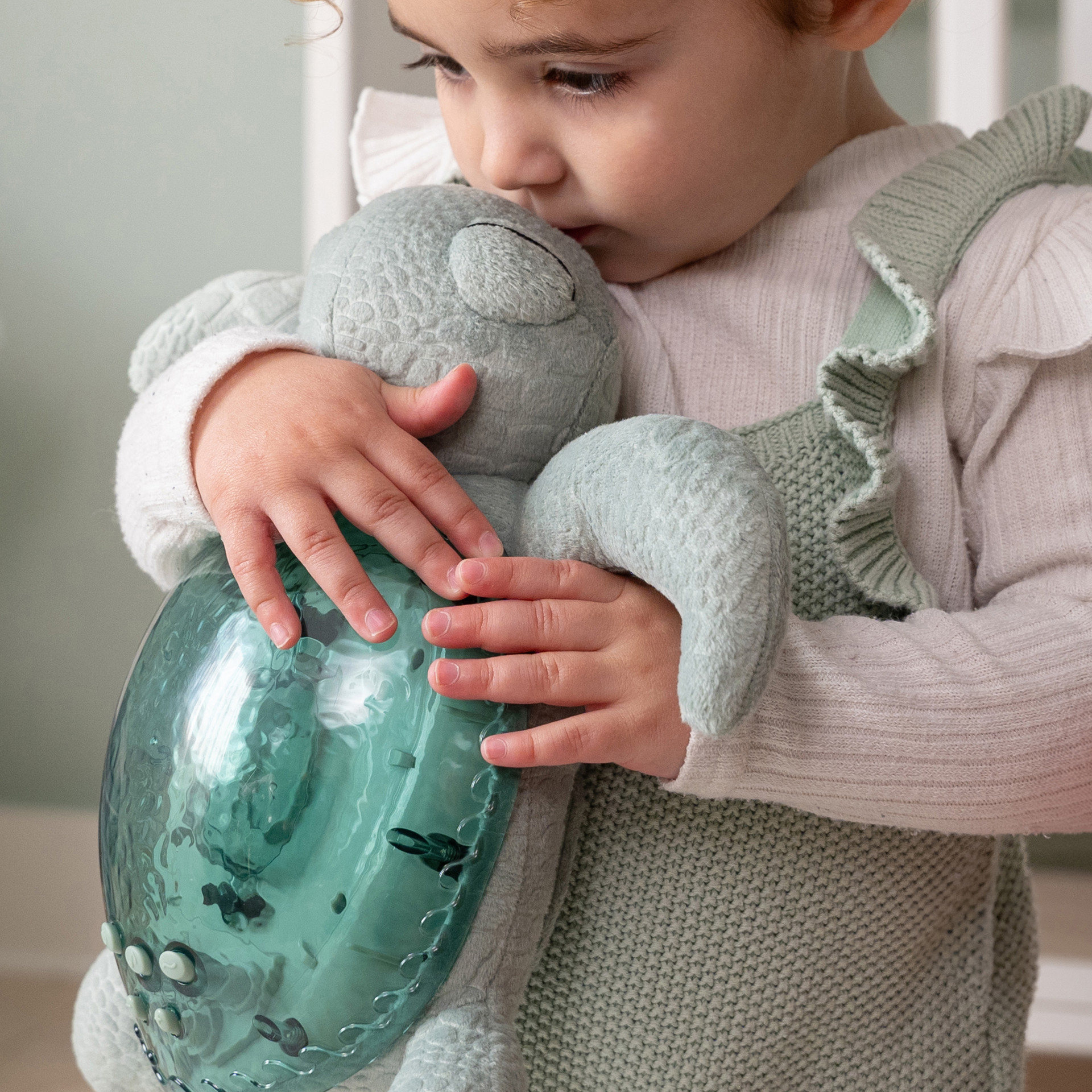 Tranquil Turtle ™ Verte (Rechargeable), jolie tortue musicale fabriquée en fibres 100 % recyclées, issues de bouteilles en plastique qui diffuse une douce lumière et projette sur le plafond de la chambre les vagues de l´océan en mouvement grâce à un mécanisme unique et breveté.