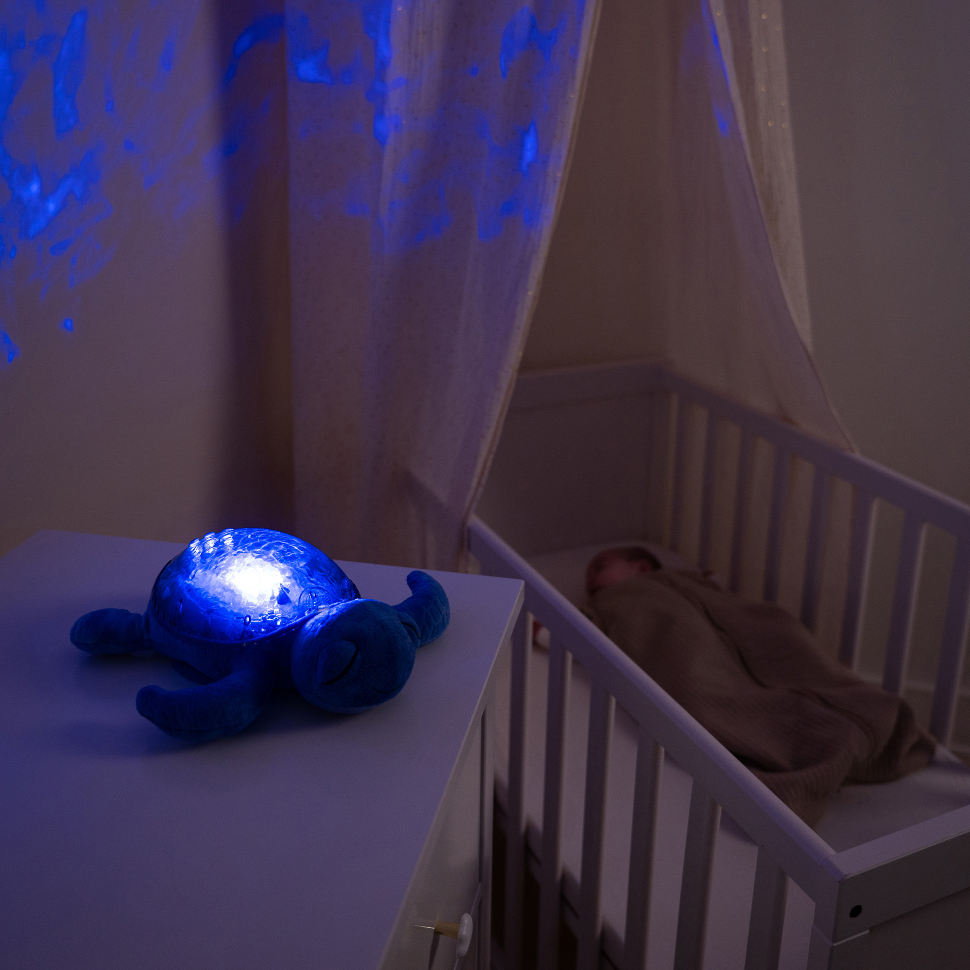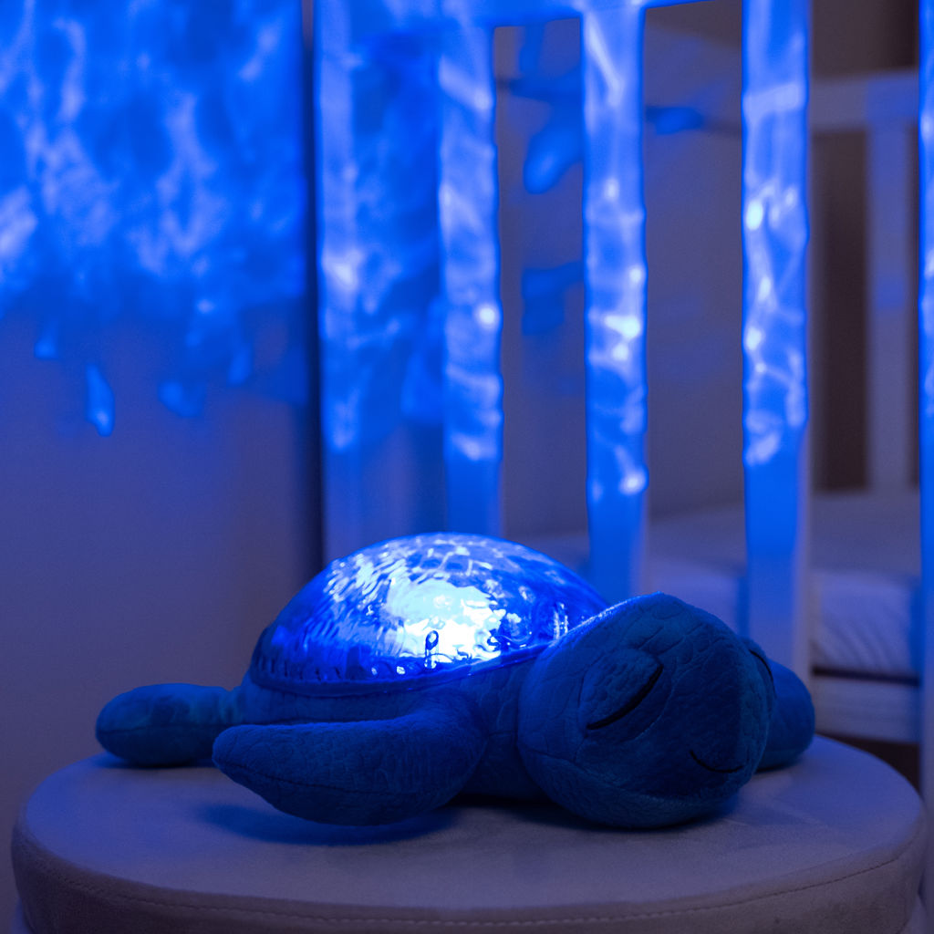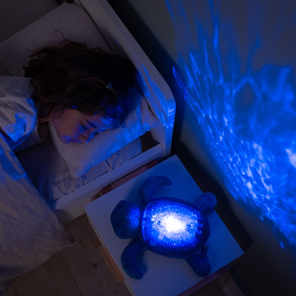 Douce peluche la journée, elle se transforme en veilleuse la nuit venue. Son effet de lumière sous-marine est magique, grâce aux projections de vagues en mouvements. Ses mélodies et ses bruits blancs apaiseront bébé pour un sommeil relaxant.