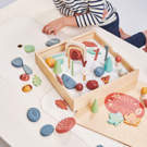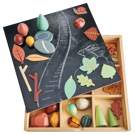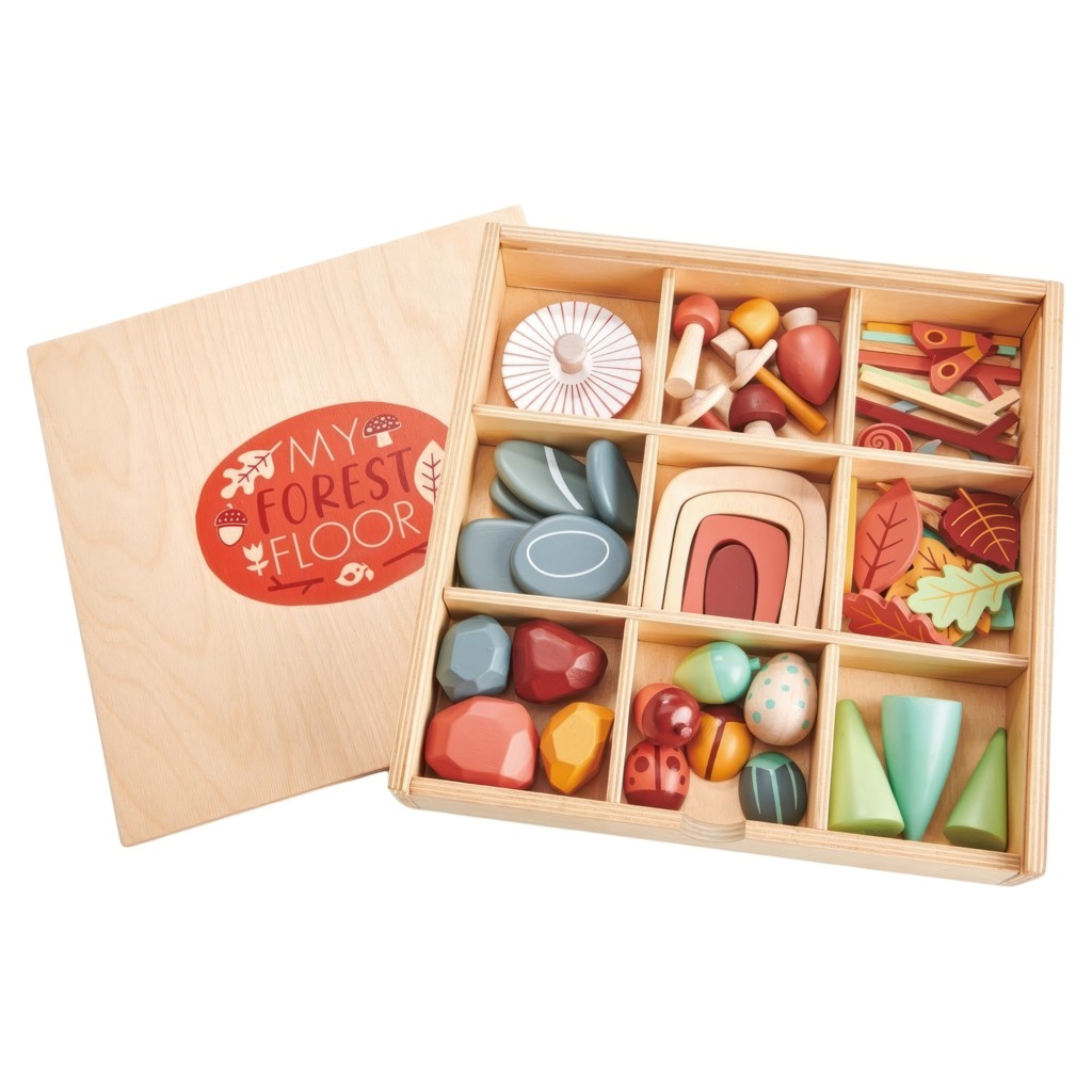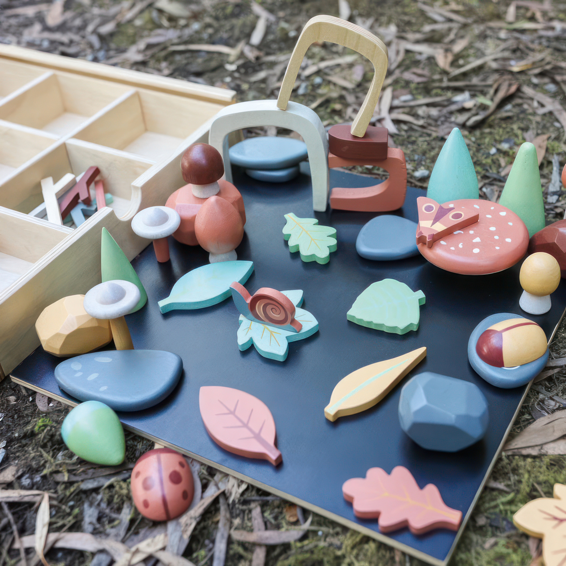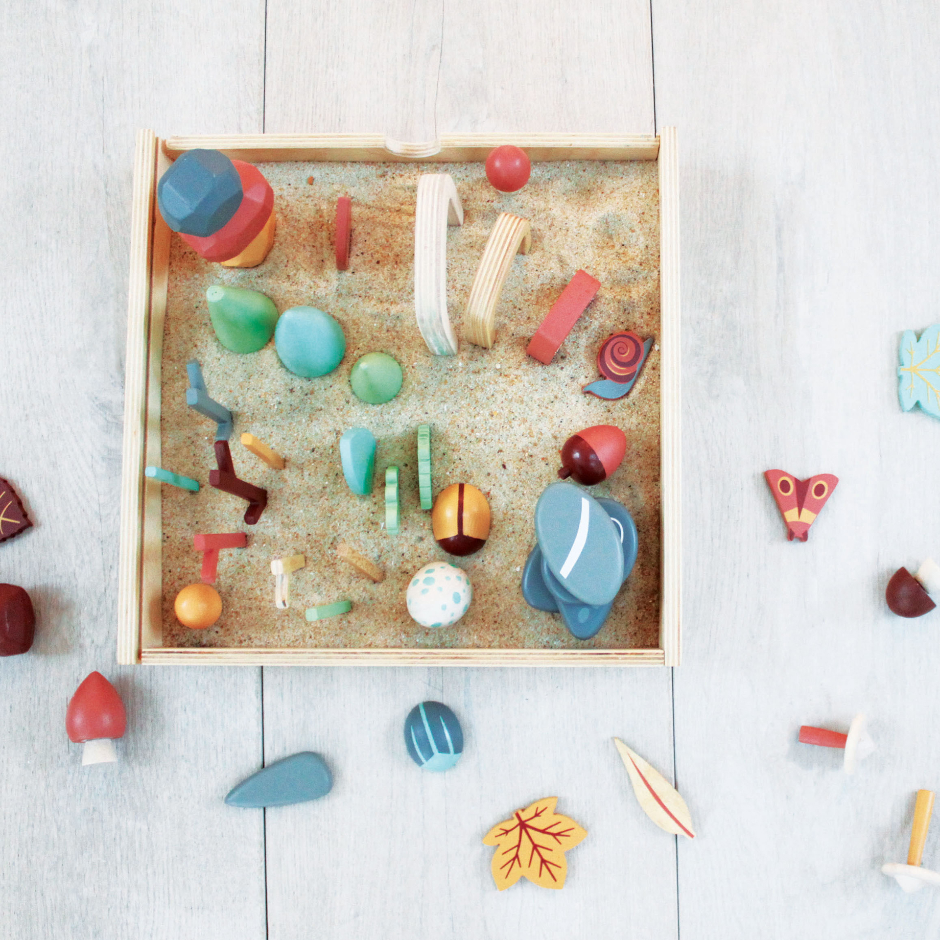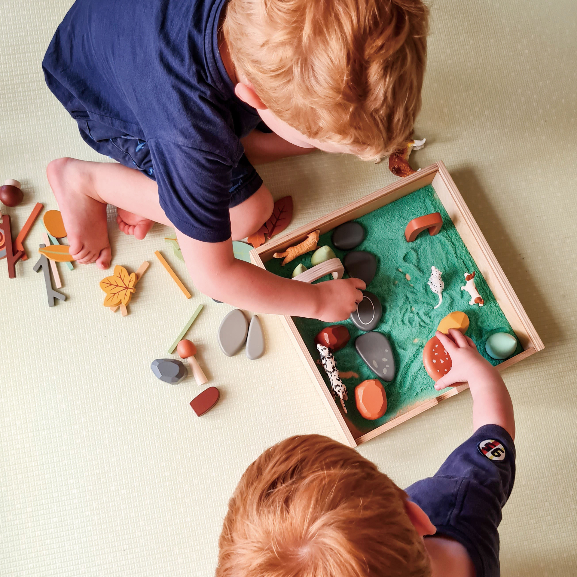 Une vaste boîte de plateau de bricolage ouverte pour que votre tout-petit puisse trier, empiler et organiser ses trésors forestiers.