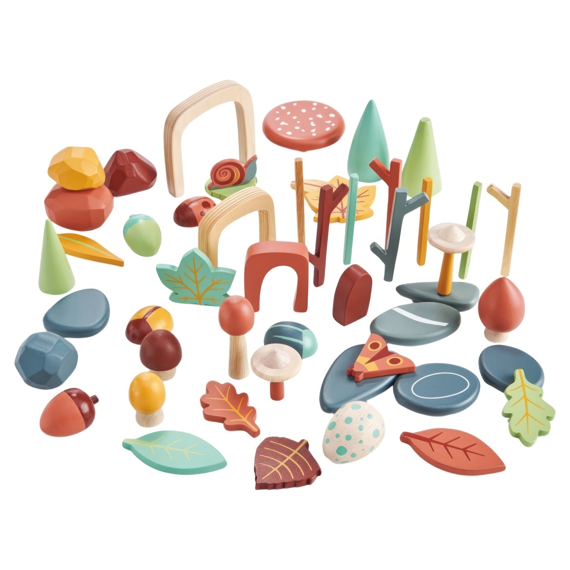 L'ensemble comprend : 6 cailloux plats gris, 4 roches à multiples facettes, 3 cônes, 8 brindilles, un escargot, un papillon de nuit, 6 petits champignons vénéneux, un grand champignon vénéneux, 10 feuilles, 2 glands, 3 coléoptères, 4 pièces de tunnel et un oeuf d'oiseau.
