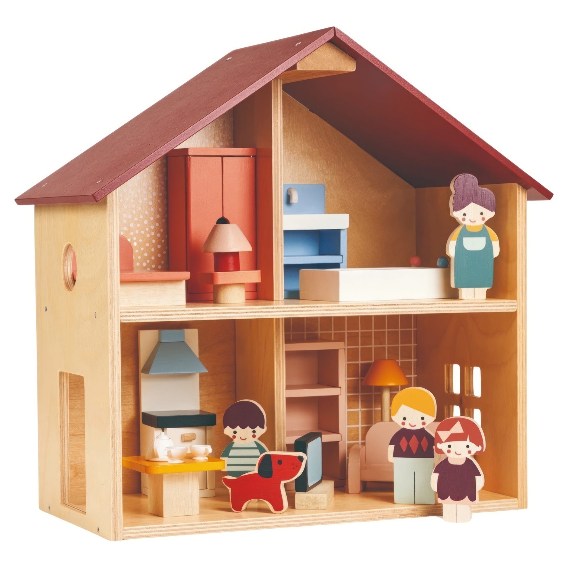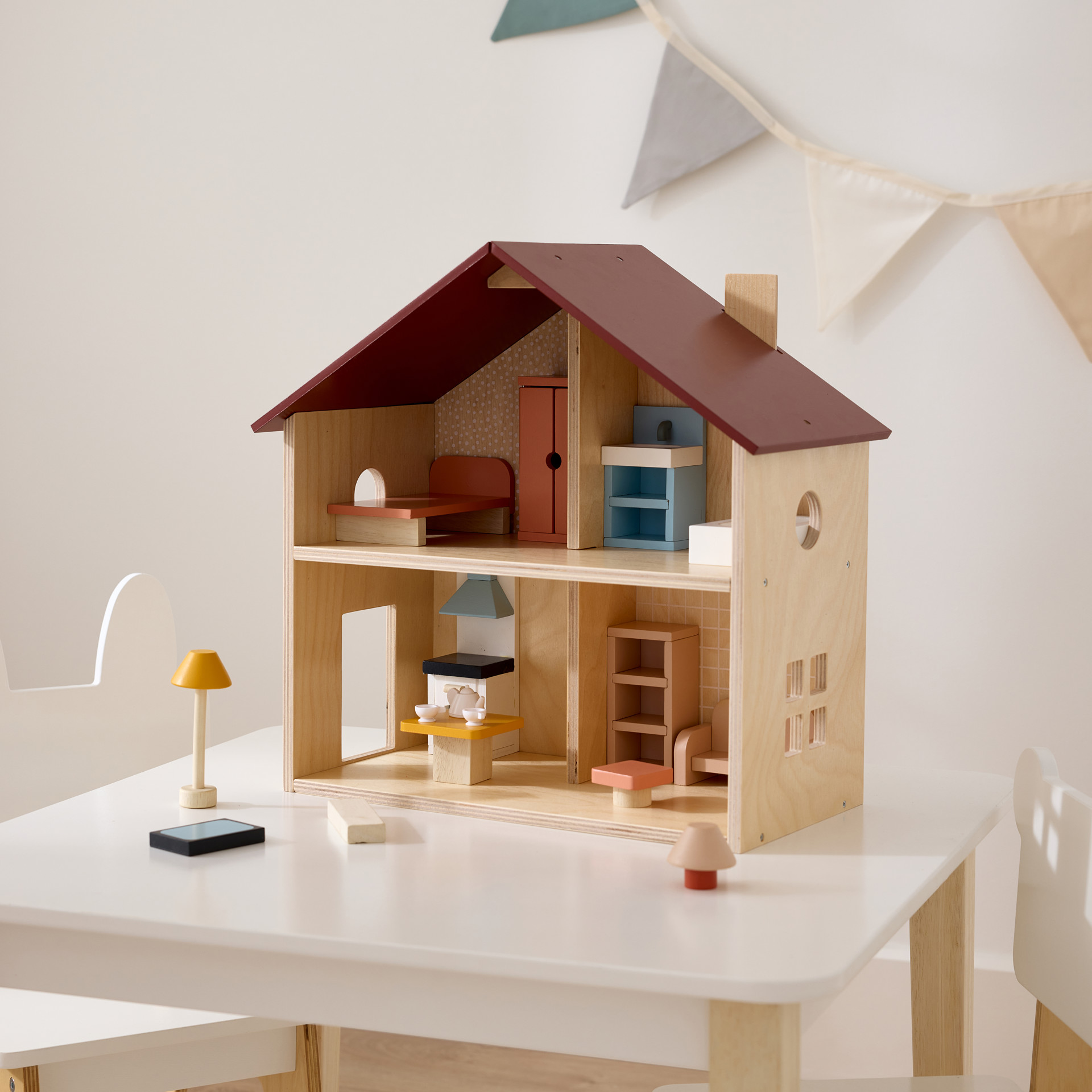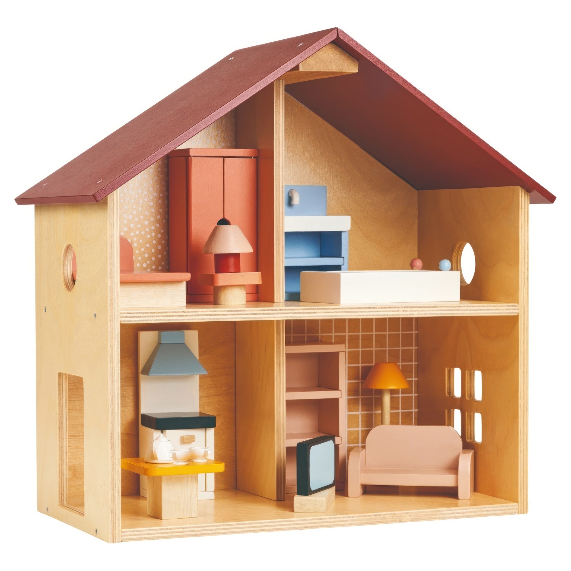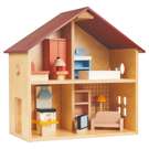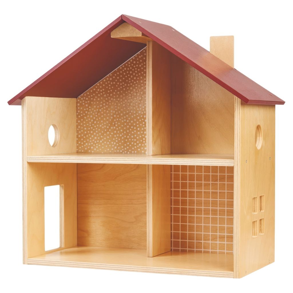 Une maison de poupée en bois de style ouvert avec 3 fenêtres et une porte sur les côtés.