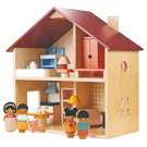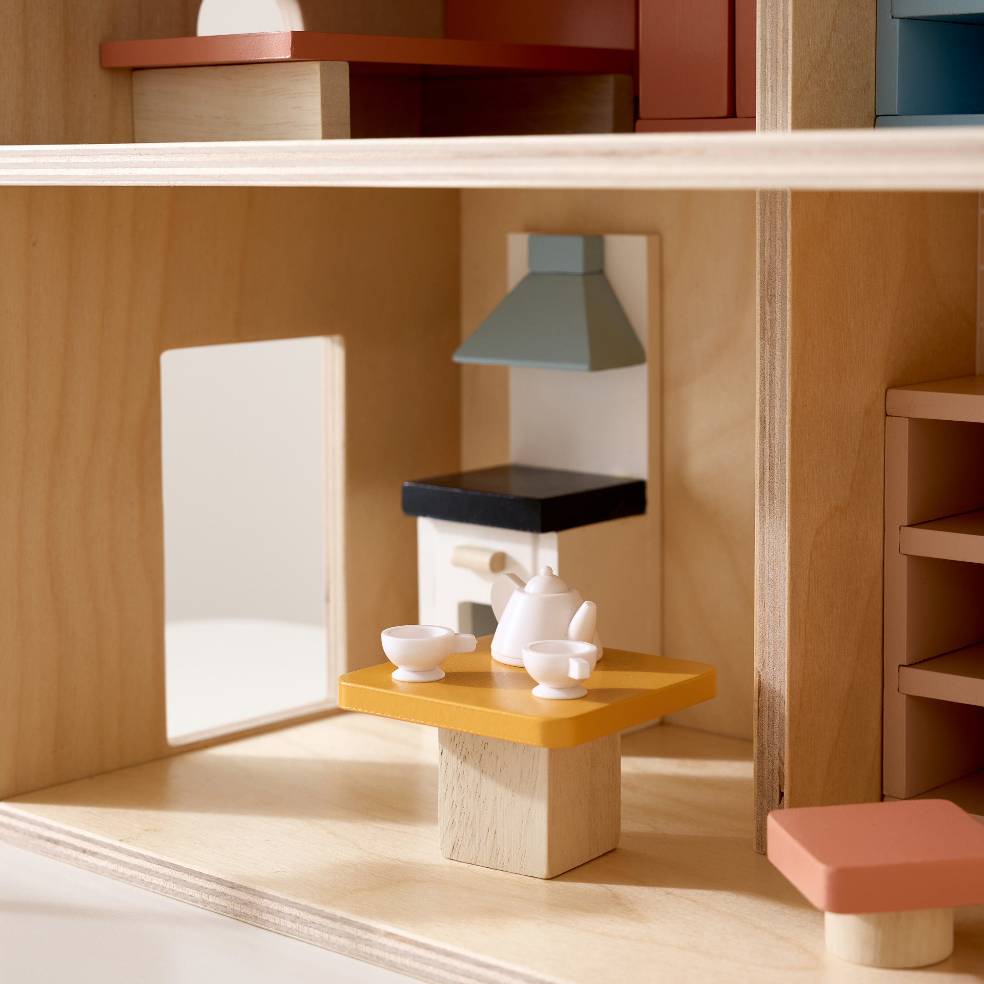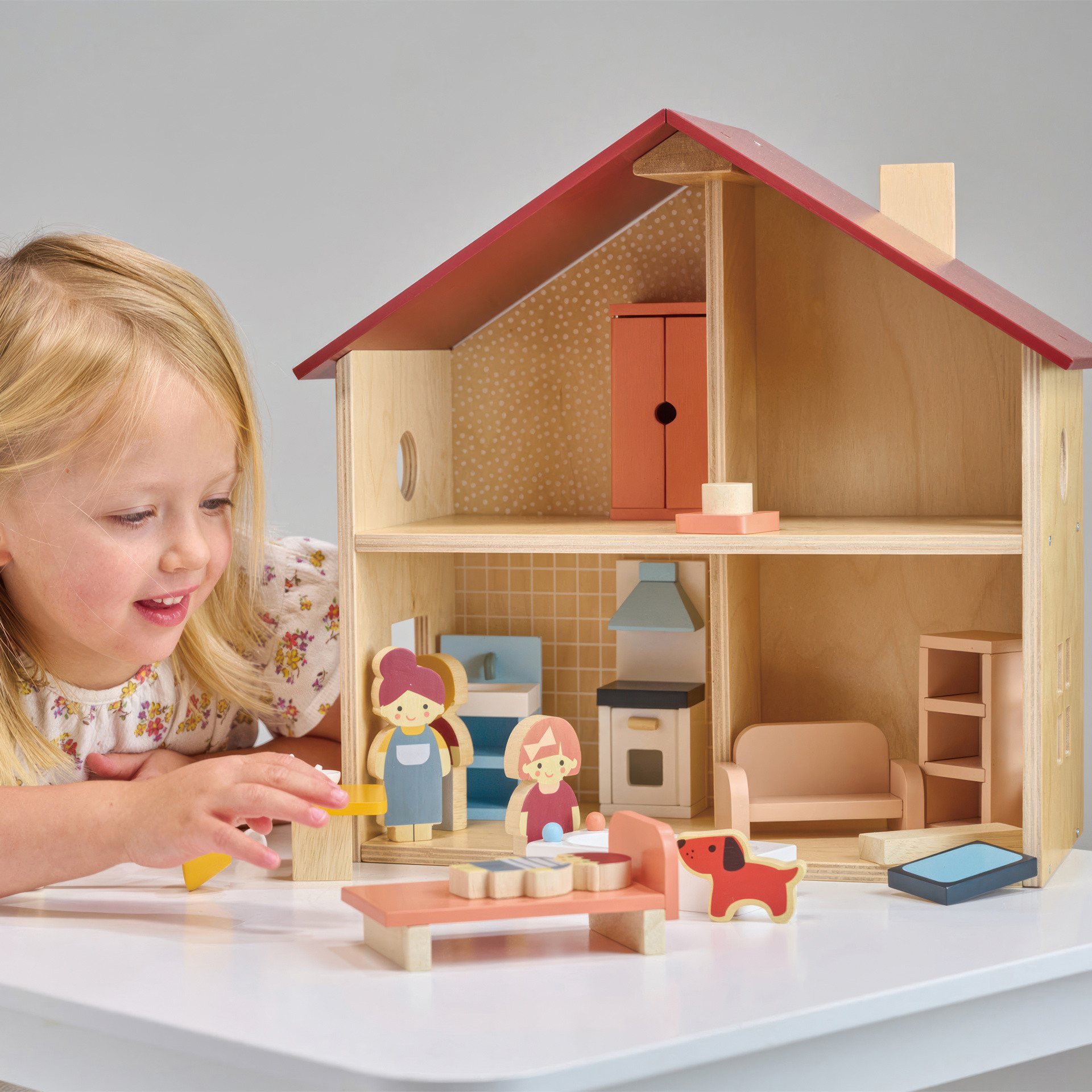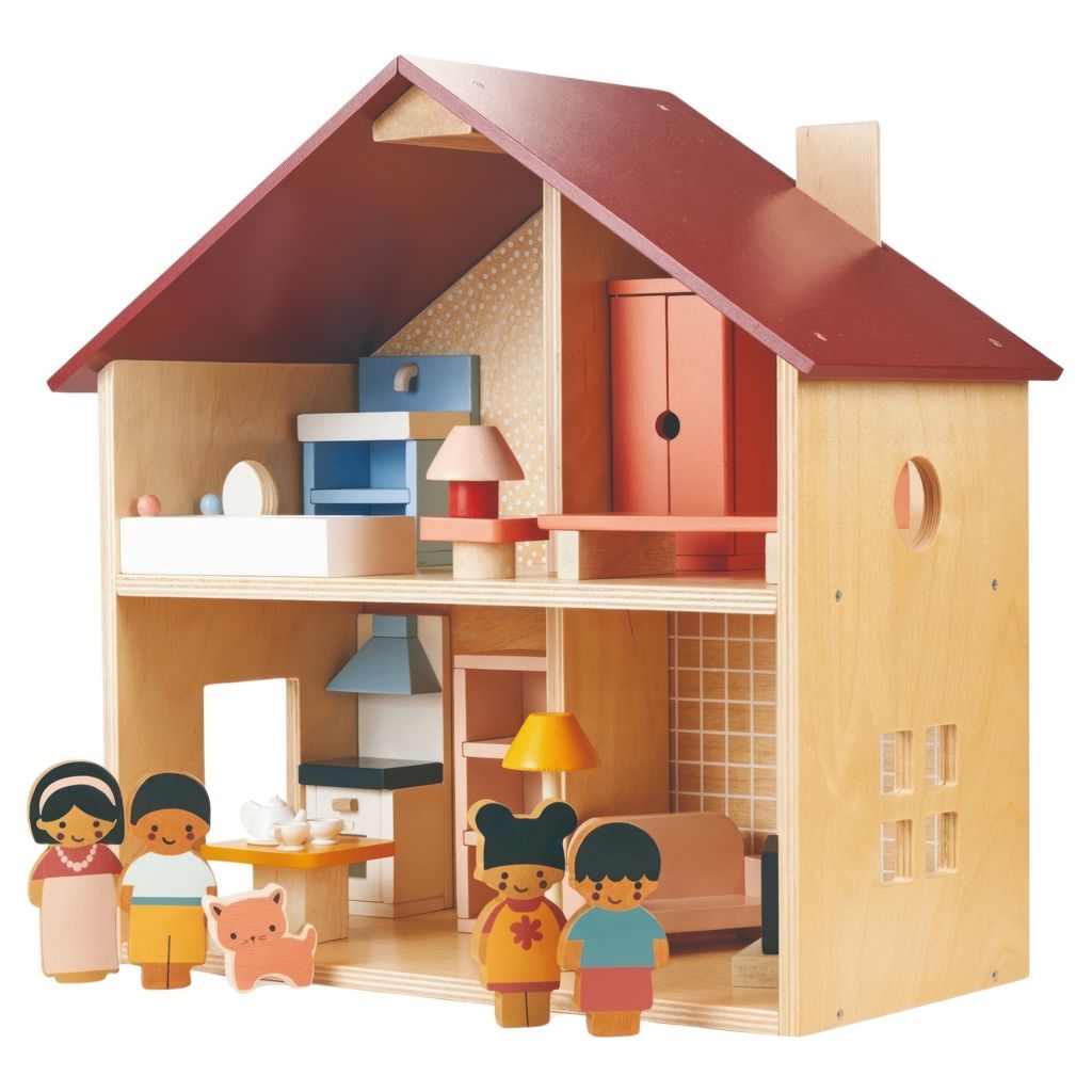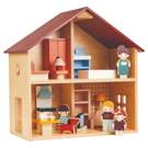 Une maison de poupée en bois de style ouvert avec 3 fenêtres et une porte sur les côtés.