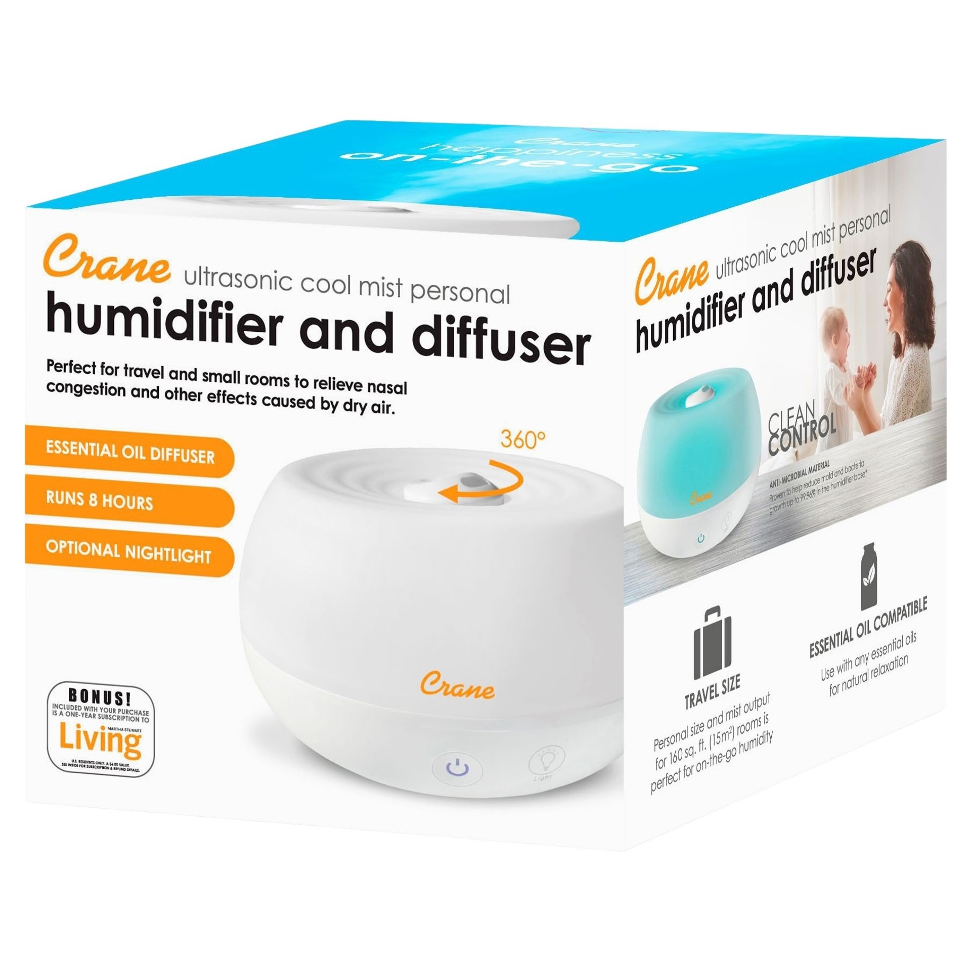 L´humidificateur ultrasonique personnel à vapeur froide de 0,76 l (0,2 gal) de Crane couvre jusqu´à 14,86 m2 (160 pi2) et humidifie pendant 8 heures pour aider à soulager les symptômes de sécheresse et la congestion. Pour une expérience améliorée, utilisez-le avec vos huiles essentielles préférées et aidez toute votre famille à mieux respirer et à dormir paisiblement toute la nuit. Format idéal pour humidifier où que vous soyez.