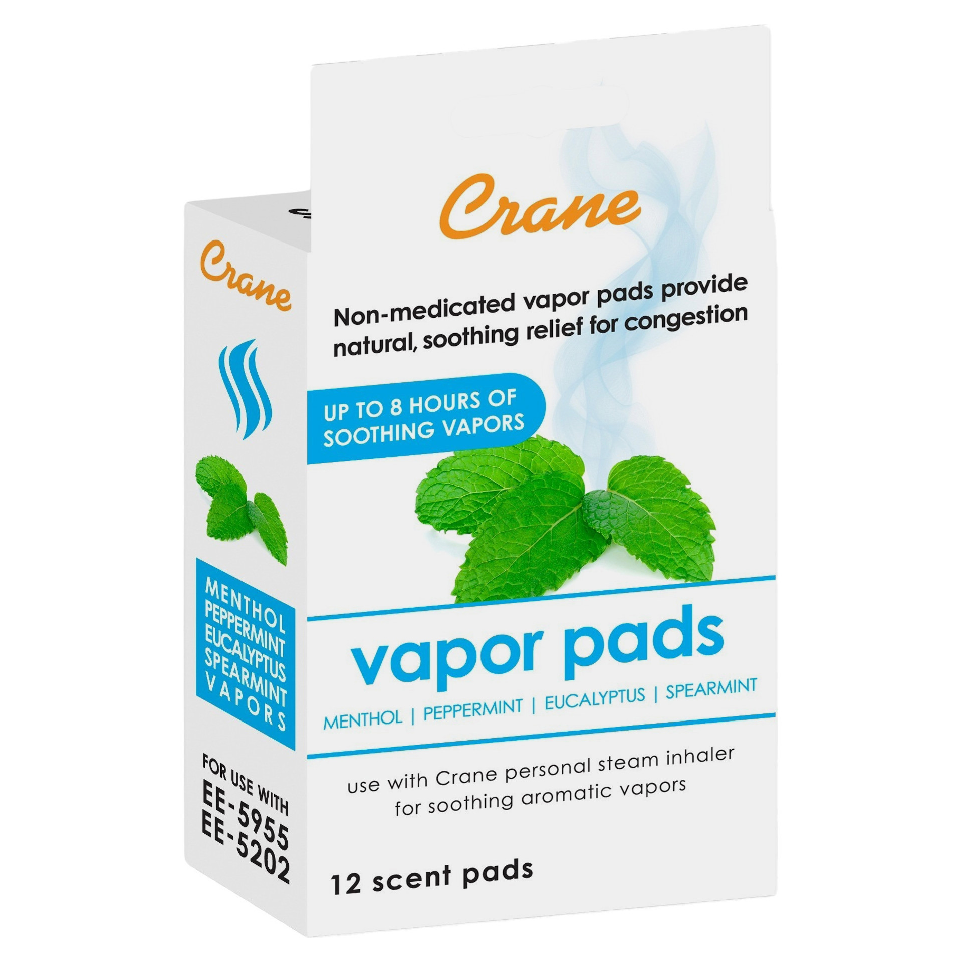 Ces tampons vapeur aromatiques de Crane sont non médicamenteux et vous aident à soulager vos symptômes de façon naturelle sans recourir aux médicaments contre la toux et le rhume en vente libre. Ils sont offerts dans les arômes de menthe et d´eucalyptus et sont faits à partir d´ingrédients comme le menthol, la menthe poivrée, l´eucalyptus et la menthe verte. Ils sont compatibles avec les modèles EE-5302, EE-5202 et EE-5955 de Crane.