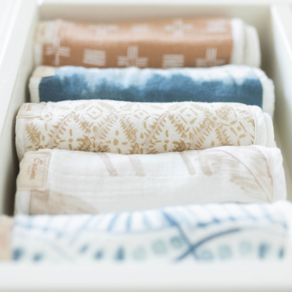 Légères et absorbantes, les serviettes pour le rot Caspian en ratine de coton doublée de mousseline de coton se glissent aussi très bien dans un sac à couches.