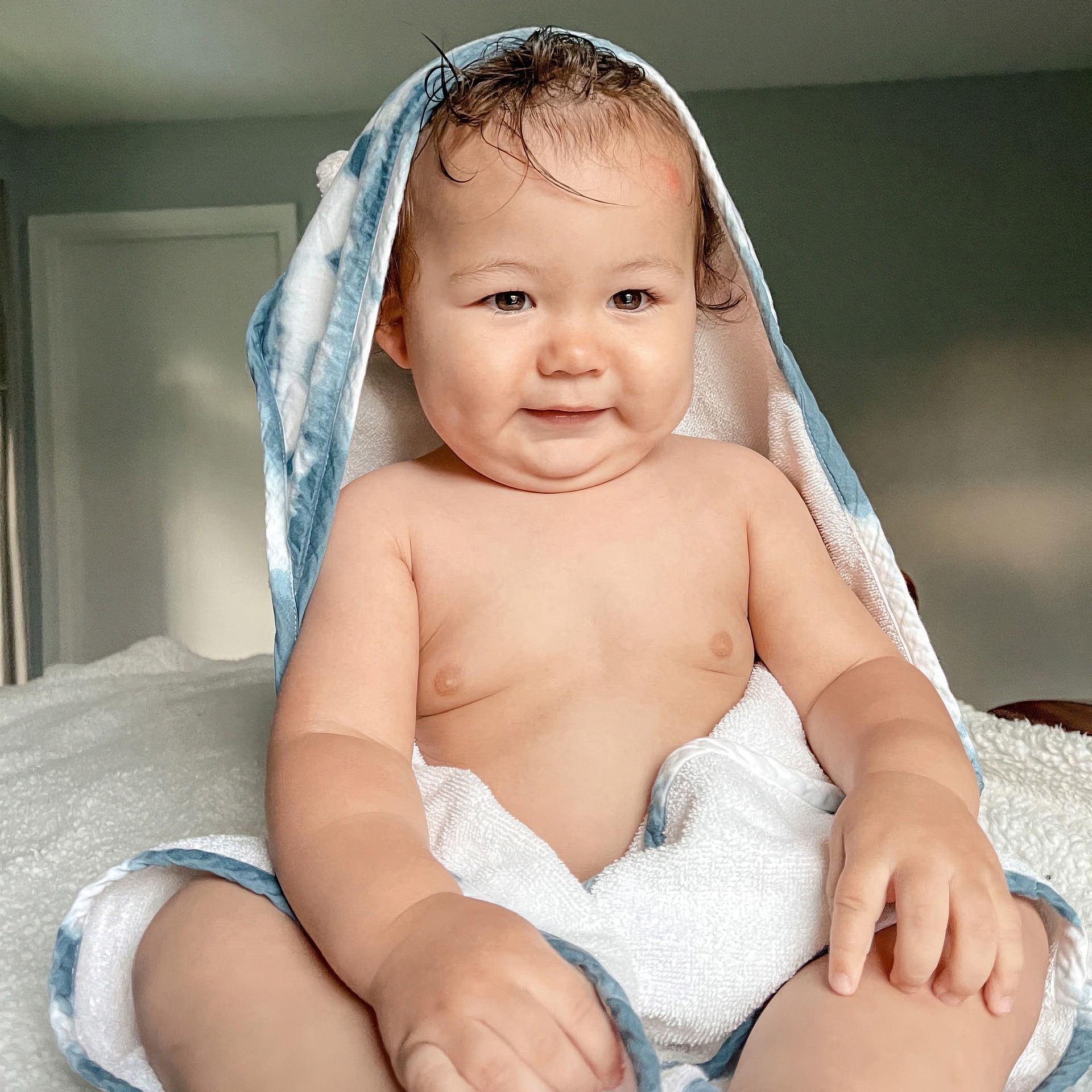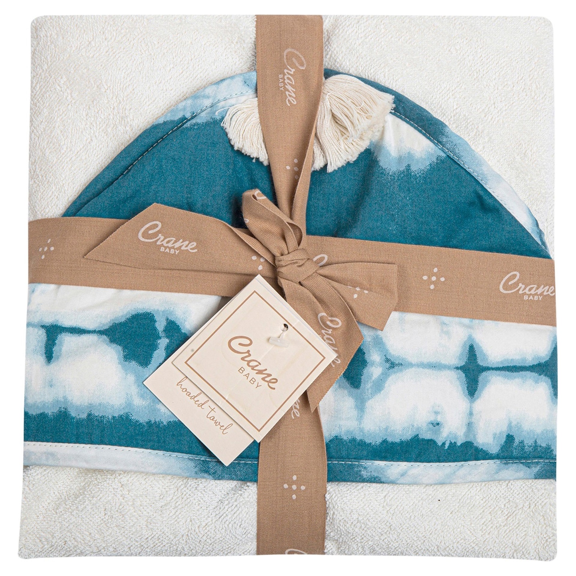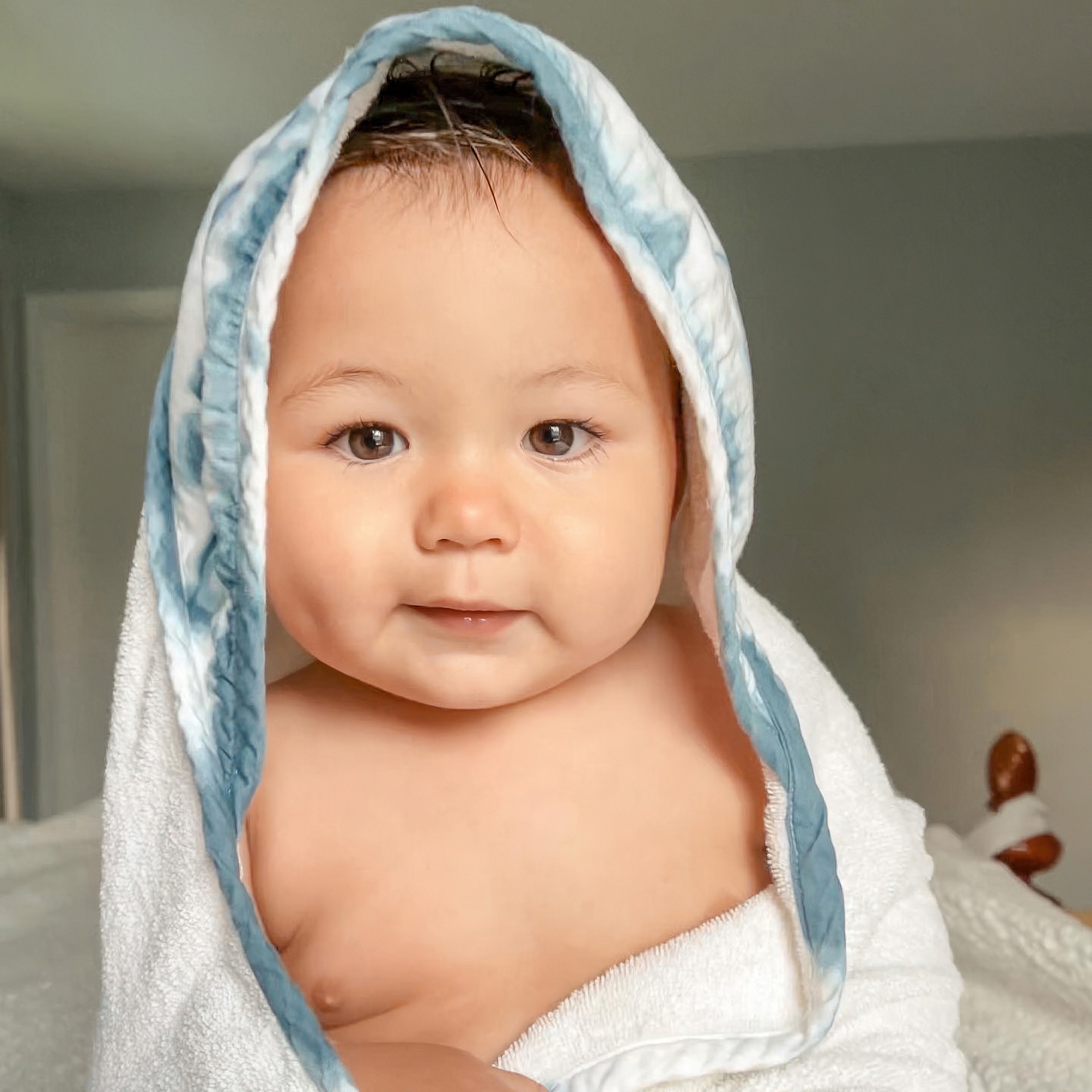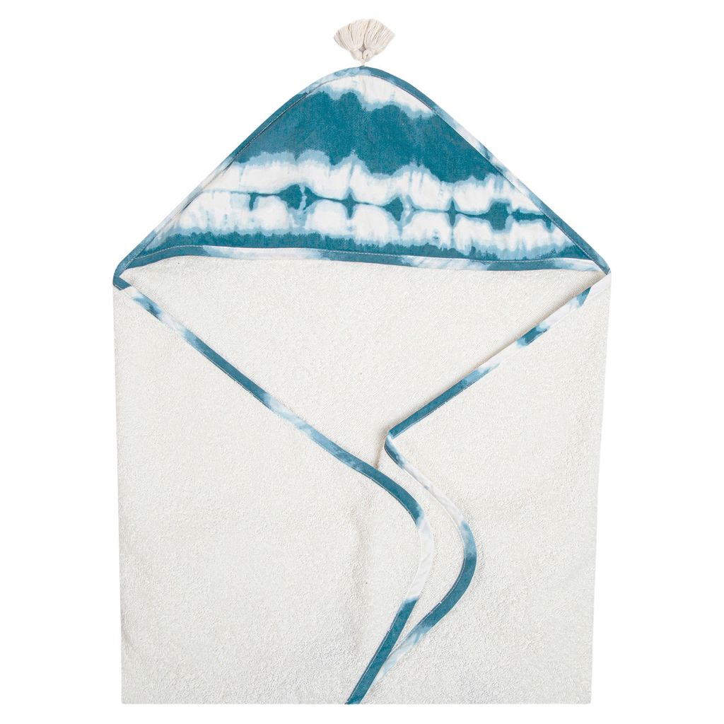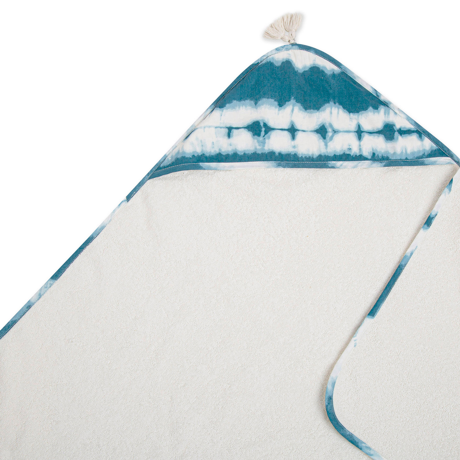 La serviette à capuchon Caspian est chaude, confortable et... magnifique. Cette sortie-de-bain bleu et blanc a du style à revendre.
