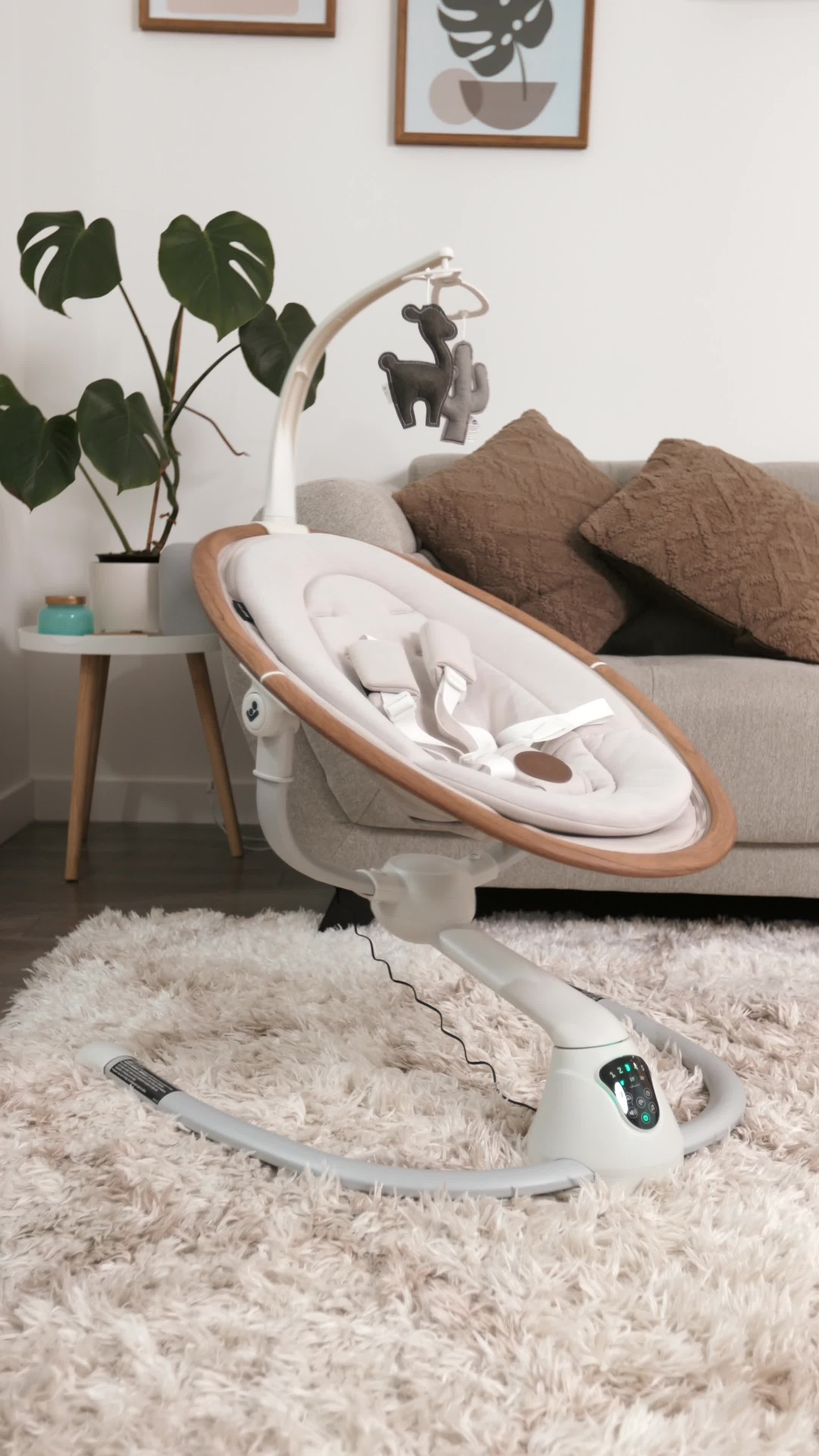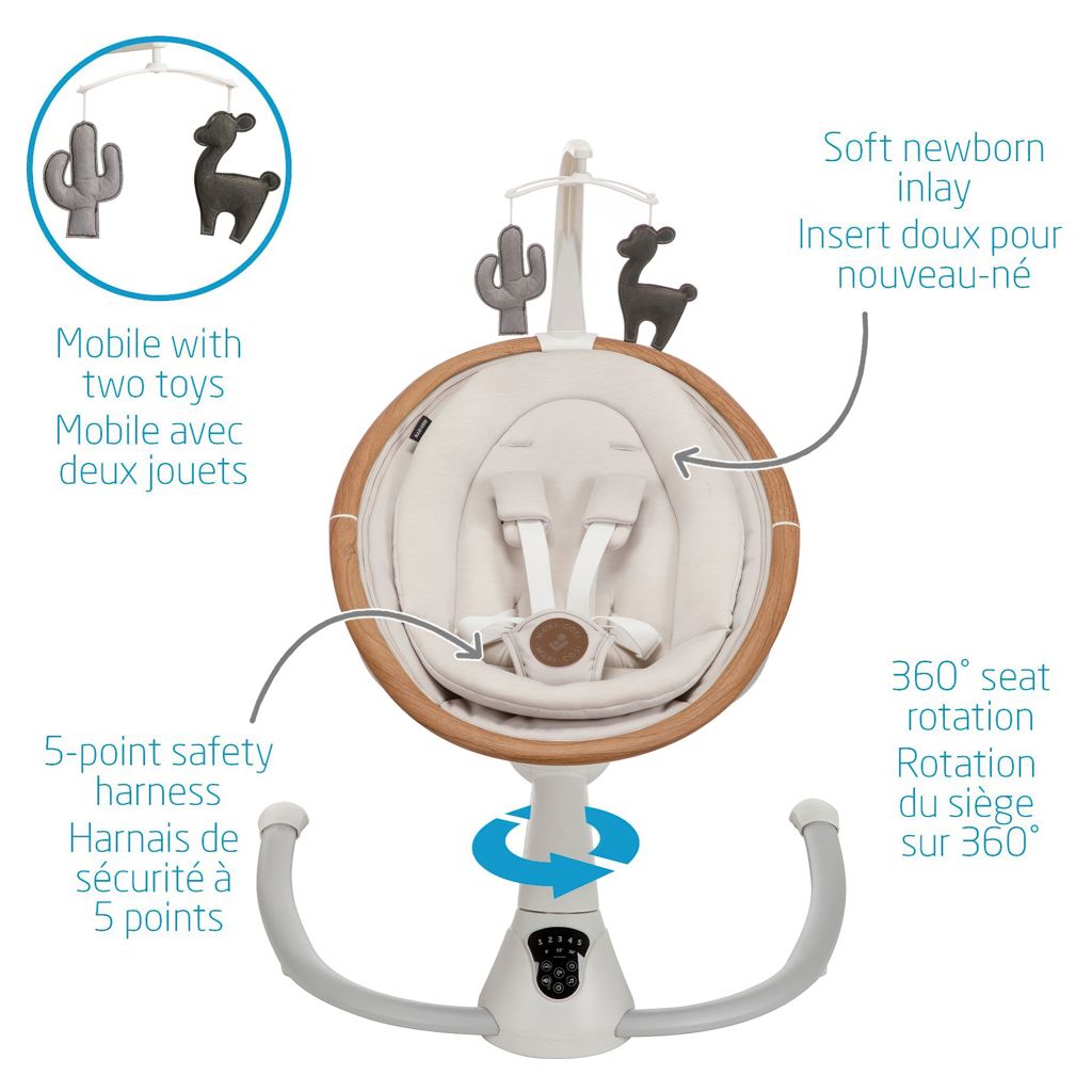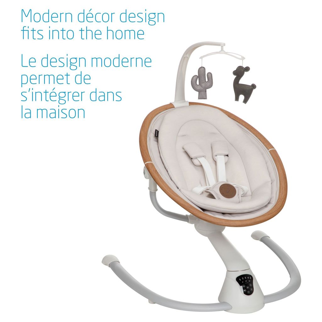 Cette balançoire élégante a la beauté et l'intelligence tout comme vous, elle sait instinctivement quand et comment bercer votre bébé lorsqu'il est agité, grâce au détecteur de mouvement automatique. La Cassia active simplement la balançoire lorsqu'elle reconnait que votre bébé a besoin de plus de confort.