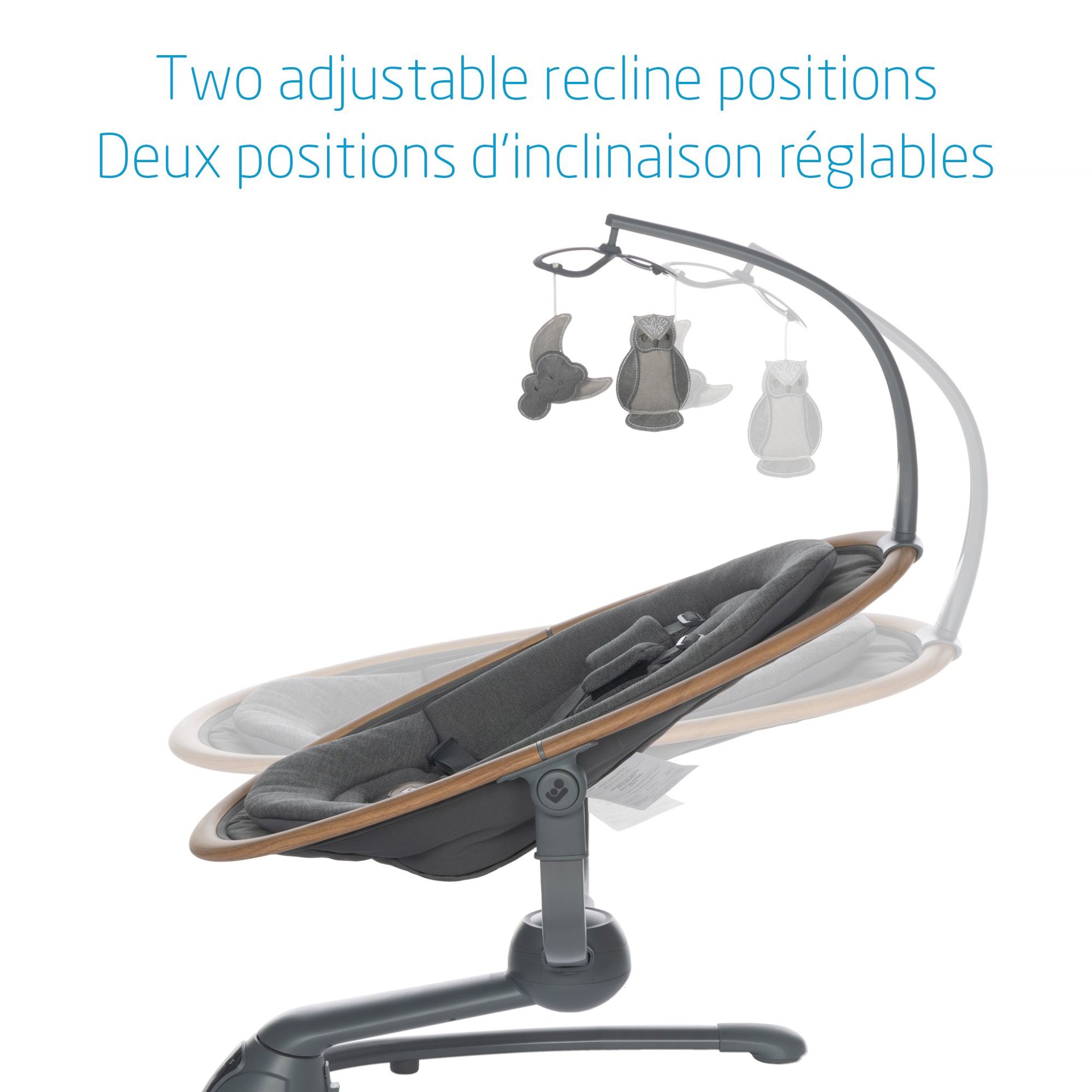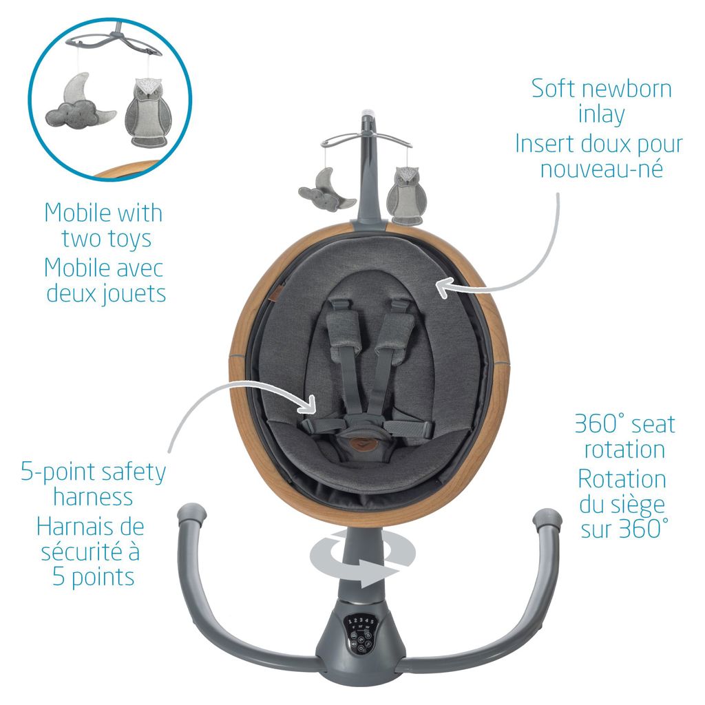 Finalement, Cassia vient avec deux jouets pour donner à votre bébé quelque chose à regarder, deux positions d'inclinaison et un insert pour nouveau-né doux et confortable pour offrir à vous et à votre bébé, l'ultime confort. Maxi-Cosi Cassia se balancer intelligemment avec style.