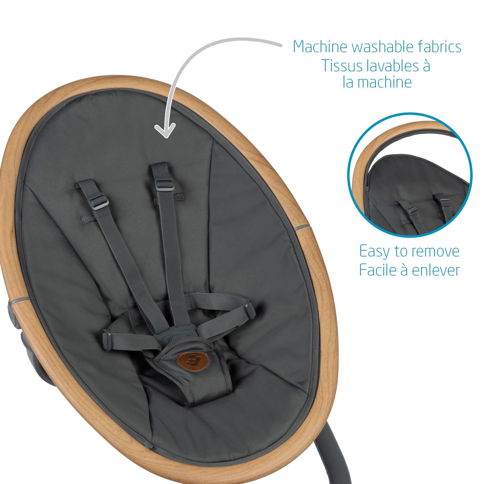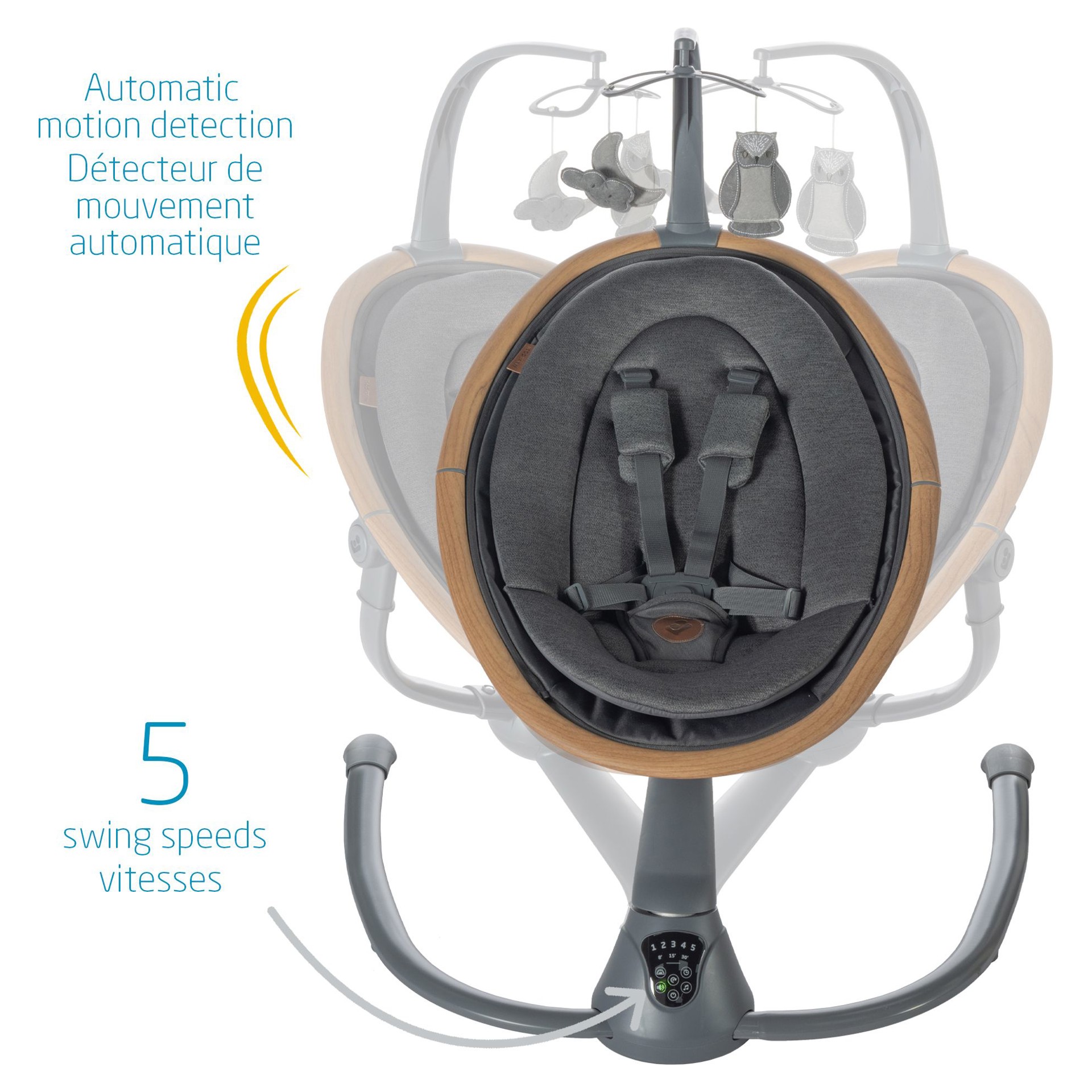 Cette balançoire élégante a la beauté et l'intelligence tout comme vous, elle sait instinctivement quand et comment bercer votre bébé lorsqu'il est agité, grâce au détecteur de mouvement automatique. La Cassia active simplement la balançoire lorsqu'elle reconnait que votre bébé a besoin de plus de confort.