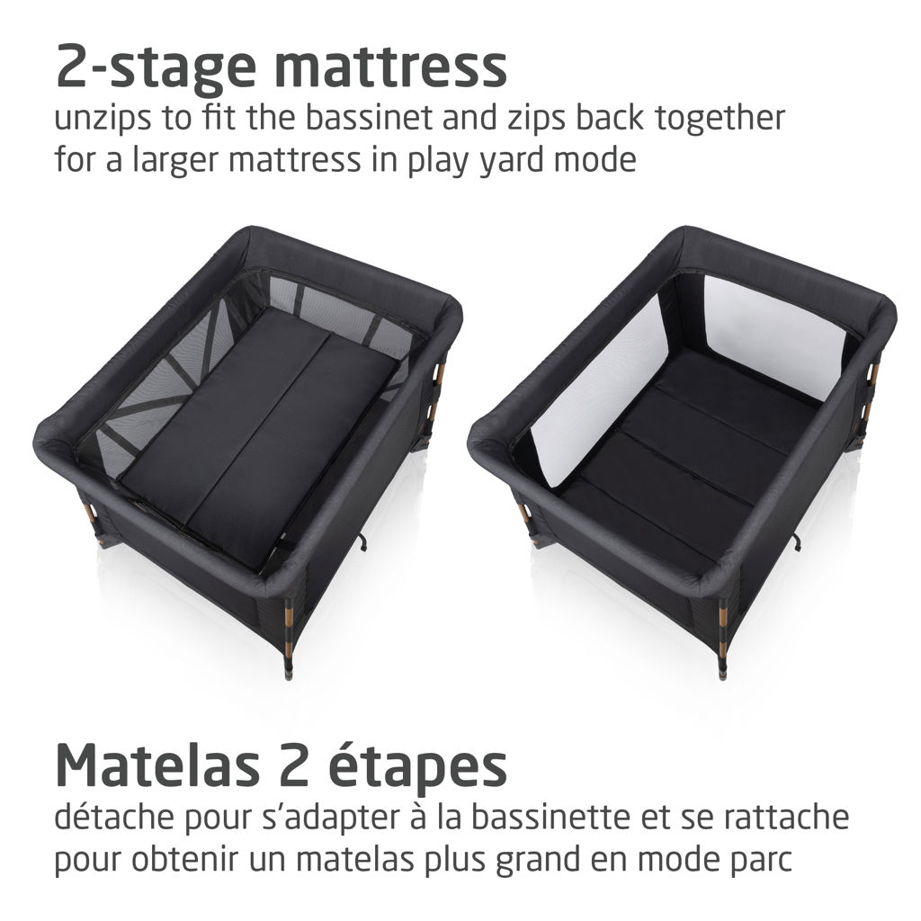 Le Swift est doté d'un matelas unique à 2 niveaux qui se dézippe pour s'adapter parfaitement à la bassinette, offrant un matelas plus petit et plus confortable, idéal pour les nouveau-nés. À mesure que votre bébé grandit, le matelas se referme ensemble pour créer un espace plus grand et super confortable pour le temps de jeu ou une sieste bien méritée.
