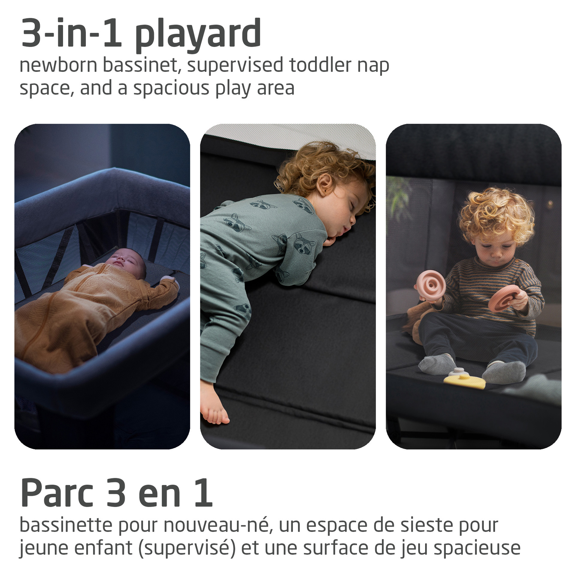 Voici le nouveau Swift. Un parc de voyage 3-en-1 polyvalent et élégant pouvant être utilisé comme bassinette pour nouveau-né, espace pour faire la sieste (supervisé) pour tout-petit et parc robuste et sécuritaire pour nouveau-né jusqu'à tout-petit.