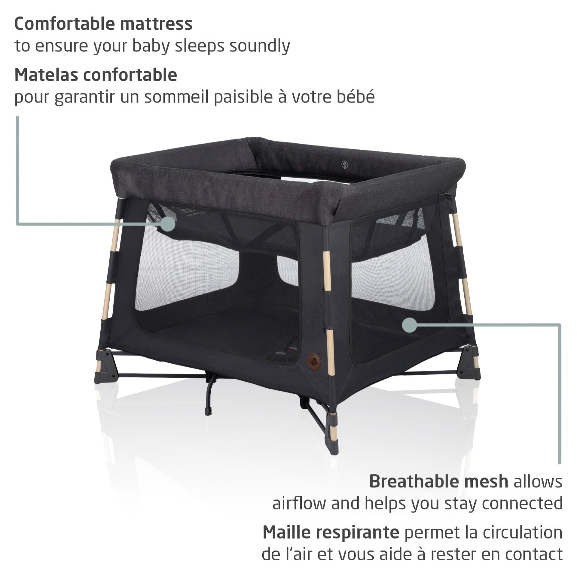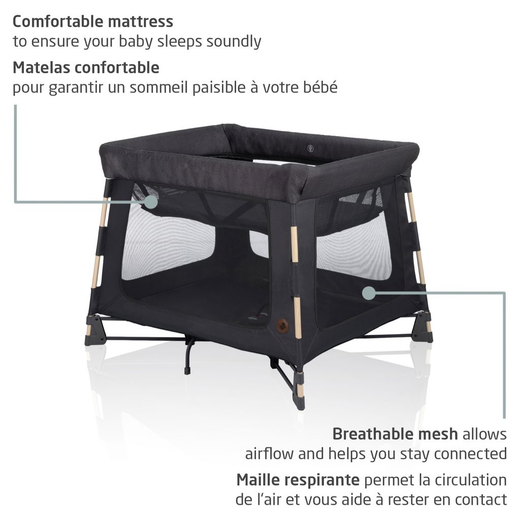 Avec son style épuré et ses matériaux de qualité supérieure, le Swift s'adapte à tous les décors et s'intègre parfaitement à votre intérieur. Les côtés en maille respirante favorisent la circulation de l'air et vous permettent de rester en contact avec votre enfant.