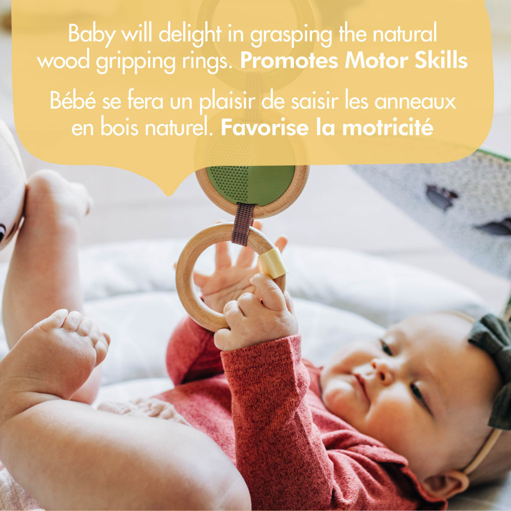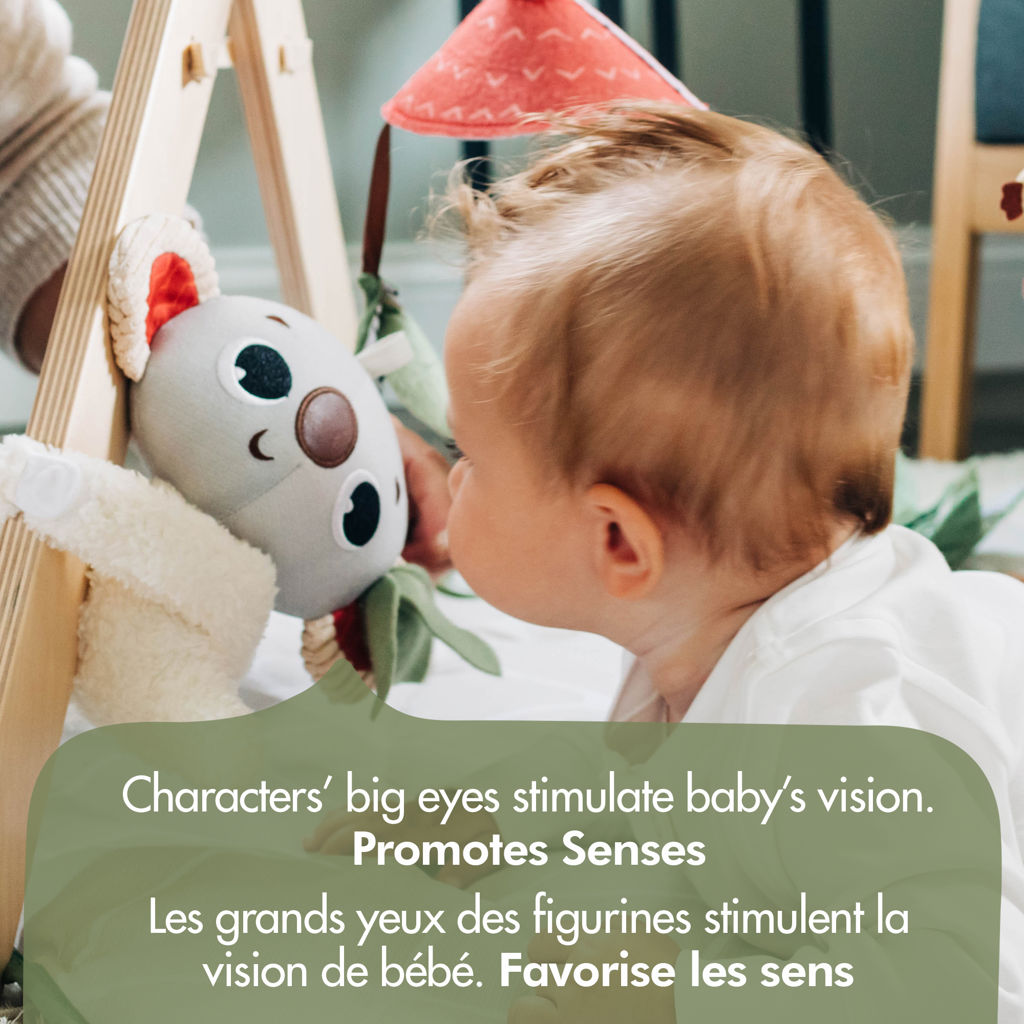 Conçu de manière unique avec une arche en bois autonome qui divertira bébé même en position assise. Ce Gymini de Luxe comprend un adorable koala en peluche détachable, une figurine musicale activée par bébé, une feuille géante plissée, un trio d'anneaux en bois naturel et bien plus encore!