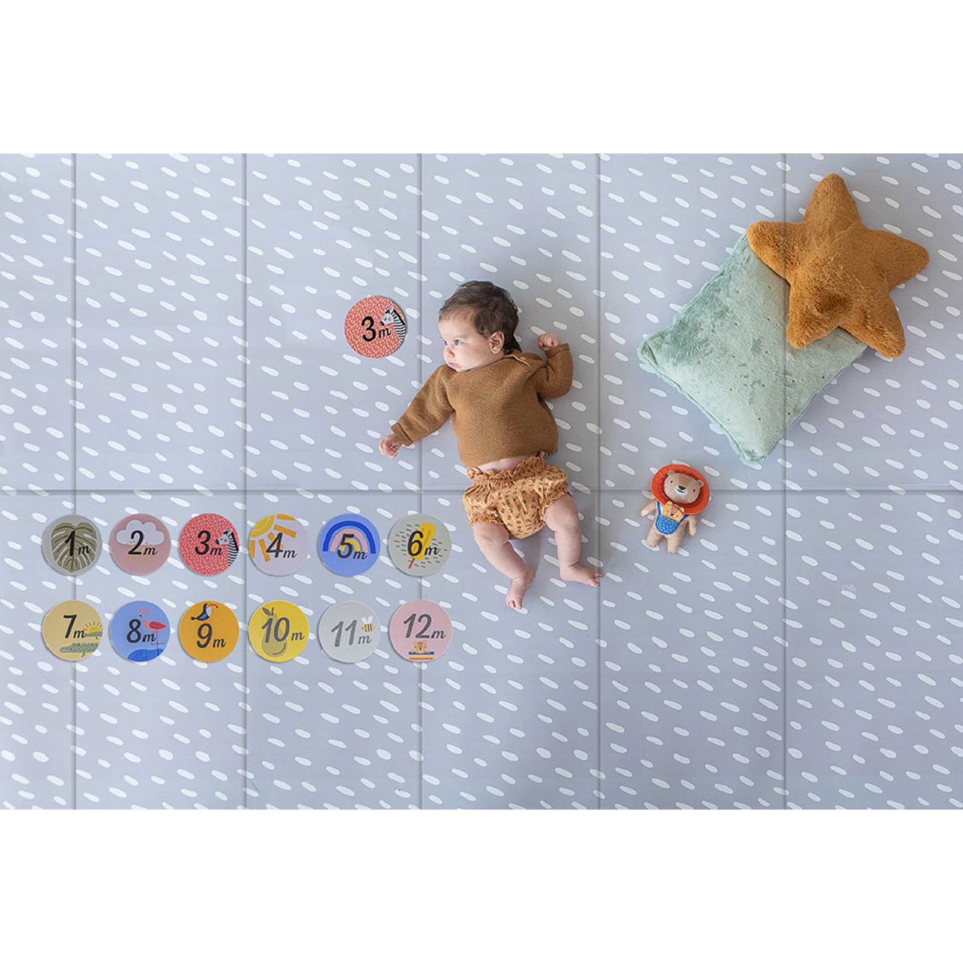 Ce magnifique tapis comprend 6 cartes recto-verso pour les étapes des 12 premiers mois. Capturez chaque moment de la première année de votre bébé.