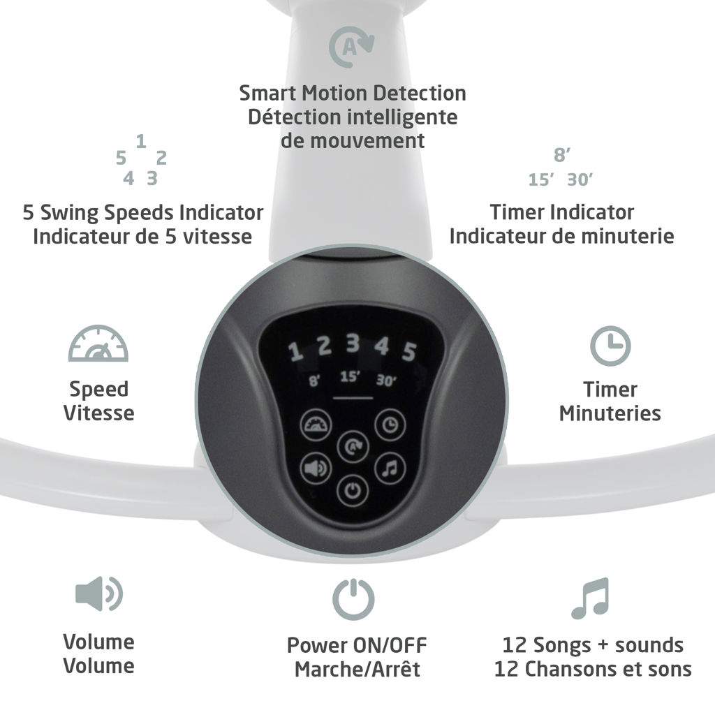 Convenant aux bébés dès la naissance et jusqu'à 20 lb, la Cassia est dotée de la technologie Smart Swing qui s'active automatiquement lorsque votre bébé est agité, offrant un mouvement de bercement apaisant pour le réconforter.