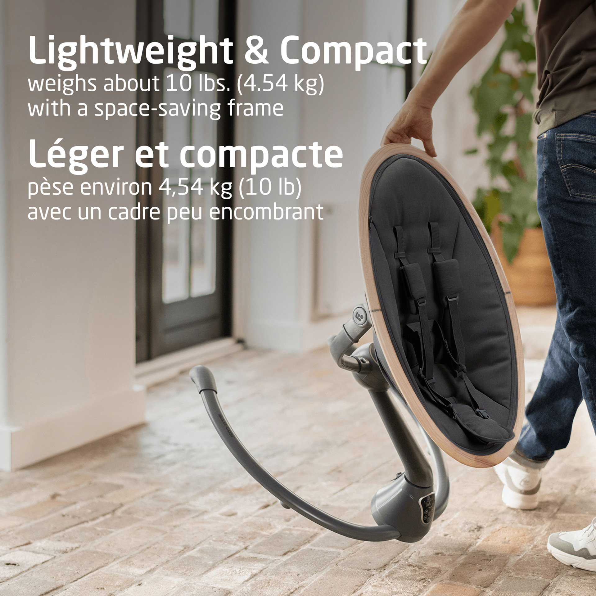 Que vous soyez dans le salon ou au bureau, la rotation à 360° vous permet de maintenir un contact visuel avec votre bébé. Pesant environ 10 lbs (4,54 kg), la Cassia est facile à déplacer et convient parfaitement aux petits espaces, grâce à son cadre peu encombrant.