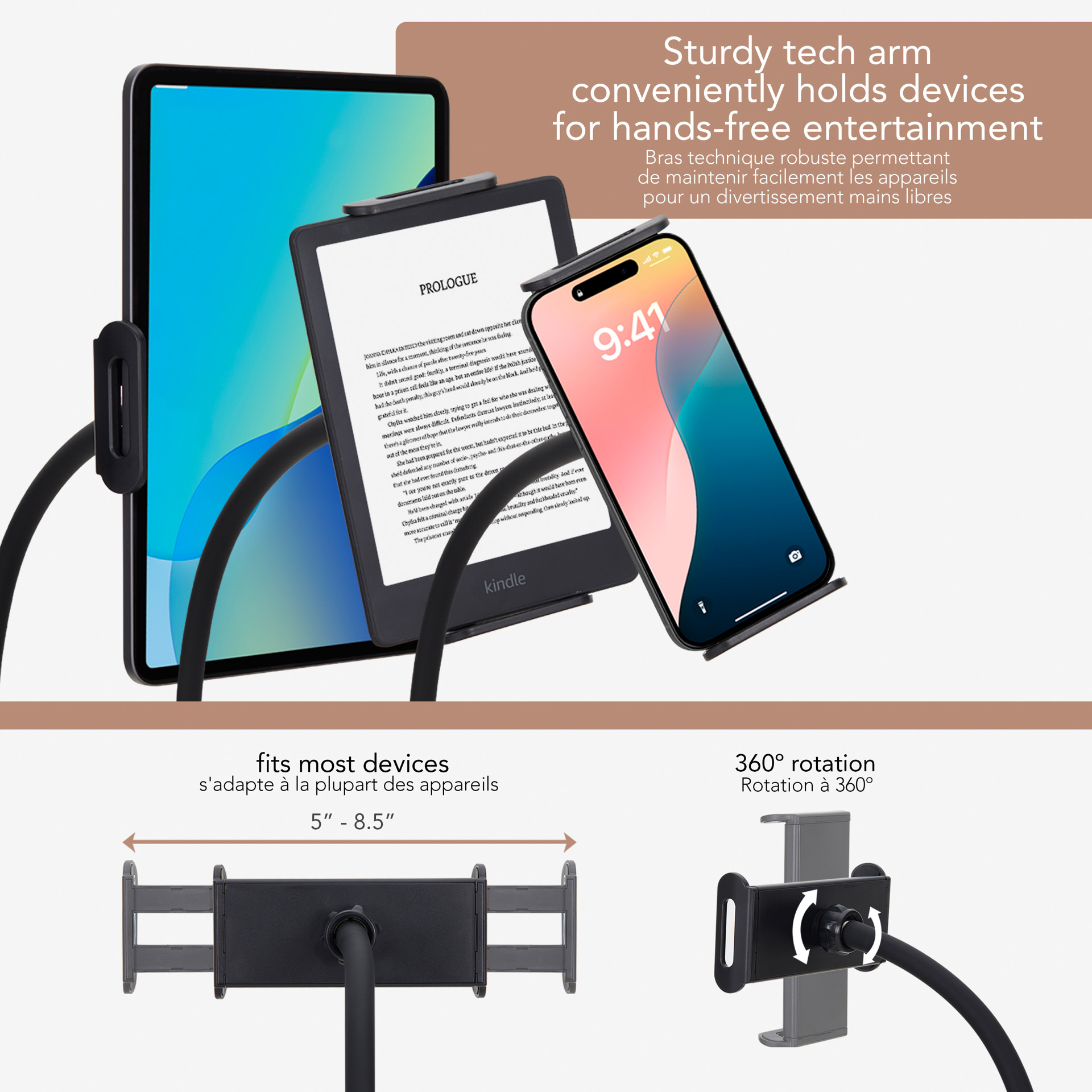 Le bras flexible s'ajuste sans effort, vous offrant l'angle parfait pour vous détendre dans n'importe quelle direction.