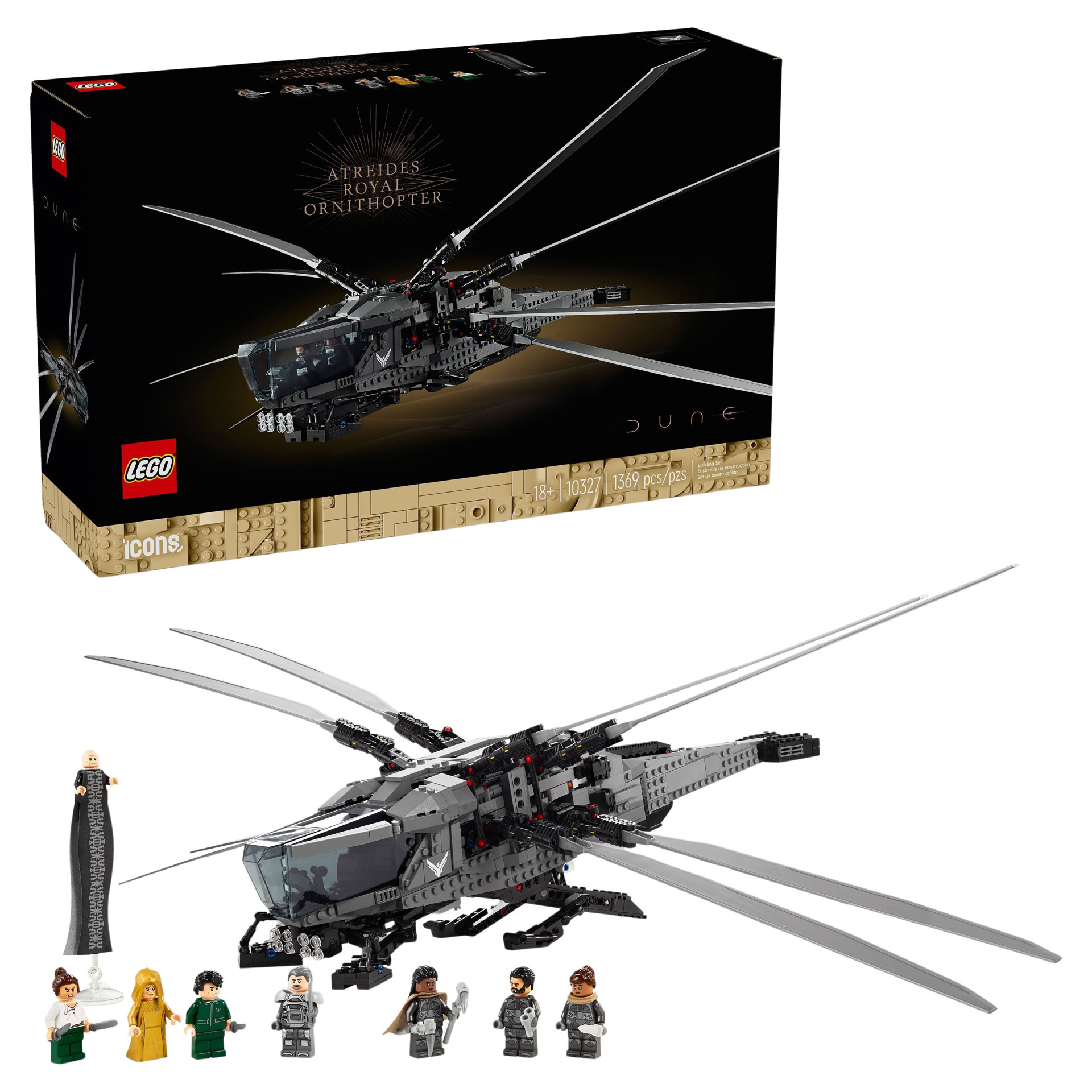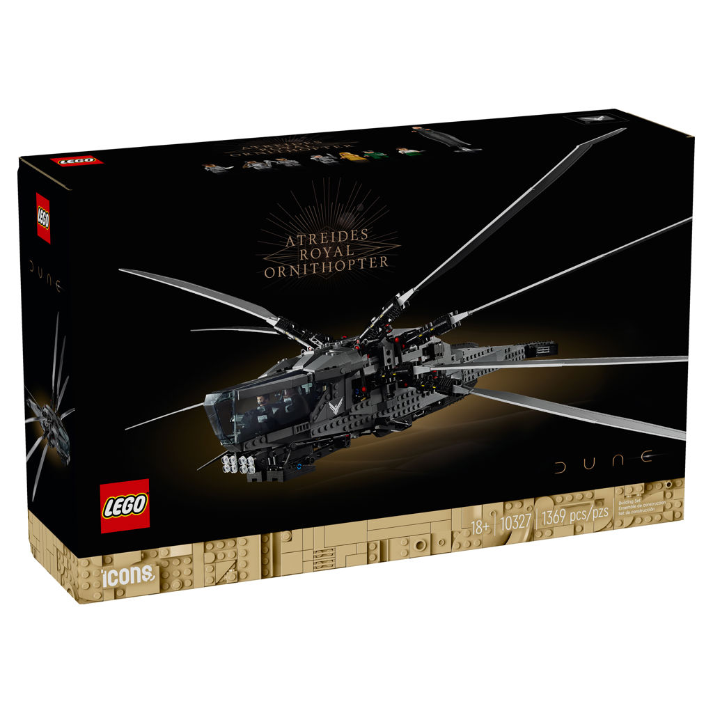 • Qu'y a-t-il dans la boîte ? – Tout ce dont vous avez besoin pour créer une réplique LEGO® de l’avion Dune Atreides Royal Ornithopter avec des ailes pliables et mobiles et un train d’atterrissage déployable, ainsi que 8 figurines du film.