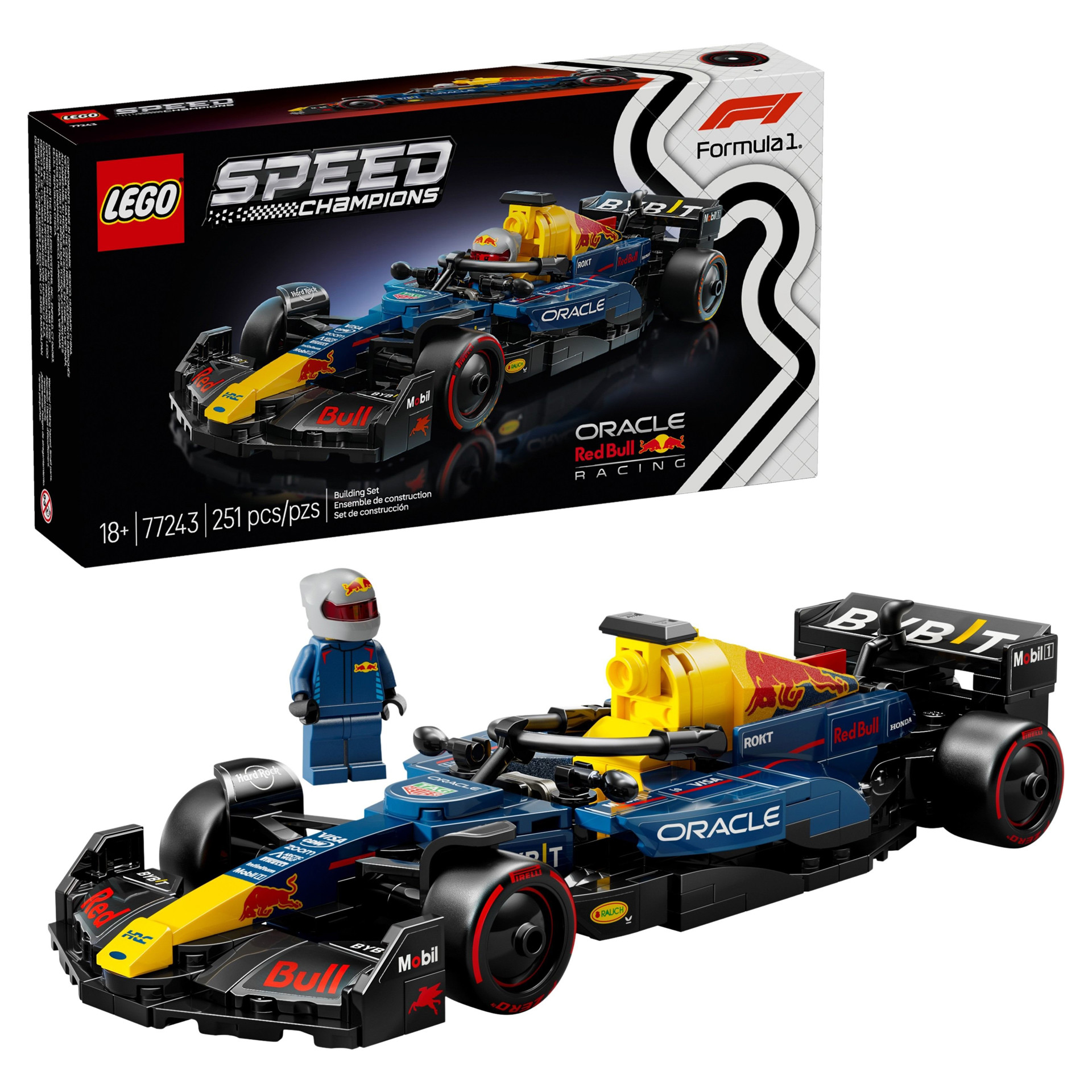 • Figurine de F1® – L’ensemble comprend une figurine de pilote de F1 portant une tenue Red Bull et un casque à placer dans l’habitacle de la voiture de course F1.
