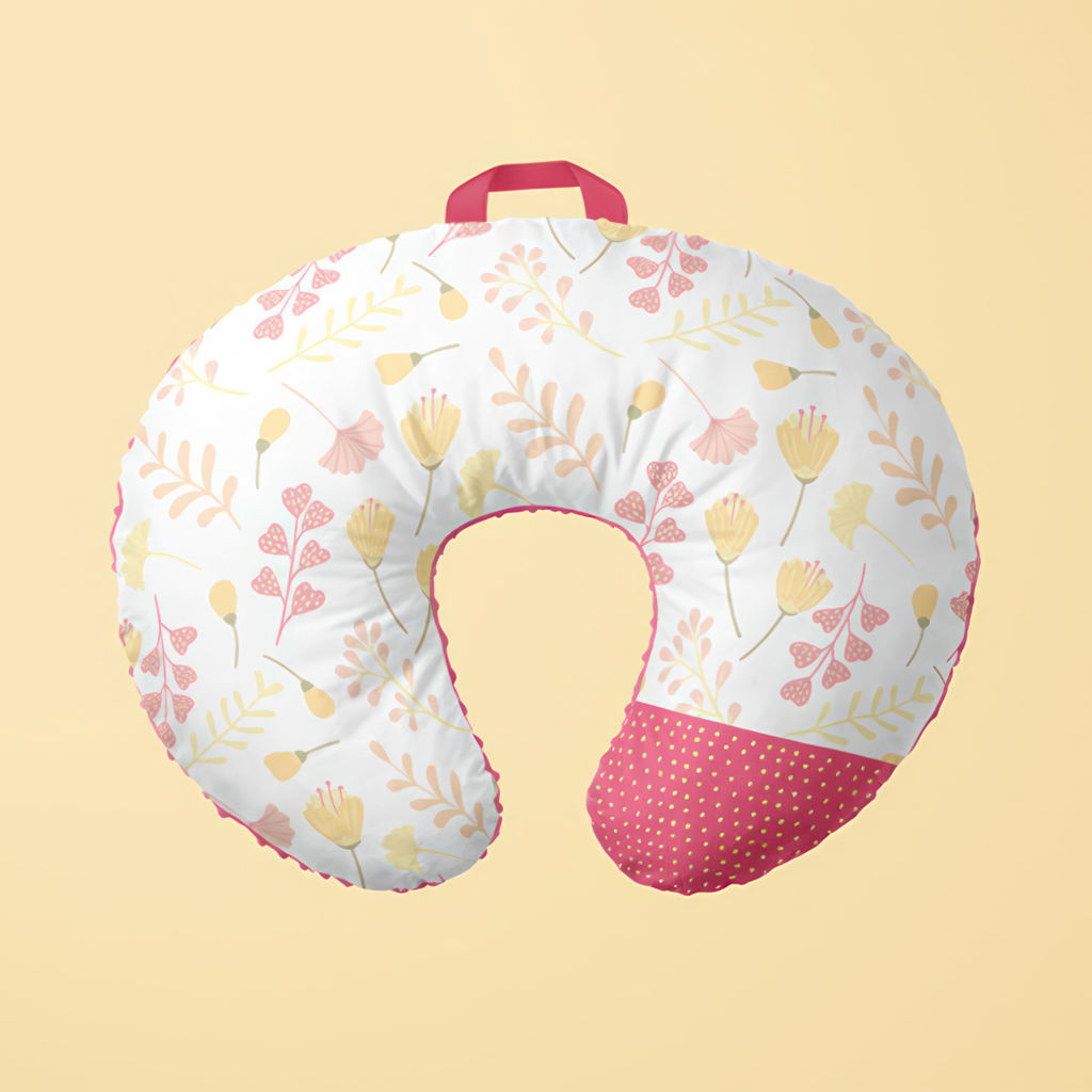 Coussin d'allaitement sous le thème SOURIS MIGNONNE , fabriqué au QUÉBEC en tissu écologique muni d'une ganse pour le transport, pochette et fermeture éclaire, déhoussable et lavable
