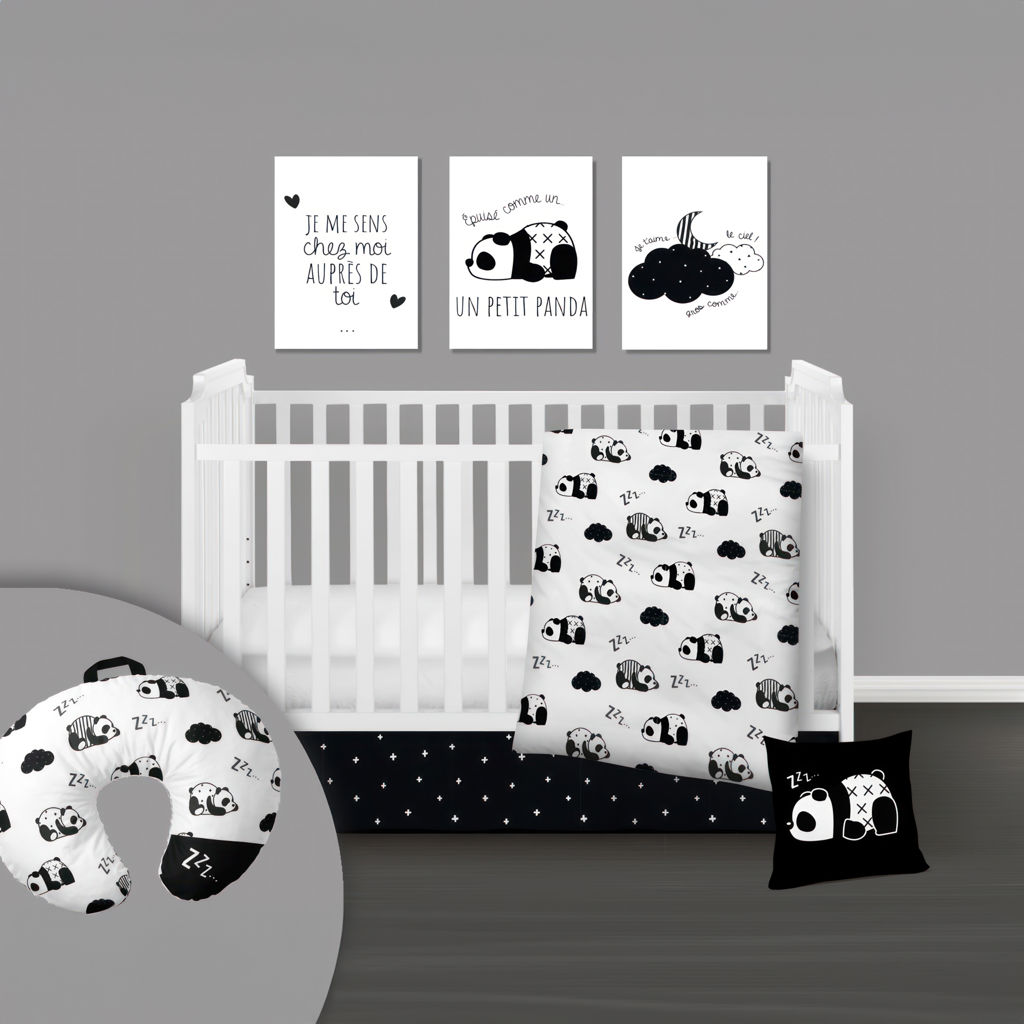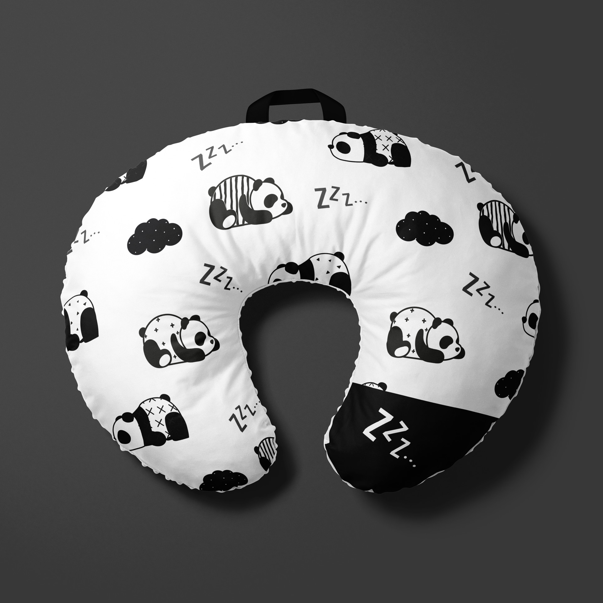 Coussin d'allaitement sous le thème BÉBÉ PANDA fabriqué au QUÉBEC en tissu écologique muni d'une ganse pour le transport, pochette et fermeture éclaire, déhoussable et lavable