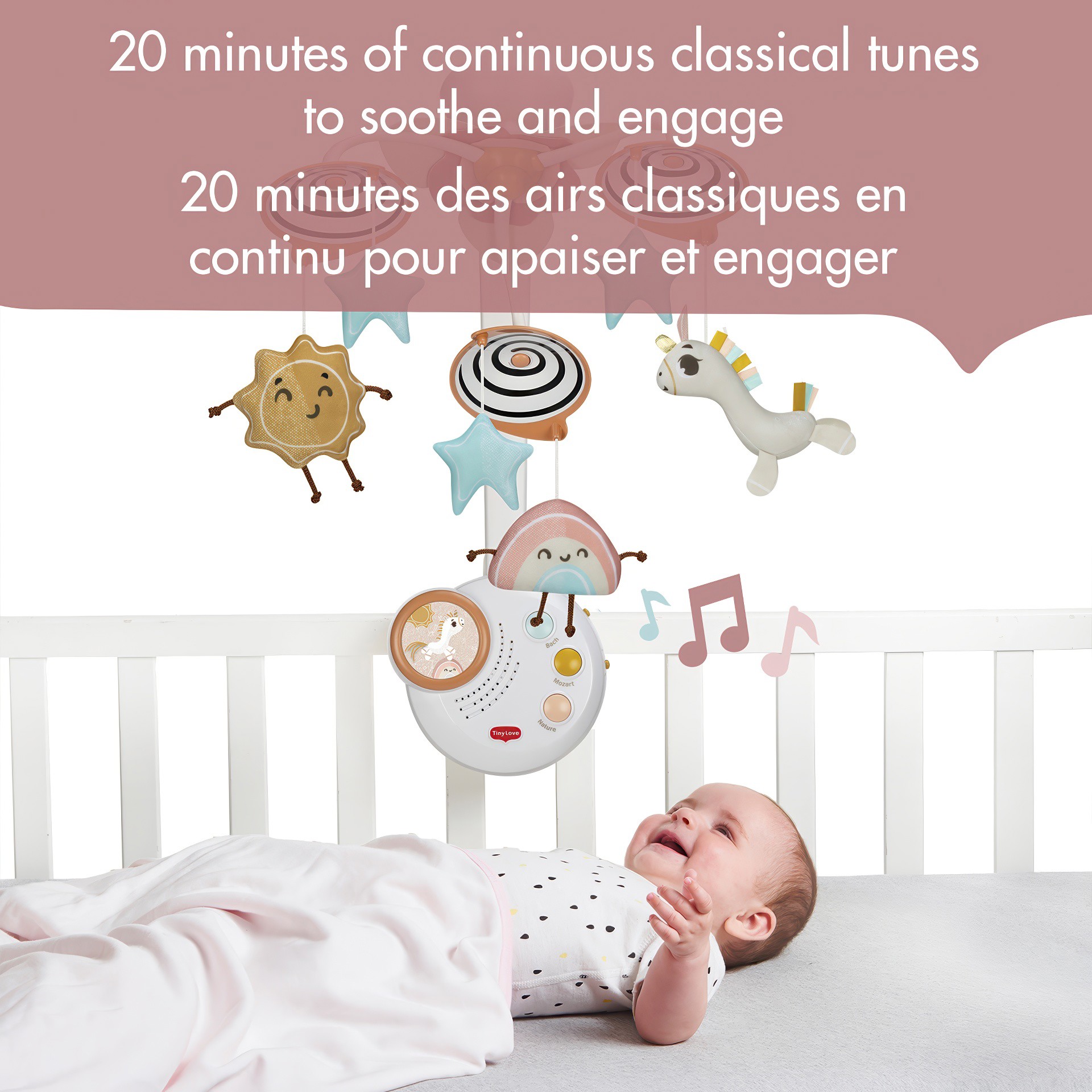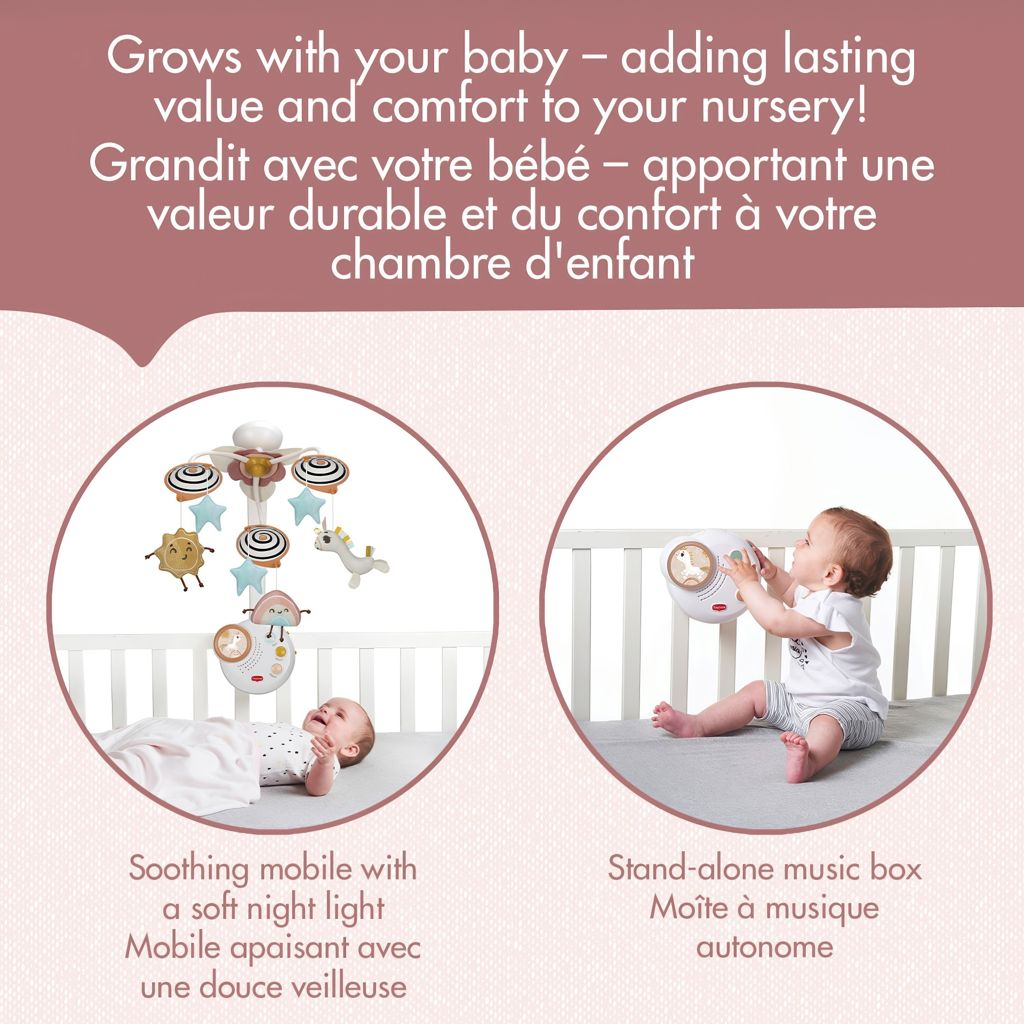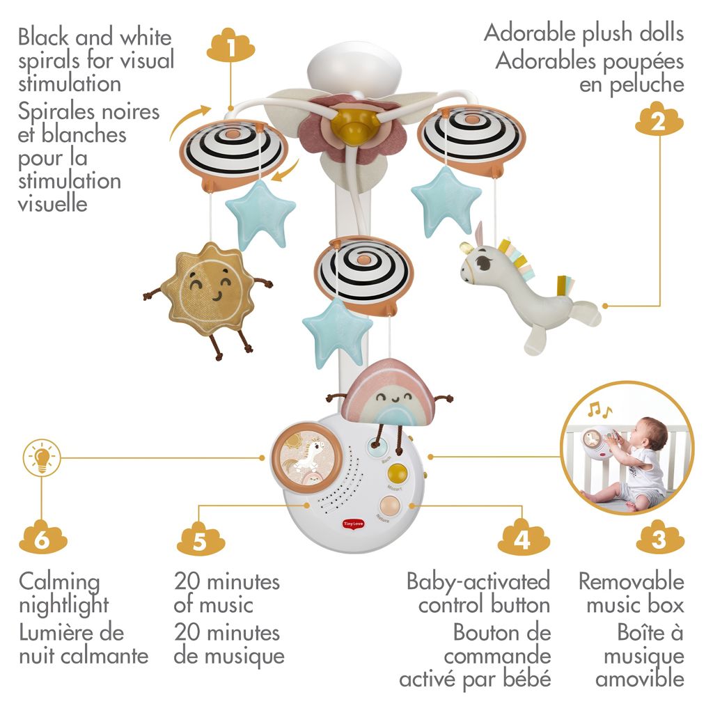 Le Mobile classique Unicorn Wonderlands de Tiny Love réconforte les bébés avec une musique douce, des lumières tamisées et des poupées en peluche magiques. Avec 20 minutes de musique classique, ce mobile enchanteur aide à apaiser et à divertir, tandis que les poupées en peluche qui tournent favorisent l'apprentissage du langage chez les bébés qui gazouillent et babillent.