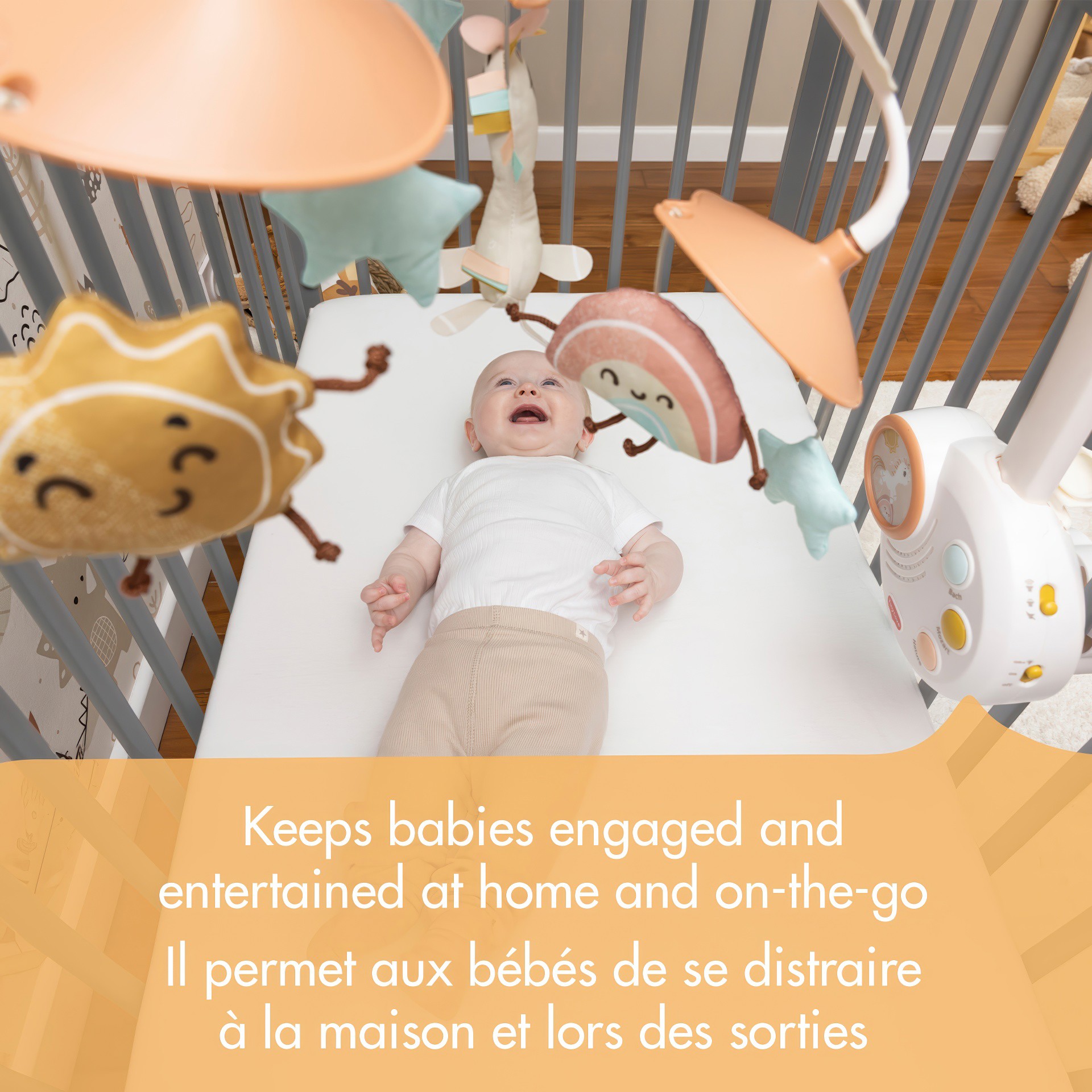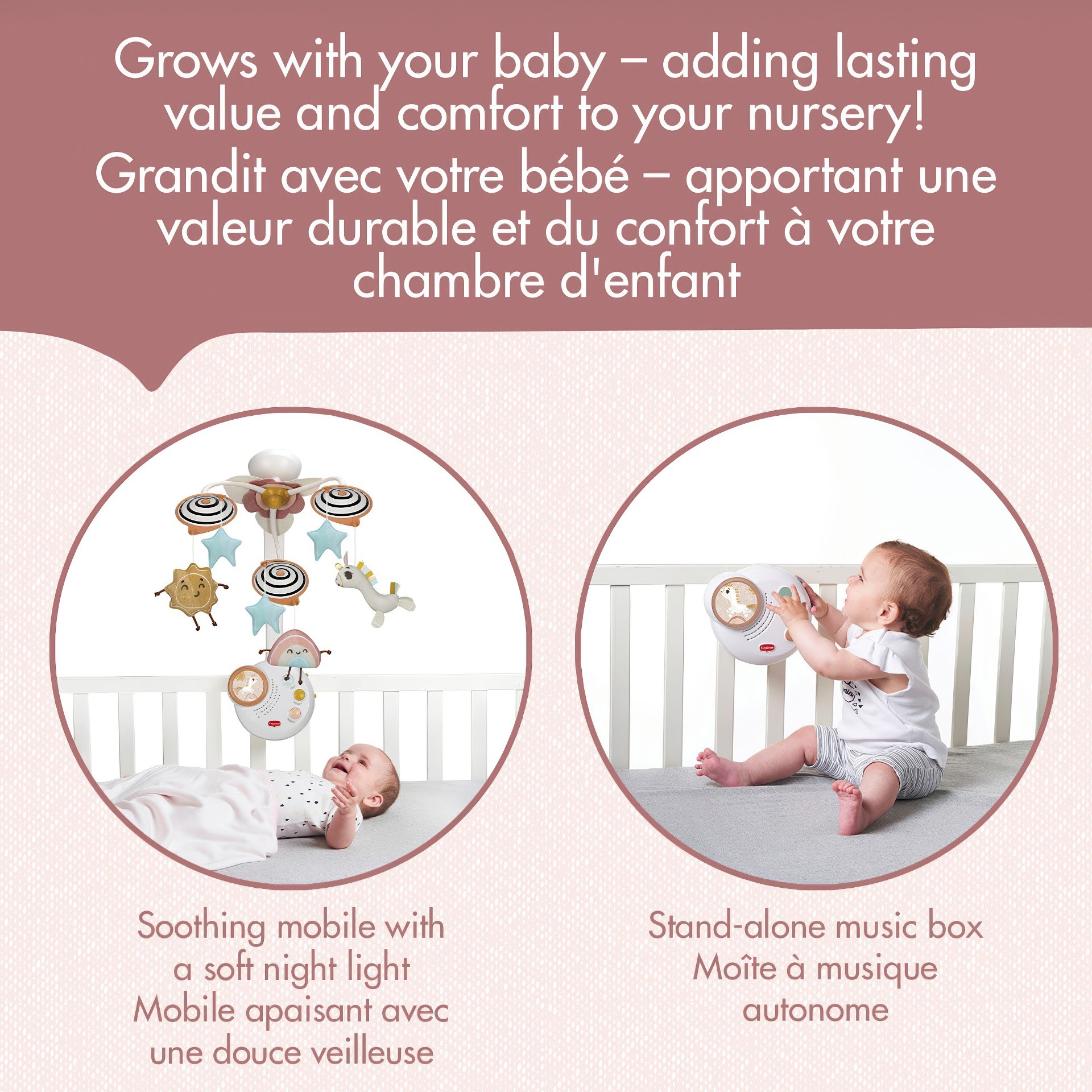 Avec ses spirales noires et blanches qui stimulent la vision dès le premier jour, ce mobile grandit avec votre bébé, se transformant de mobile musical pour les nouveau-nés en boîte à musique autonome pour les bébés plus âgés, apportant une valeur durable et du confort à votre chambre d'enfant.