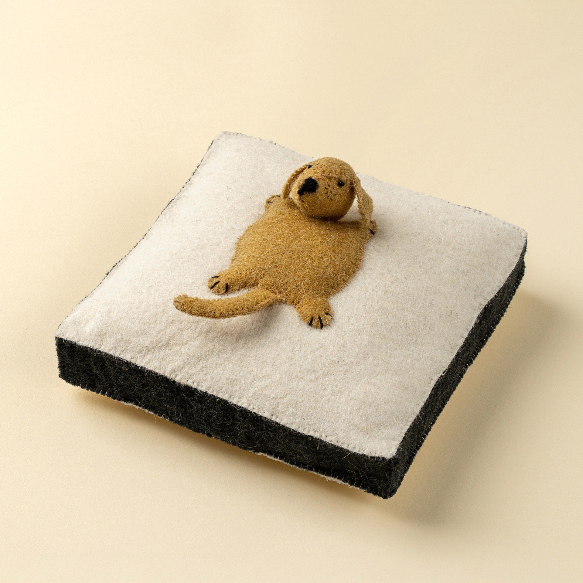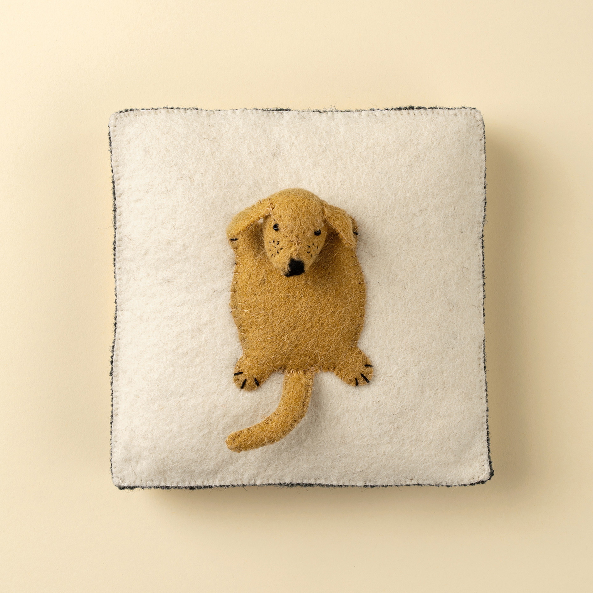 Fabriquée à la main par des artisanes en Inde à partir de matériaux durables, cette plaque met en scène un chien en feutre doré aux oreilles tombantes, agrémenté de détails cousus qui lui donnent vie. Chaque pièce est une petite oeuvre d'art, confectionnée avec soin et pleine de charme.
