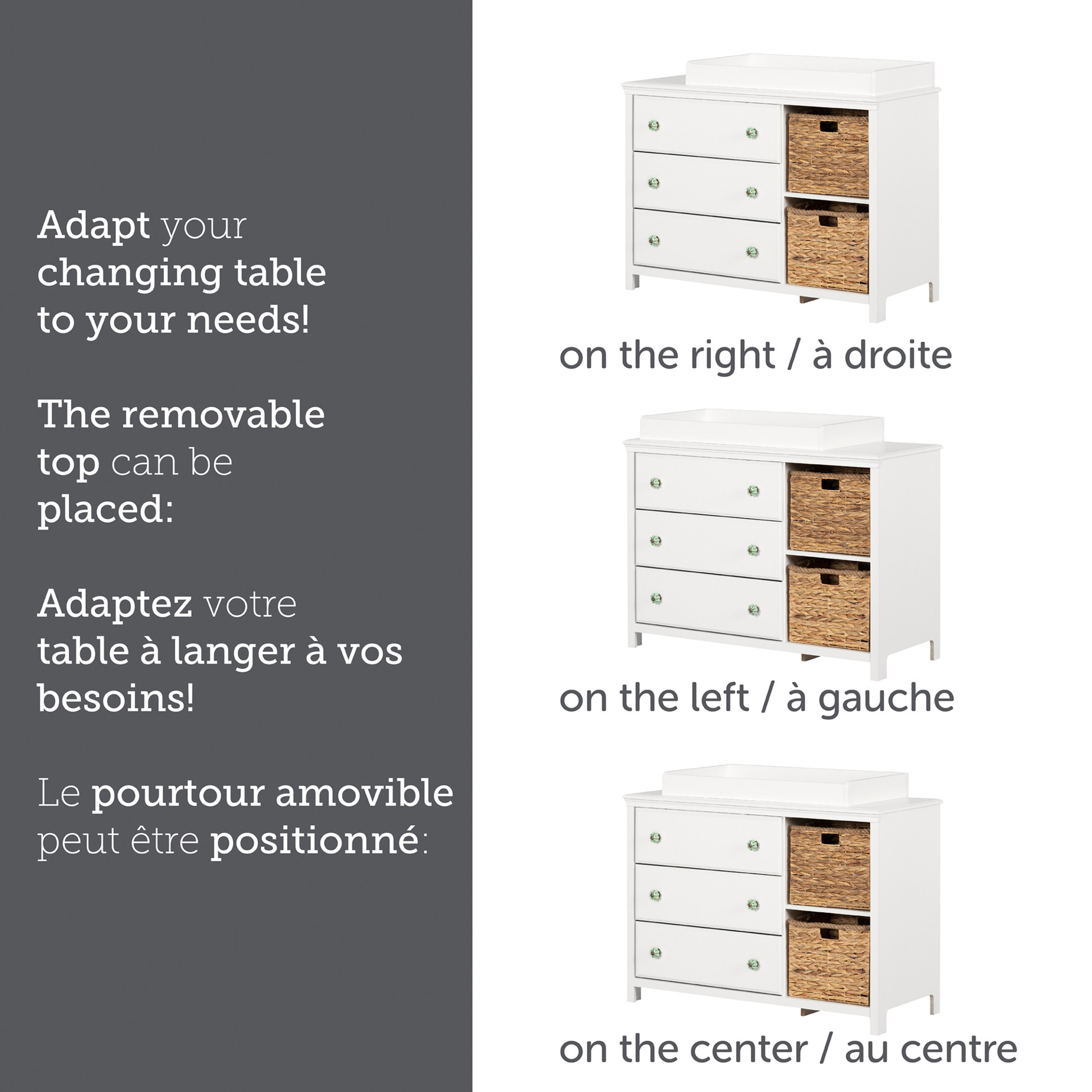 SUFFISAMMENT DE RANGEMENT: actuellement, vous avez probablement déjà tout plein d’accessoires et de vêtements pour bébé. Ne vous en faites pas, cette table à langer contient énormément de rangement. On y retrouve trois tiroirs sur coulisses en métal pour y organiser tous vos vêtements, et deux magnifiques paniers pour ranger vos essentiels, comme les couches et les jouets.