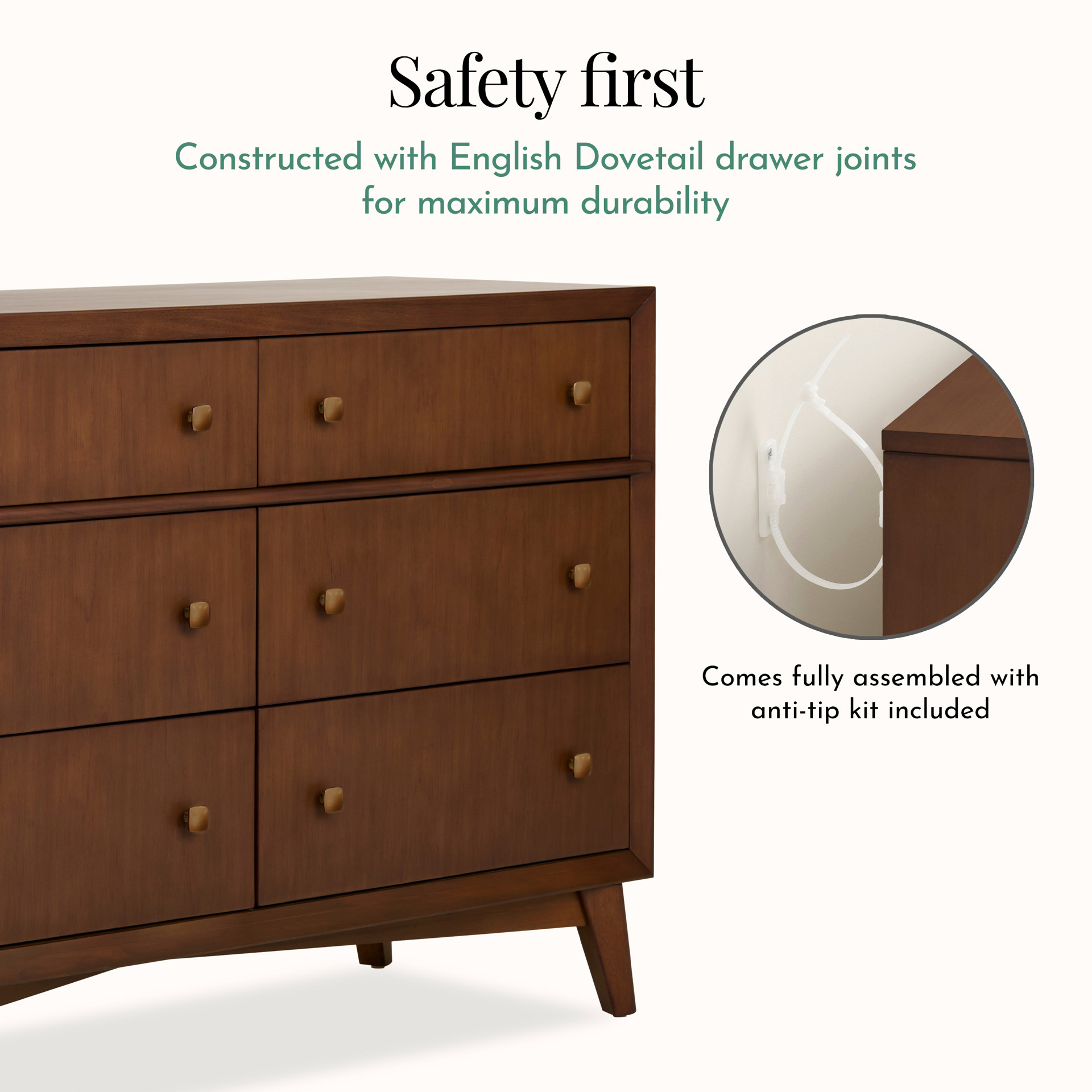 Fabriquée en peuplier massif et en placage de qualité supérieure avec une luxueuse finition texturée, chaque tiroir est doté d'assemblages à queue d'aronde et d'un système de fermeture amortie.