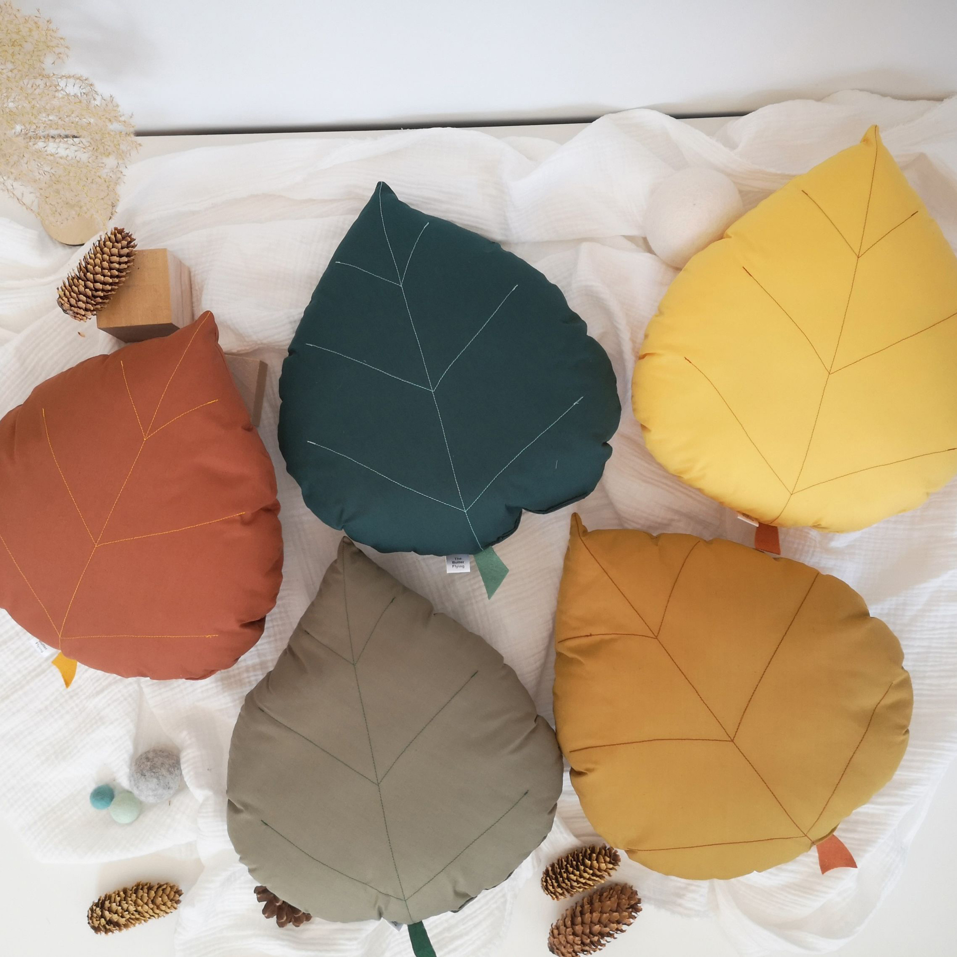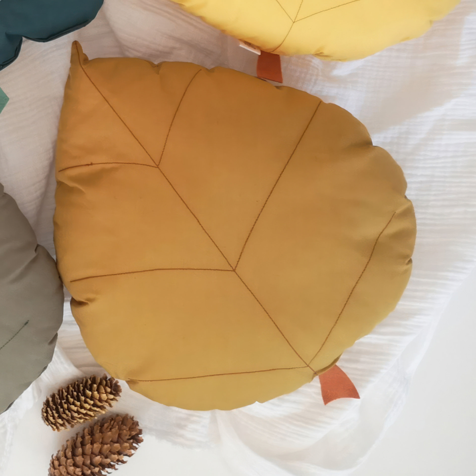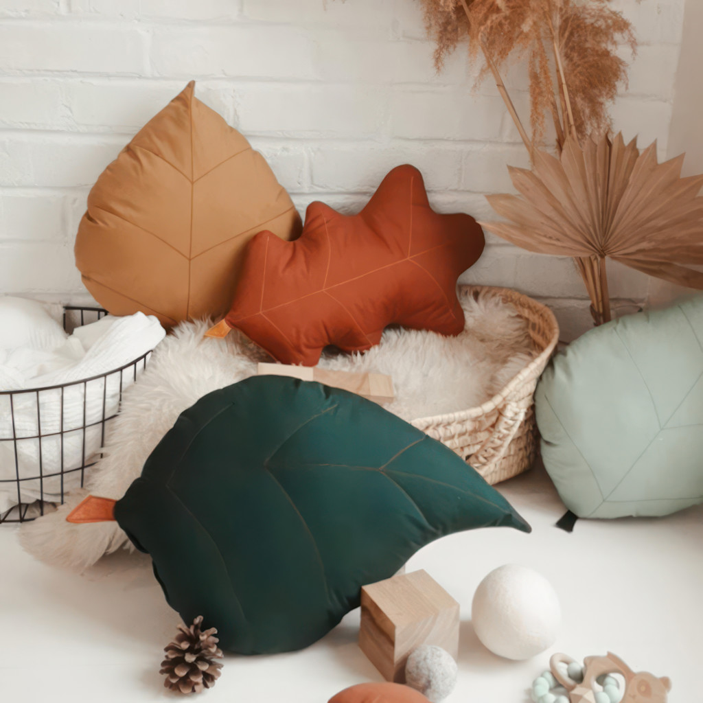 Coussin décoratif en forme de feuille de feuille de bouleau inspiré de la forêt pour une décoration de chambre bébé inspirée par la nature.