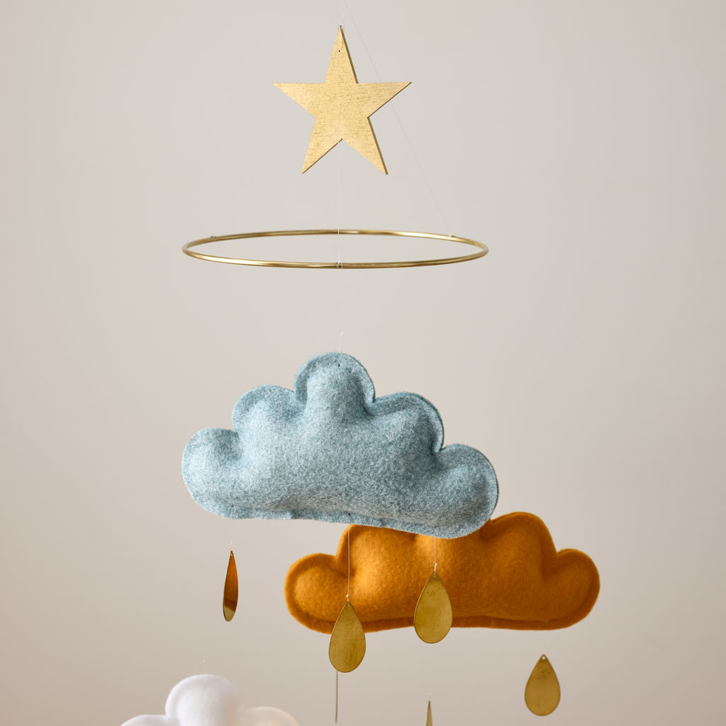 Nuages vert sauge, ocre, blanc et gouttes de pluie dorées. Ce mobile nuage en feutrine aux gouttes dorées est un cadeau de naissance idéal.