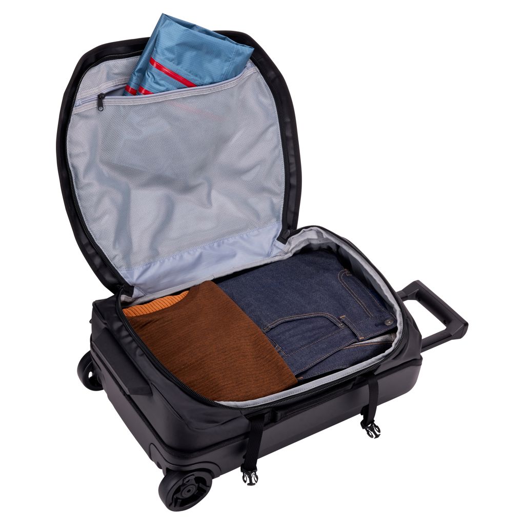 La grande pochette en maille intérieure permet de séparer le linge propre du linge sale, et les sangles de compression extérieures permettent d’ajuster le sac à la charge.